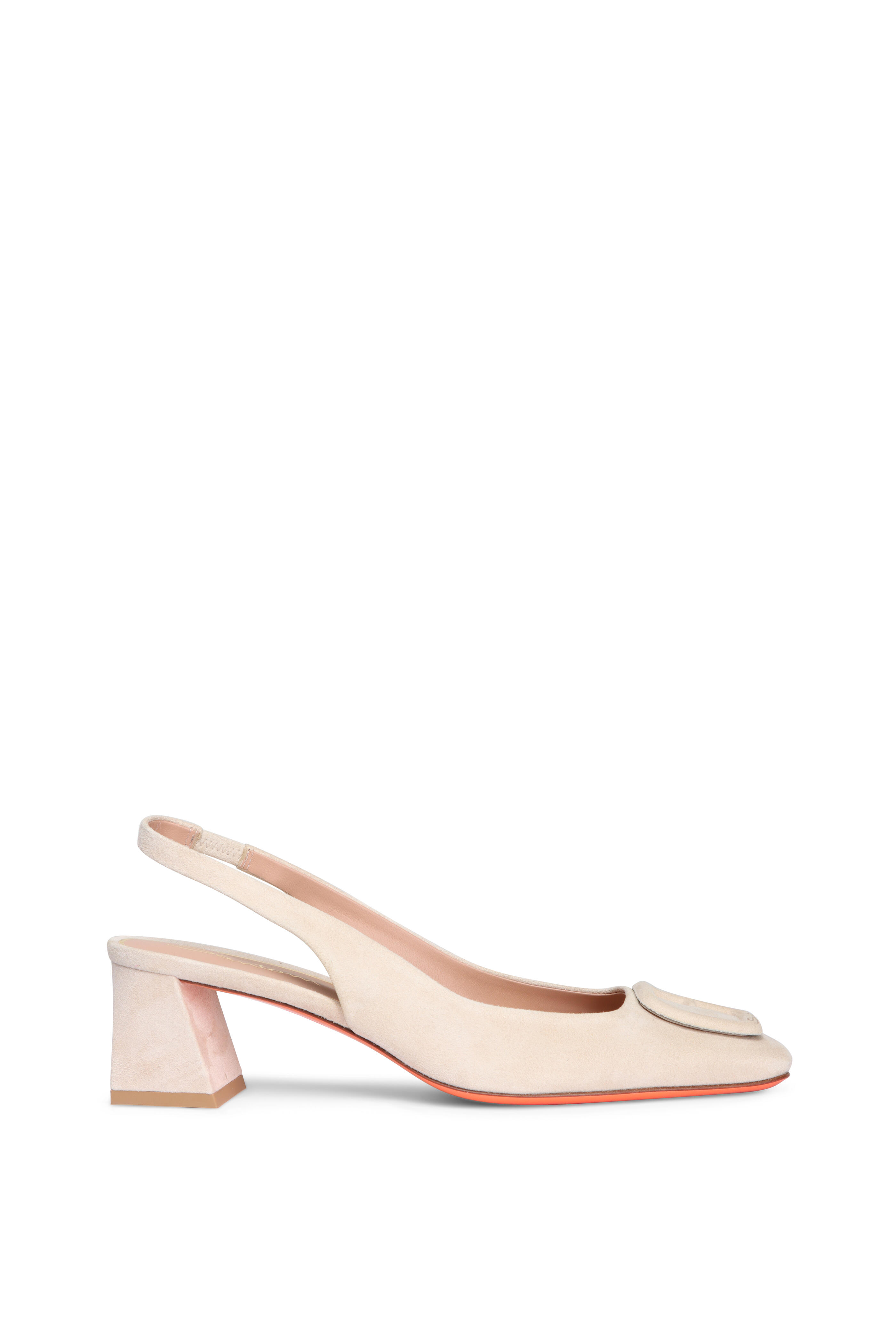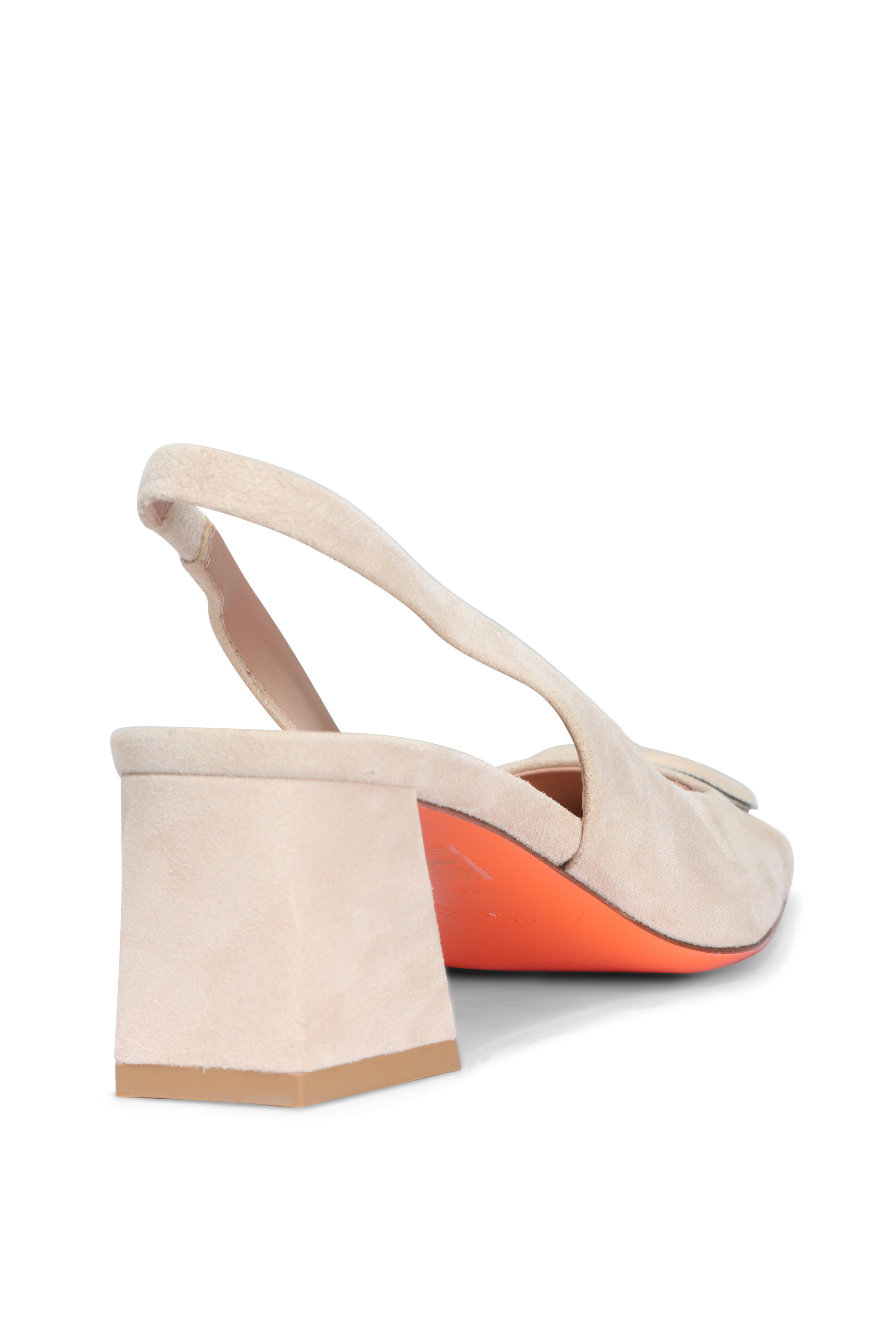 Suede upper. Leather lining. Signature orange leather sole. Round, square toe. Elasticated slingback strap. Logo buckle on vamp. Mid block heel. Made in Italy. Heel measurement: 50mm.