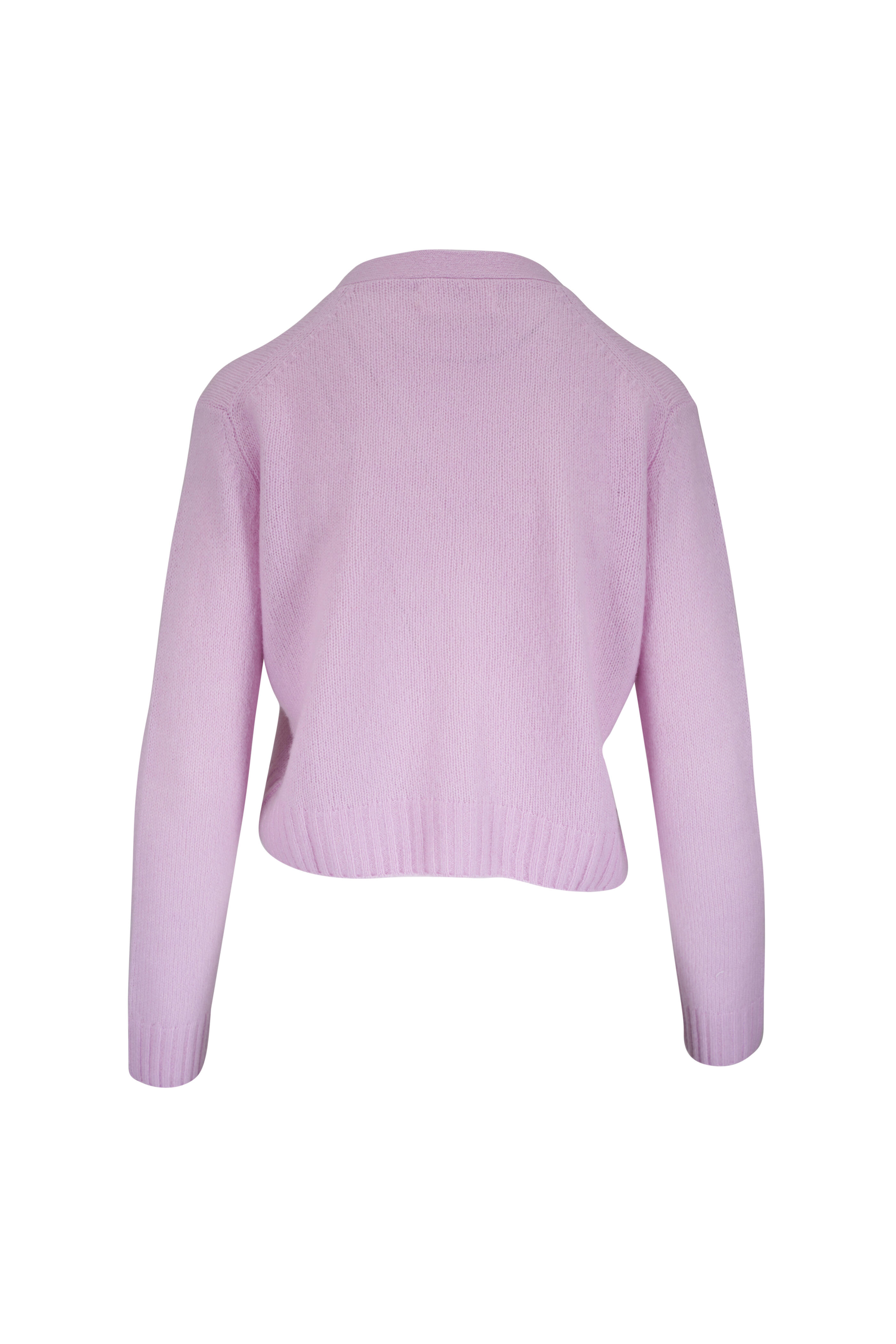 V-neckline. Front button placket. Ribbed knit trim. Imported. Shoulder to hem 20" (size 0). 77% cashmere, 23% silk. Dry clean.