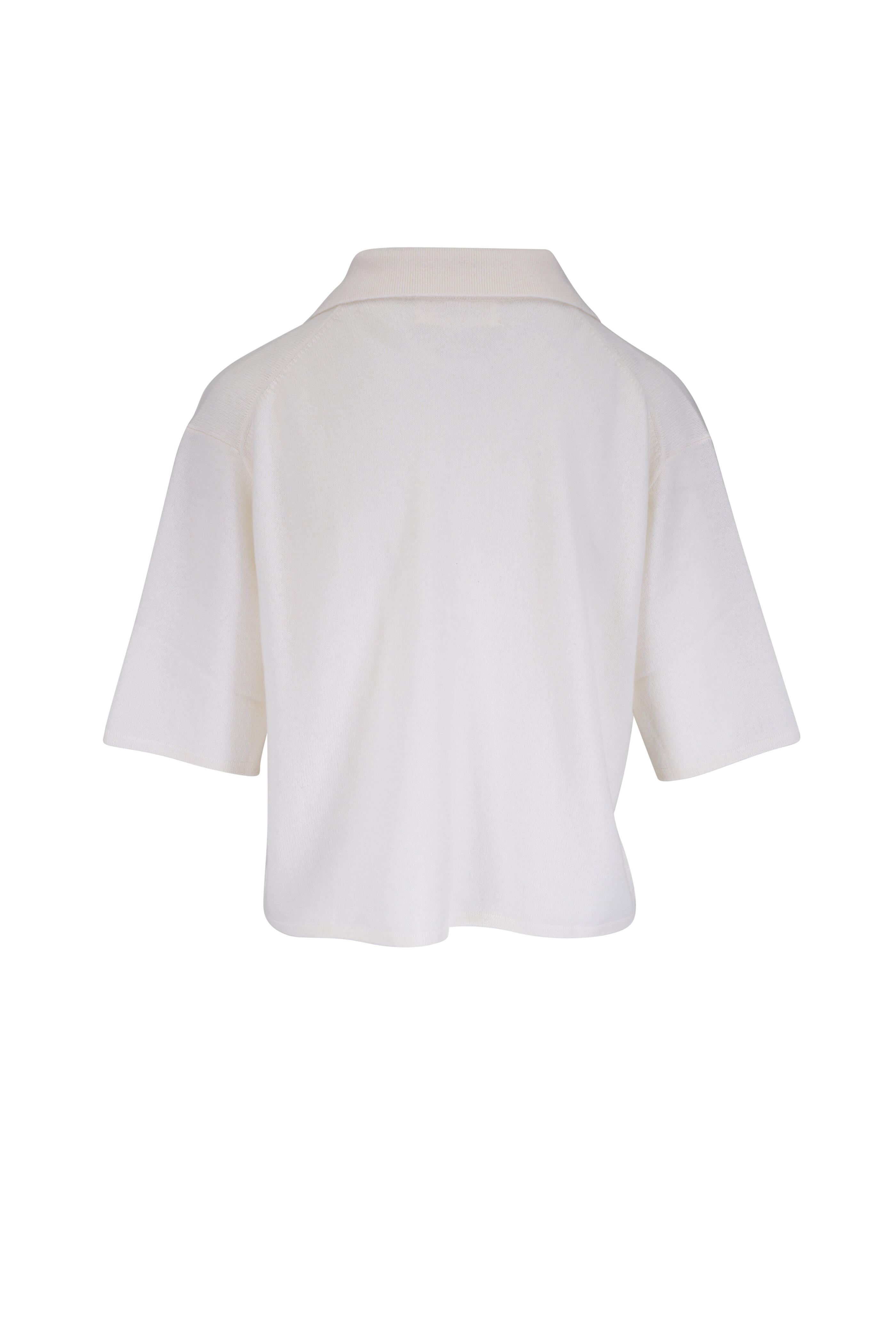 Spread collar; v-neckline. Pullover style. Ribbed trims. Straight hem. Imported. Shoulder to hem 21" (size 0). 100% cashmere. Hand wash.