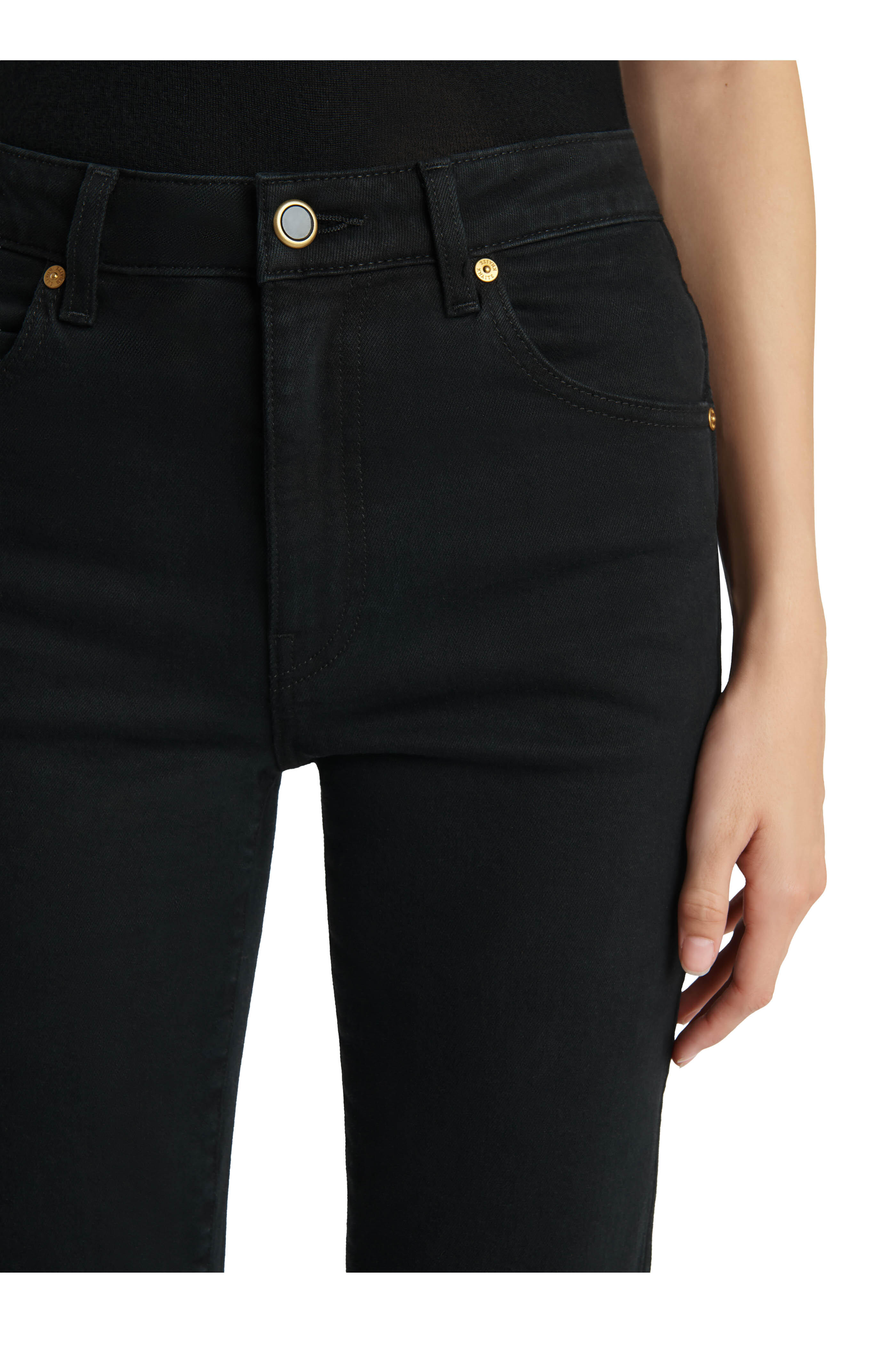 Zip fly; button closure. Banded waist; belt loops. Five pocket styling. Imported. High rise. 98% cotton, 2% polyurethane. Hand wash.