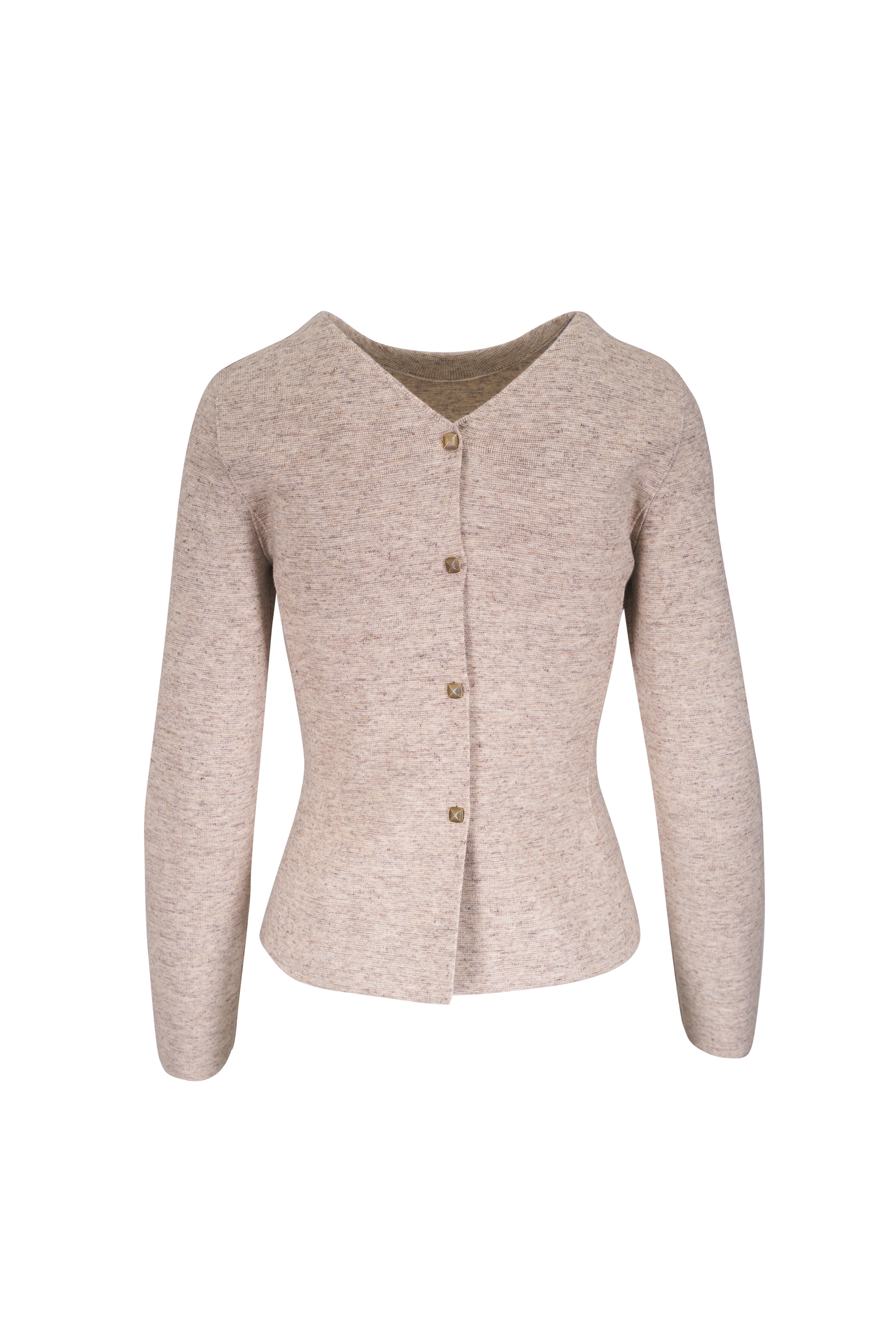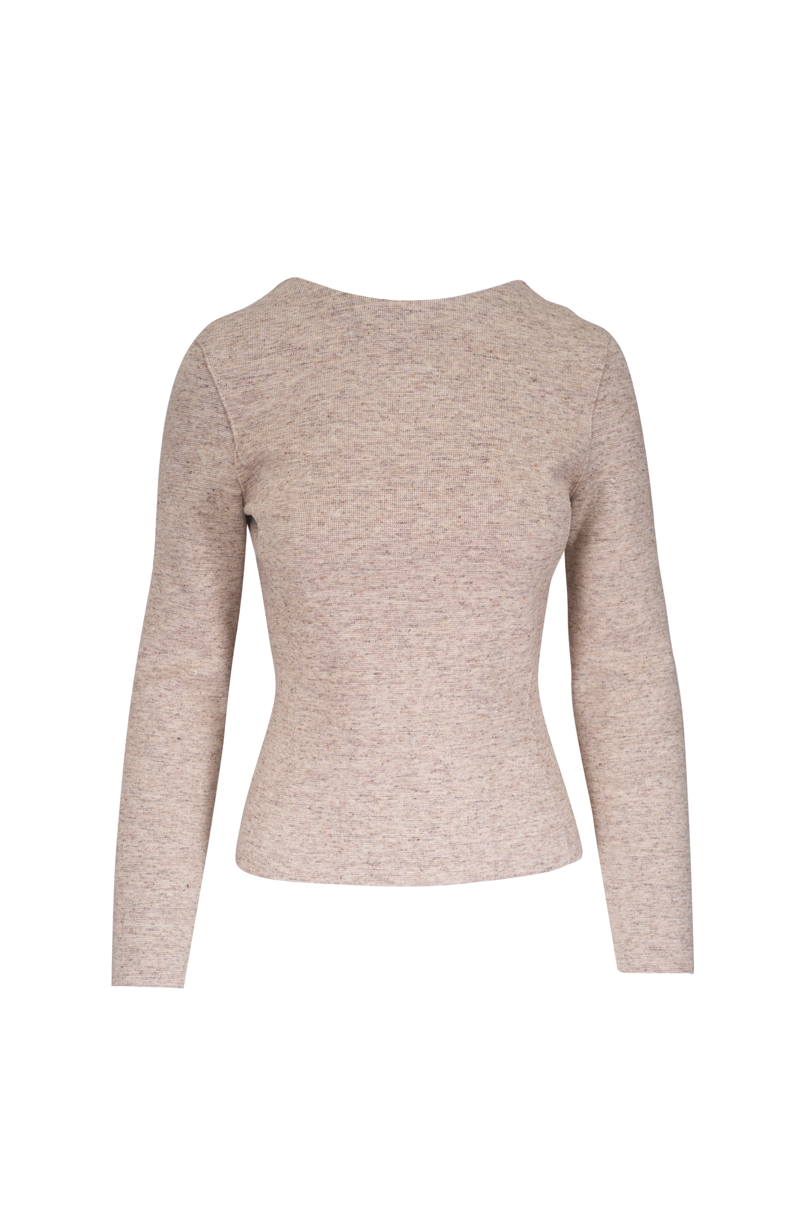 Crew neckline. Back button placket. 14 gauge. Made in Italy. Color : Quinoa Cream Biancore (B5WO). Slim fit. 62% cashmere, 27% virgin wool, 11% linen. Dry clean.