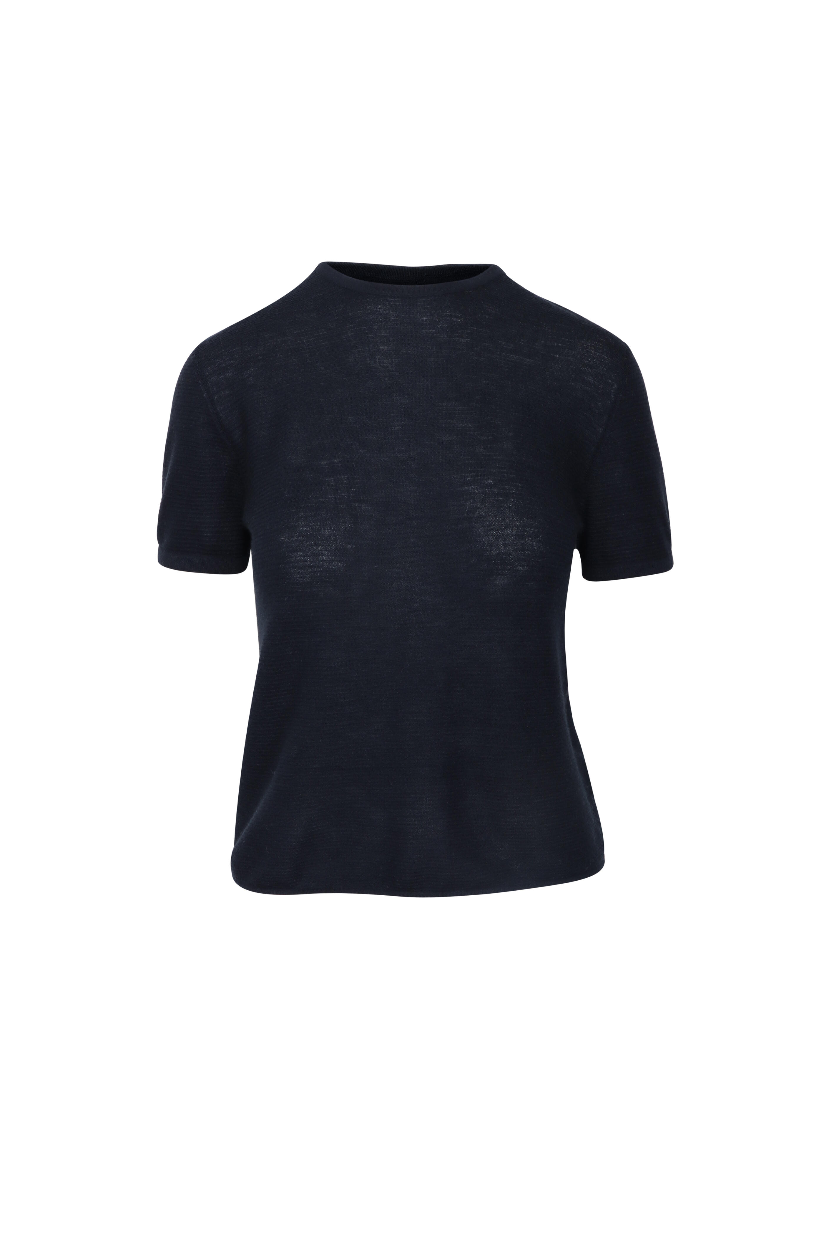 Crewneck. Short sleeves. Shrunken fit. Straight hem. Imported. 100% cashmere. Dry clean.