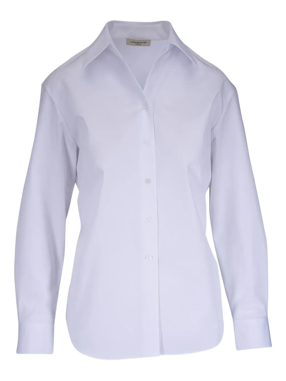 Spread collar. Front button placket. Single button barrel cuffs. Back waist seam; top back princess seams. Imported. Approximately 26" shoulder to hem (measurements taken from size 4). Fitted. 100% cotton. Machine wash.