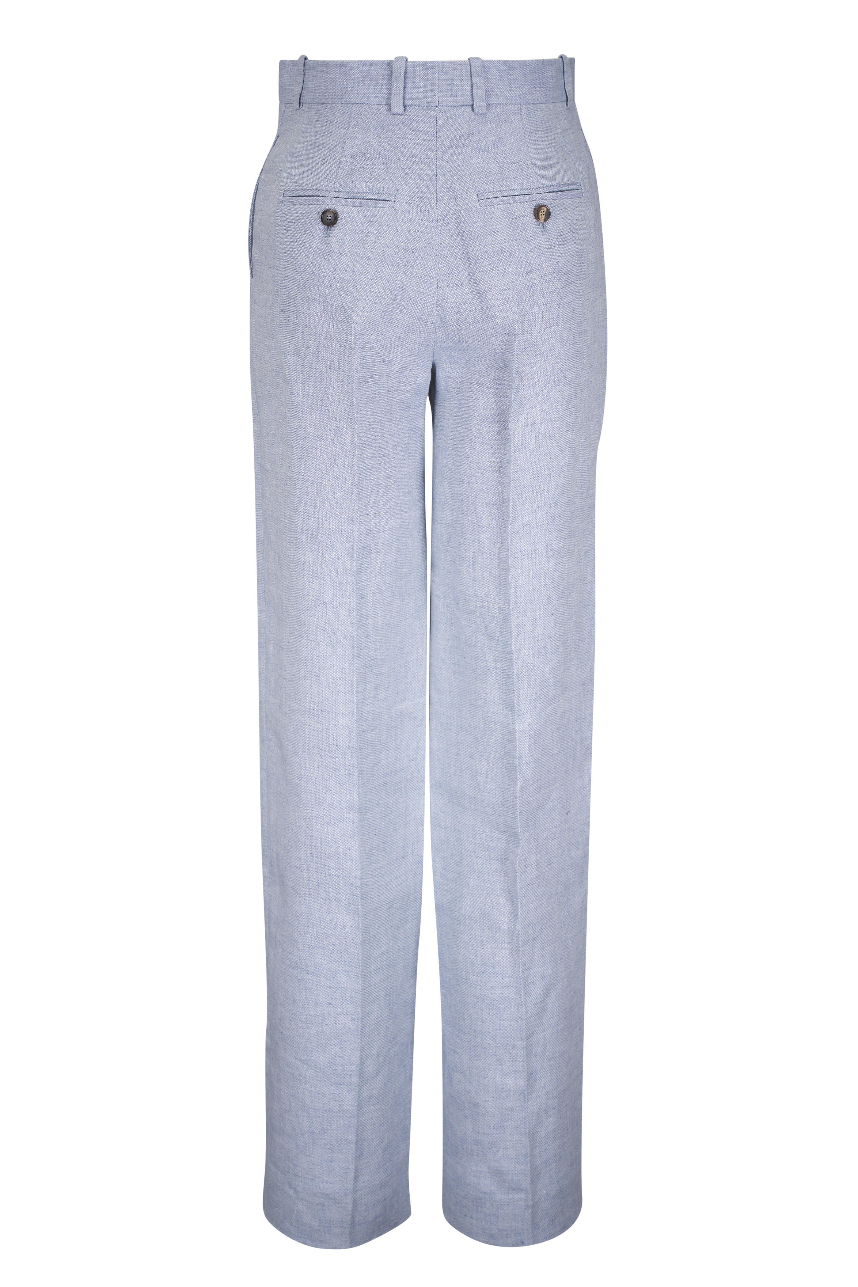 Zip fly; hook-and-bar closure. Banded waist; belt loops. Side slip pockets; back buttoned welt pockets. Pleated. Made in Italy. Inseam: 35". 100% linen. Dry clean.