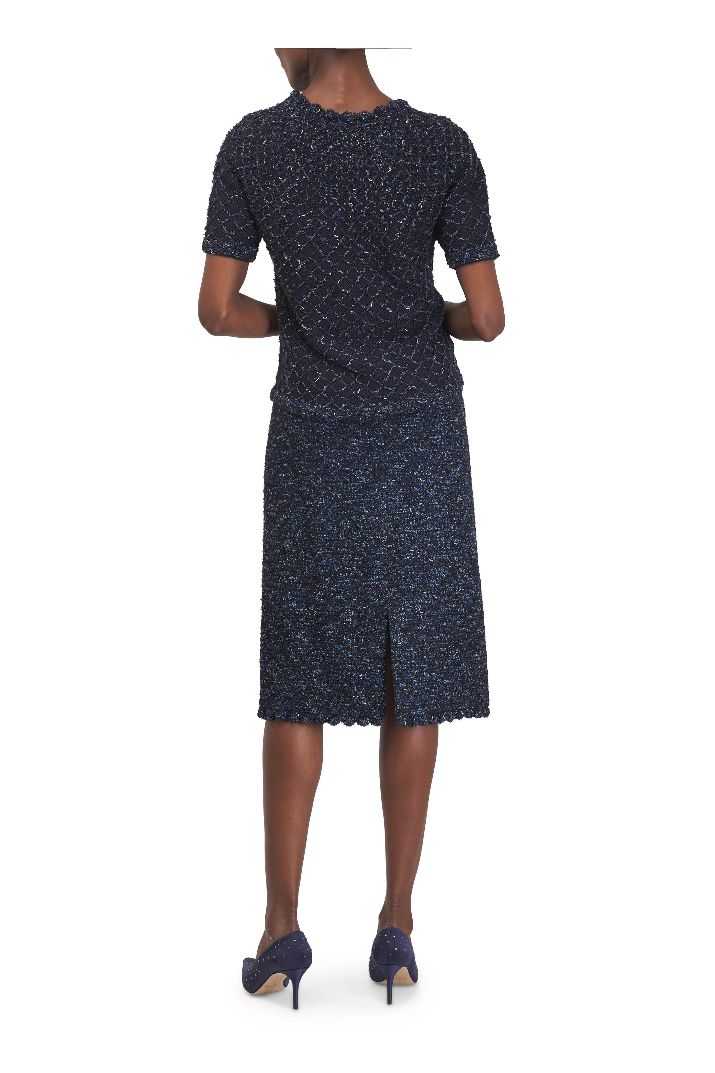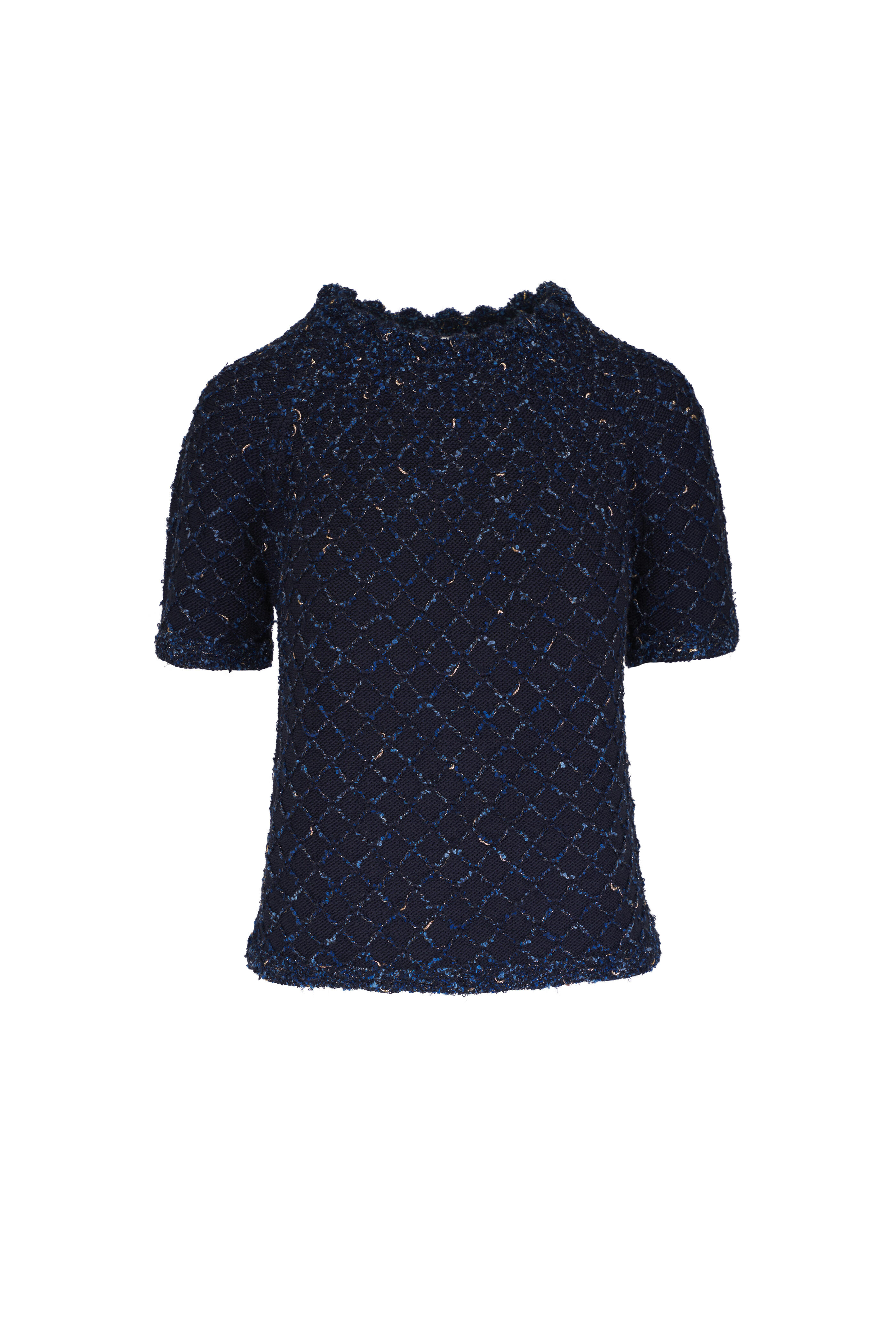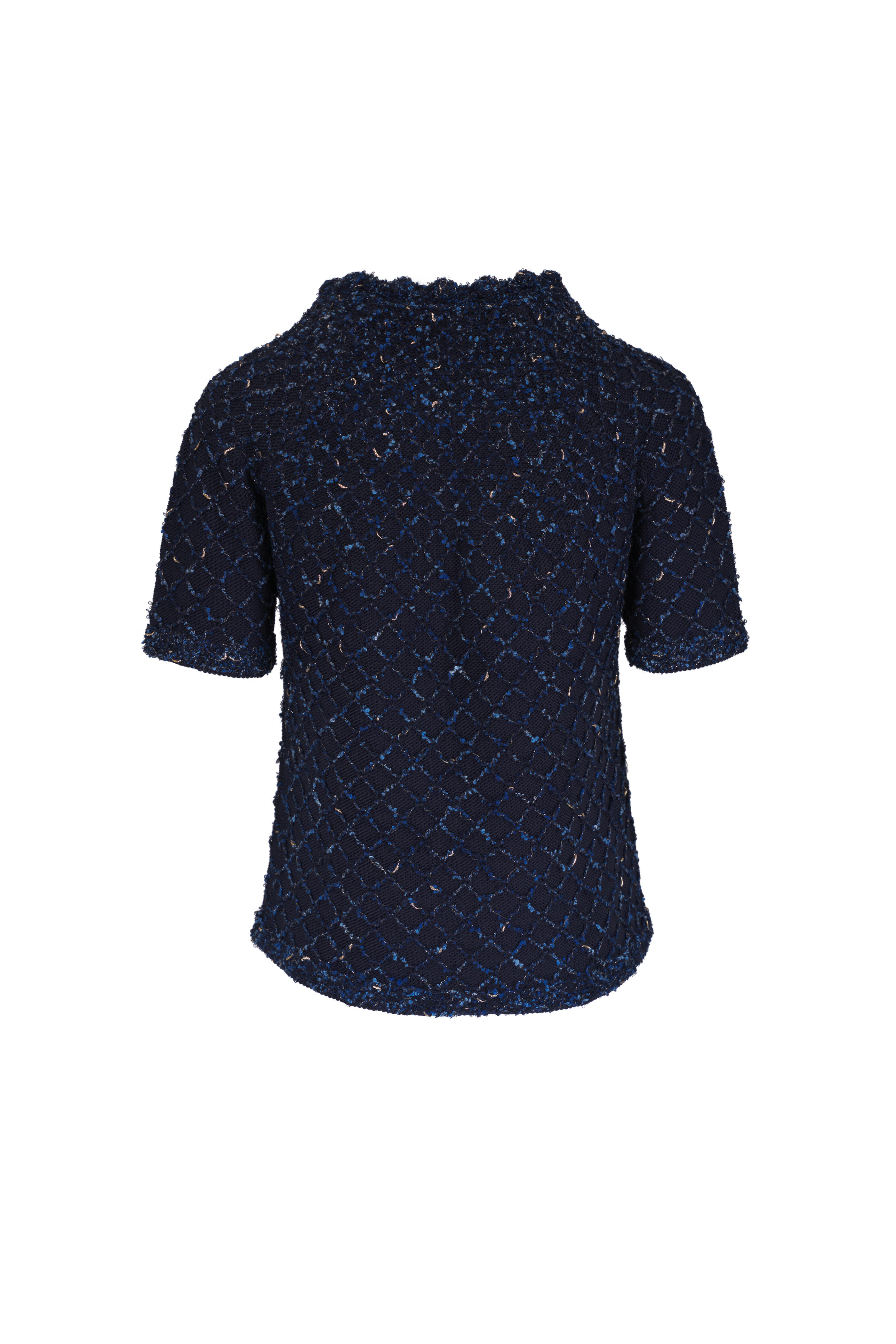 Scalloped crew neckline. Raglan short sleeves. Diamond stitch jacquard. Hand crocheted trim. Imported. Approximately 24" shoulder to hem (measurements from size S). 62% cotton, 24% silk, 4% wool, 4% acrylic, 3% polyester, 1% polyester film filament, 1% polyamide. Dry clean.