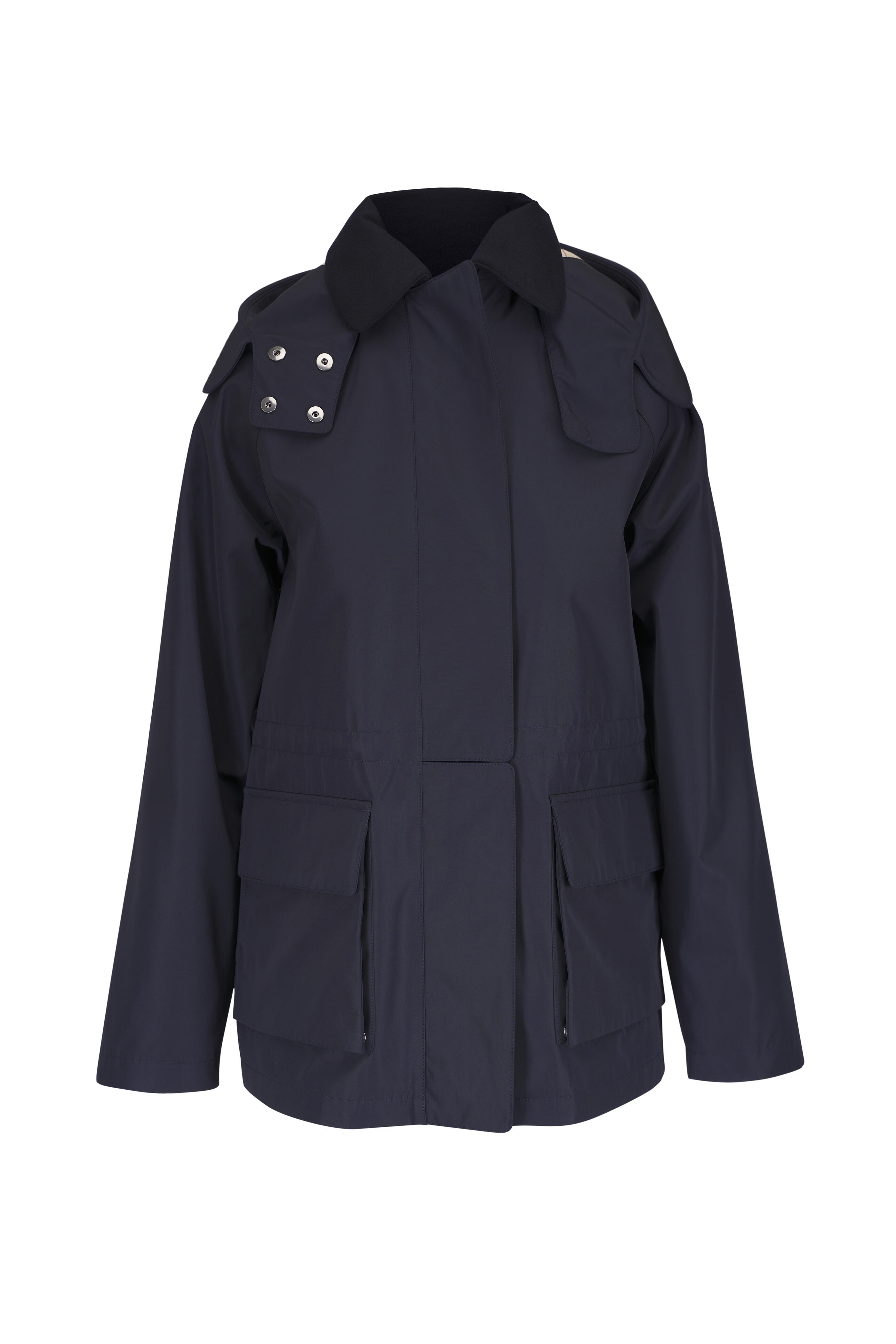 Rounded collar with fleece insert and removable chin strap. Removable hood. Front two-way zip placket; horn button closure. Lowe patch pockets with flap and snap buttons; inner welt pocket with horn button. Hidden ribbed cuffs. Double vents with snap buttons. Made using Twenty K Storm System®. Made in Italy. Regular fit. 100% polyester; lined. Dry clean.