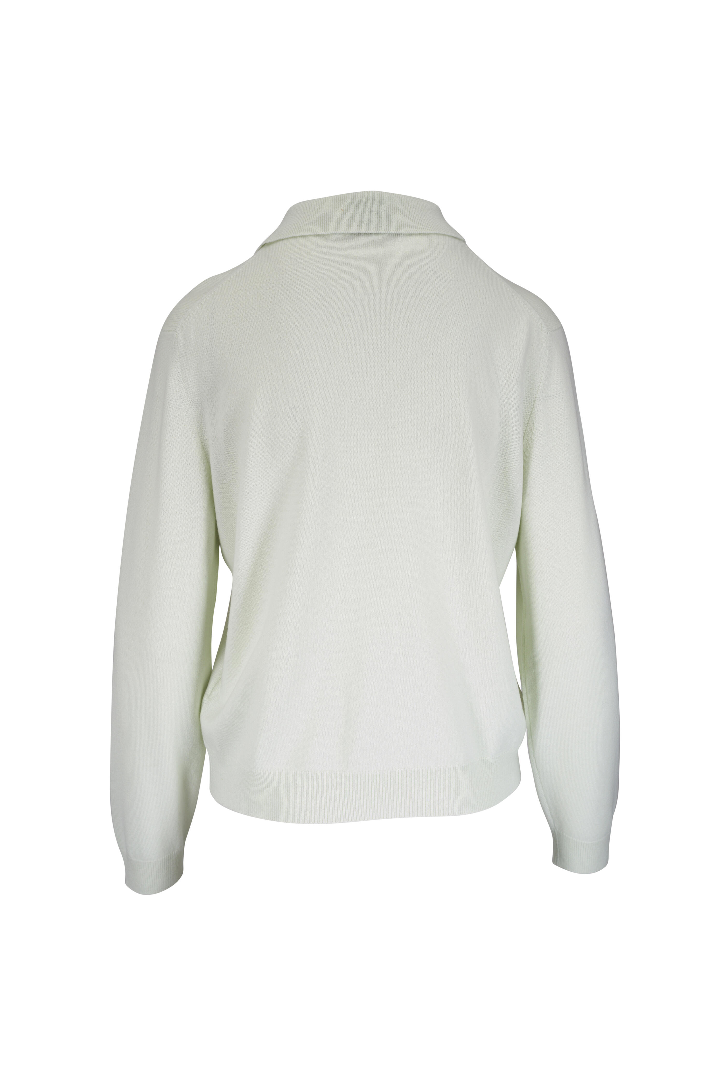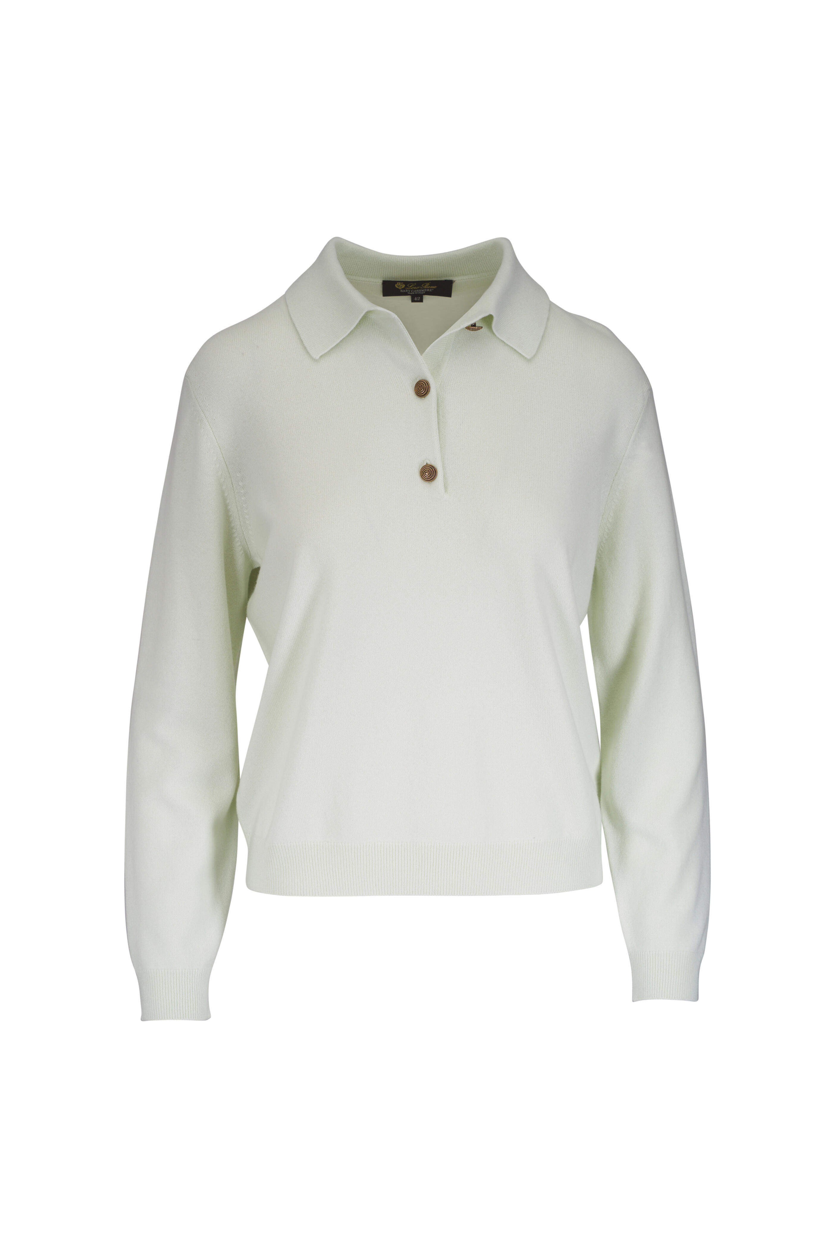 Collared. Three button placket. Ribbed trims. 12 Gauge. Made in Italy. Color: Snow Waterfall (51I5). 100% baby cashmere. Hand wash.