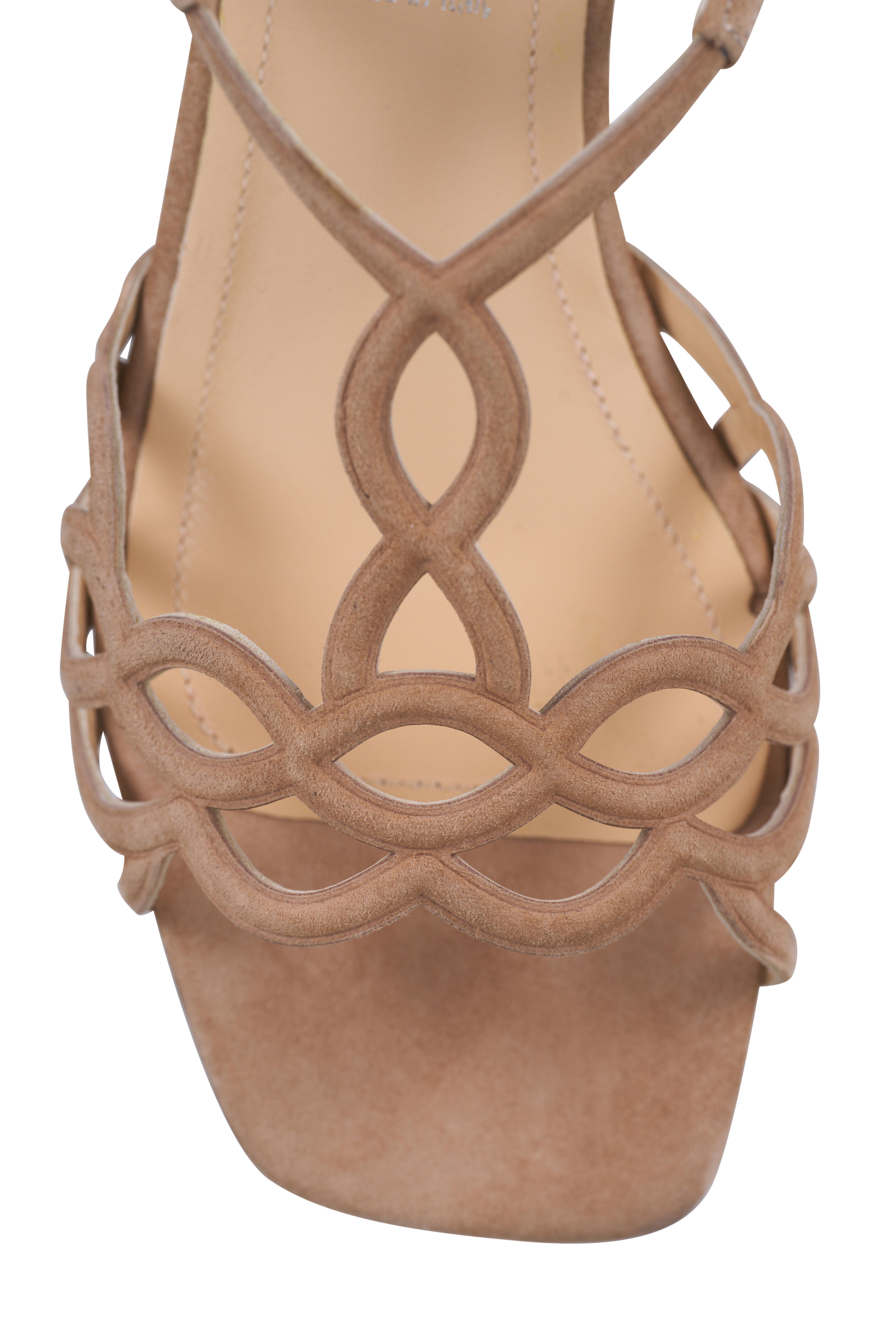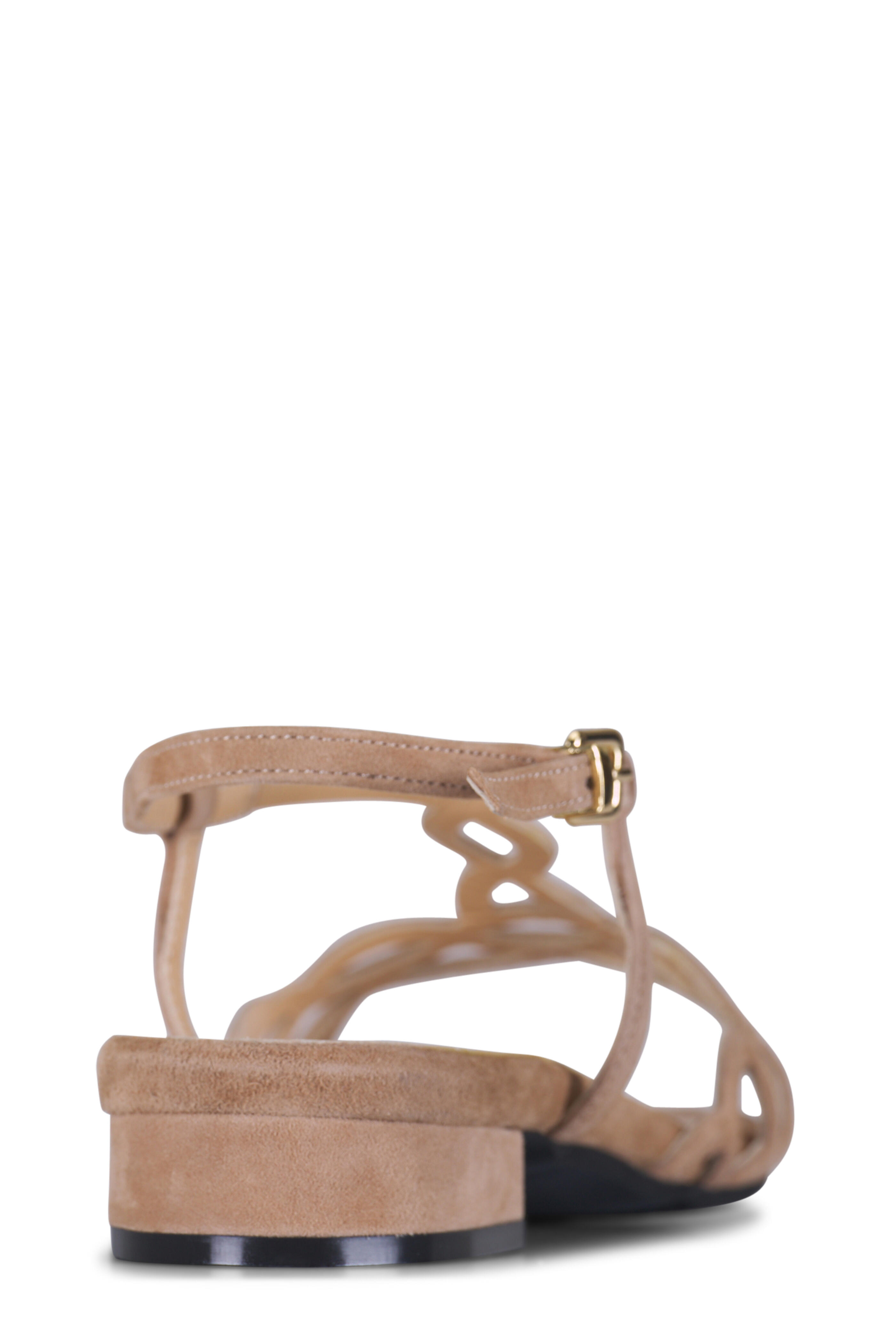 Suede upper. Square open toe. Buckle-fastening ankle strap; slip on style. Sculptural detail on vamp. Leather lining and insole. Self covered heel. Leather sole. Made in Italy. Runs small, size up.