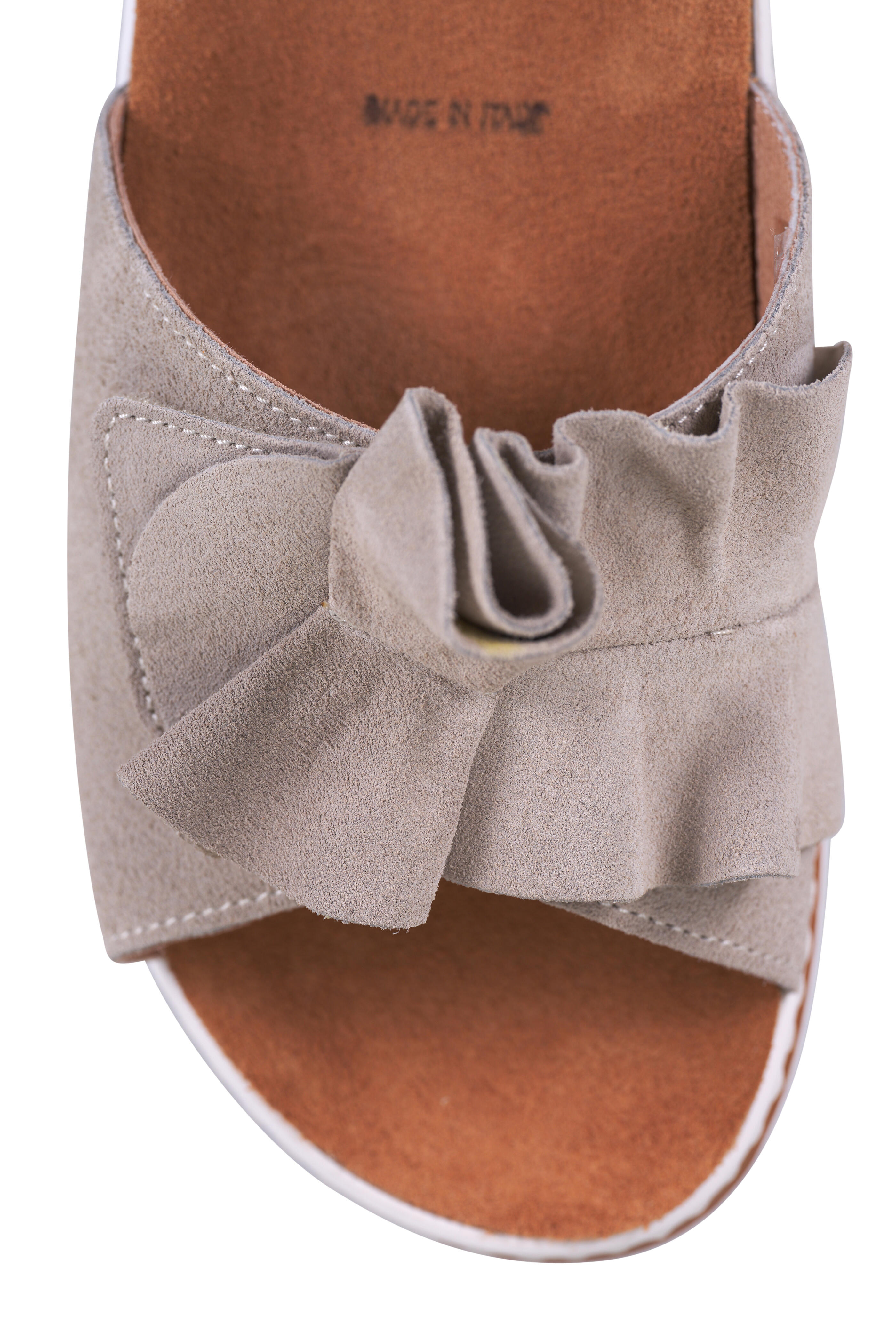 Suede upper. Open, round toe. Velcro flap; ruffled detail. Slip-on style. Cushioned leather lining and suede insole. Rubber sole. Made in Italy. Heel measurement: 40mm. Runs small, size up. Full sizes only.