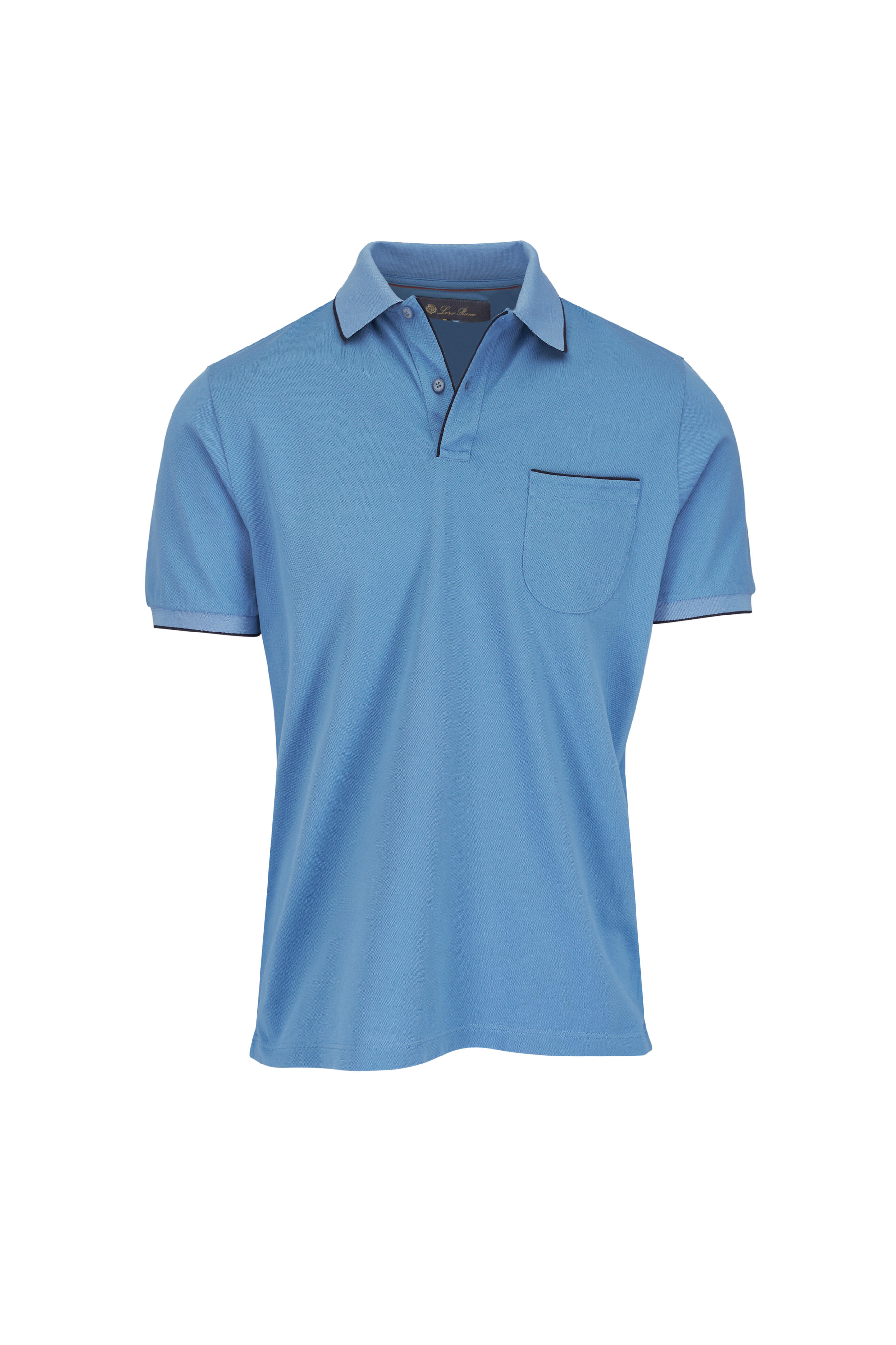 Spread collar. Three-button closure. Front patch pocket. Pullover style. Contrast color trims. Made in Italy. 95% cotton, 5% elastane. Machine wash.