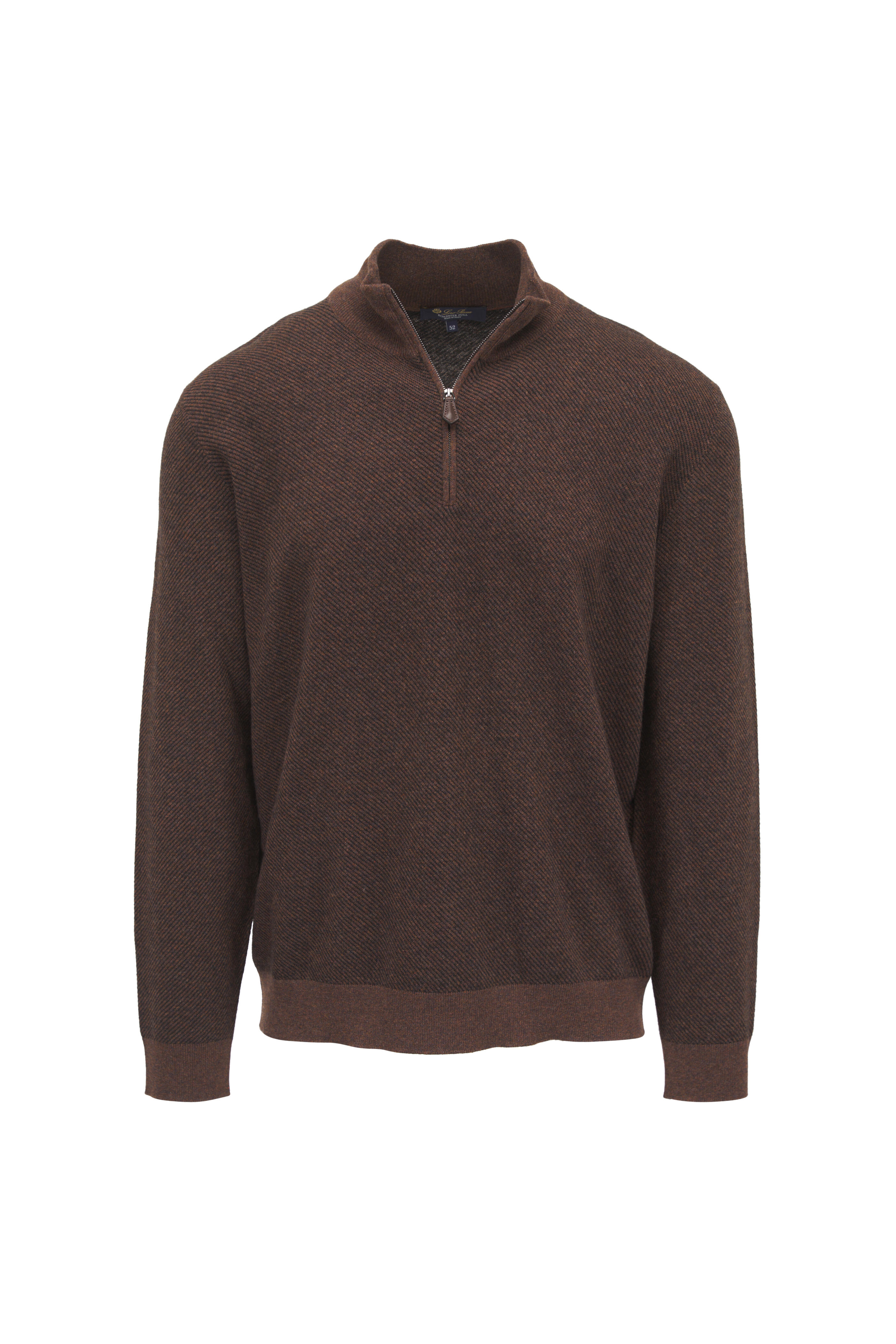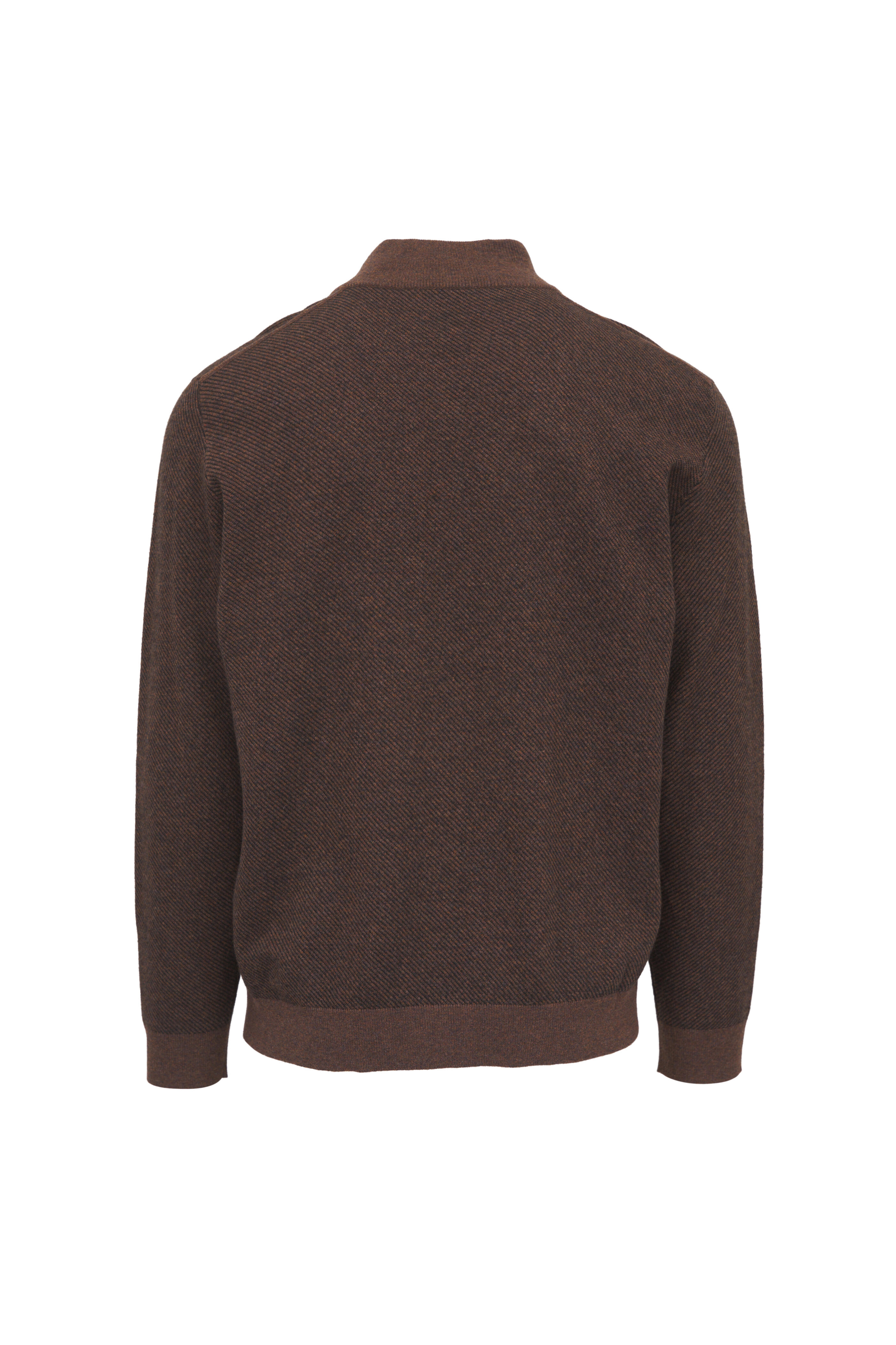 Stand collar. Quarter zip placket. Ribbed trims. Made in Italy. 100% cashmere. Dry clean.