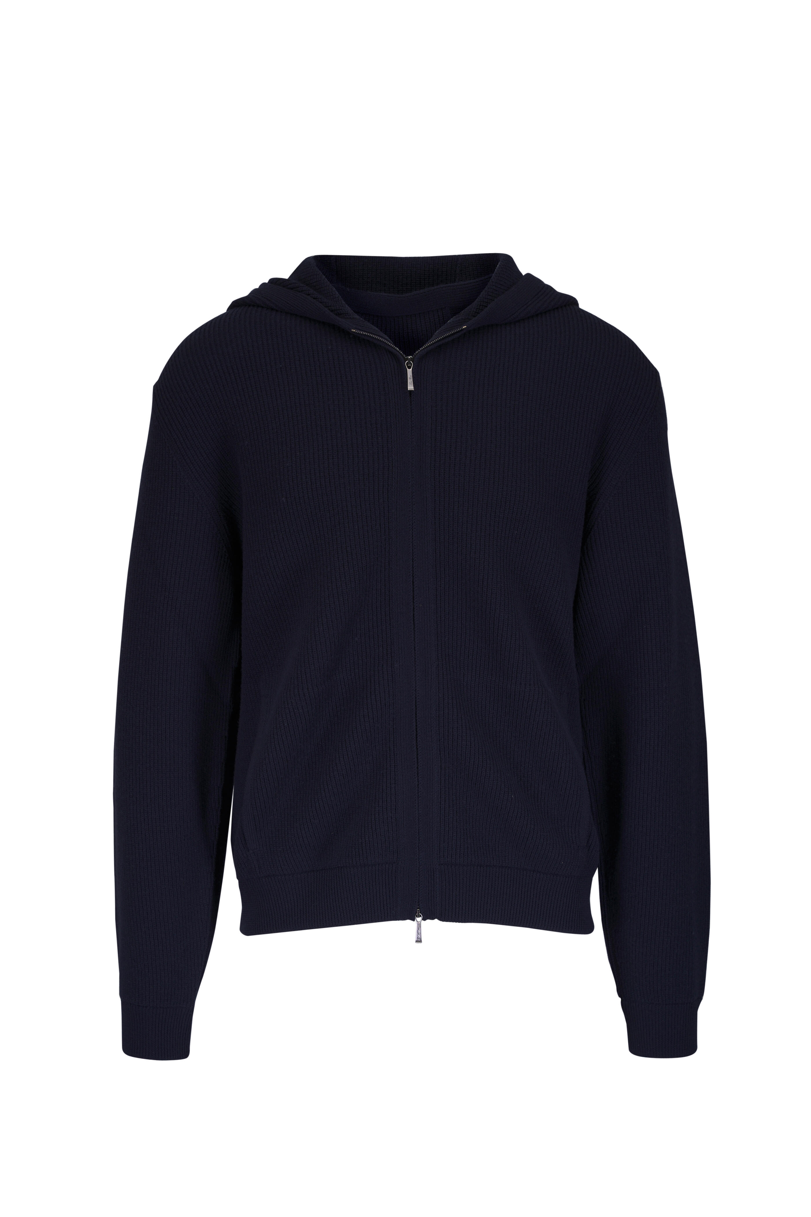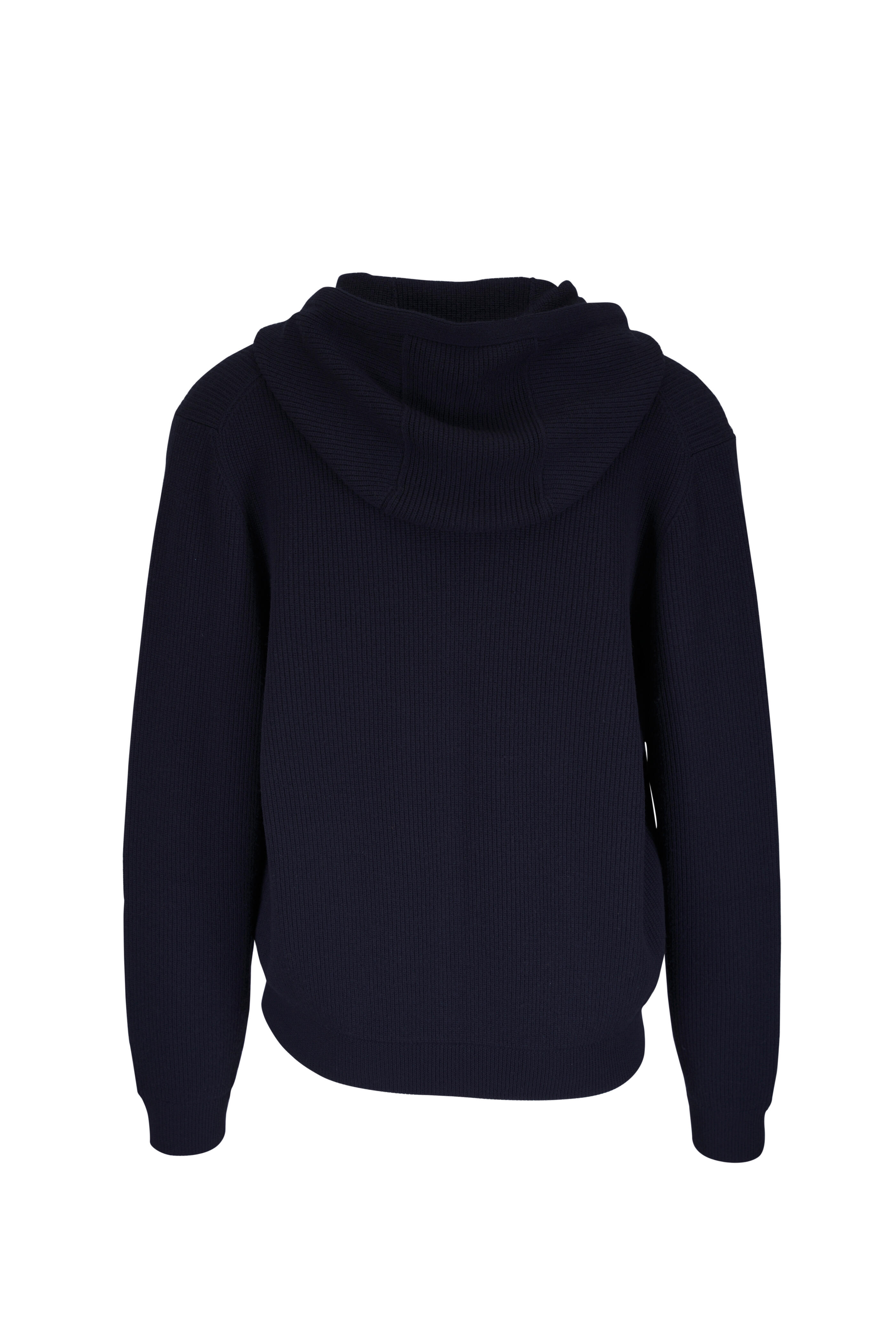 Hooded. Two-way zip. Ribbed throughout. Lower slip pockets. Banded cuffs and hem. Straight hem. Made in Italy. Shoulder to hem 29" (size L). 100% Virgin wool. Hand wash.