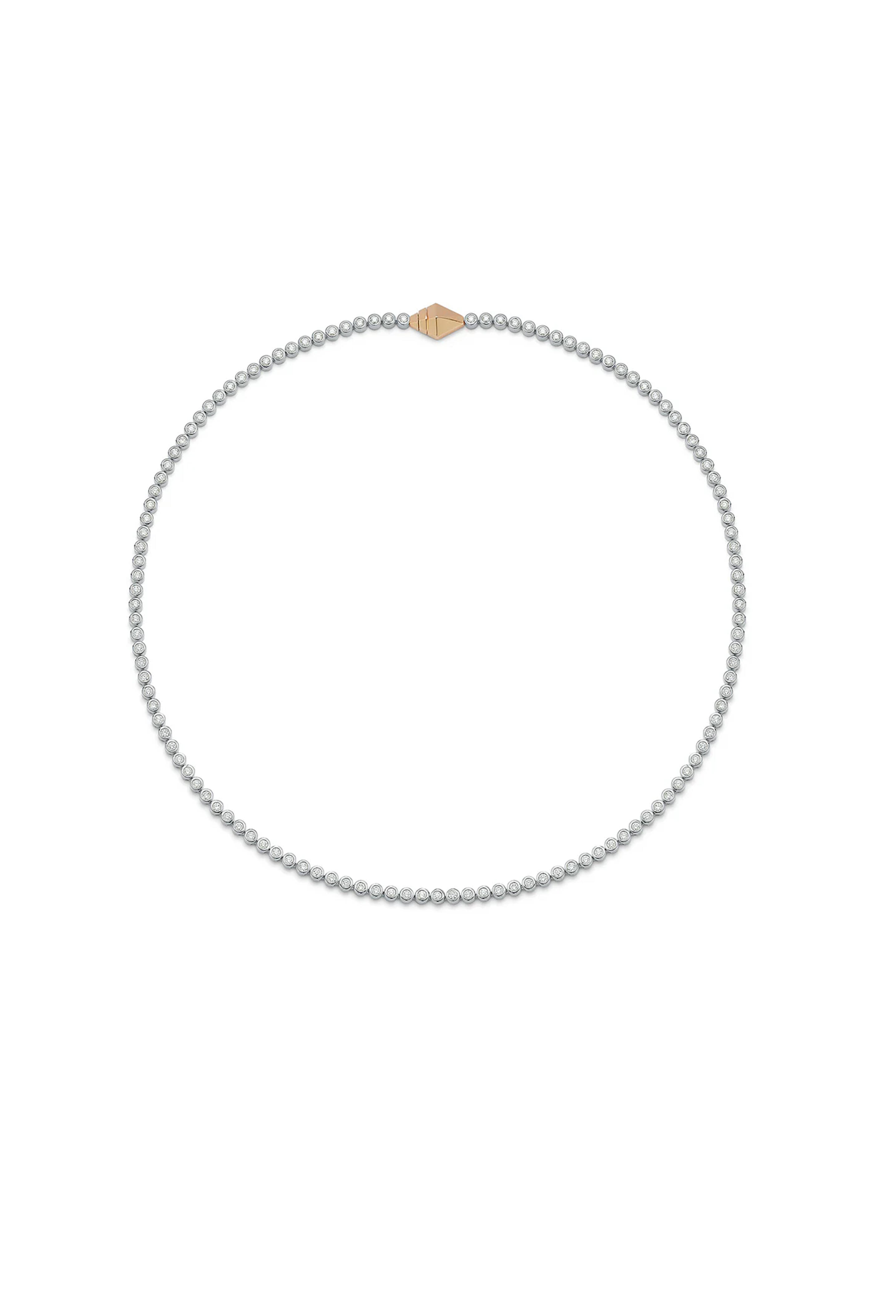 18k white gold. 18k rose gold. Diamond 2.98 total carat weight. Tennis style. Bezel set. Rose gold origami clasps. Made in New York. Length: 16”.