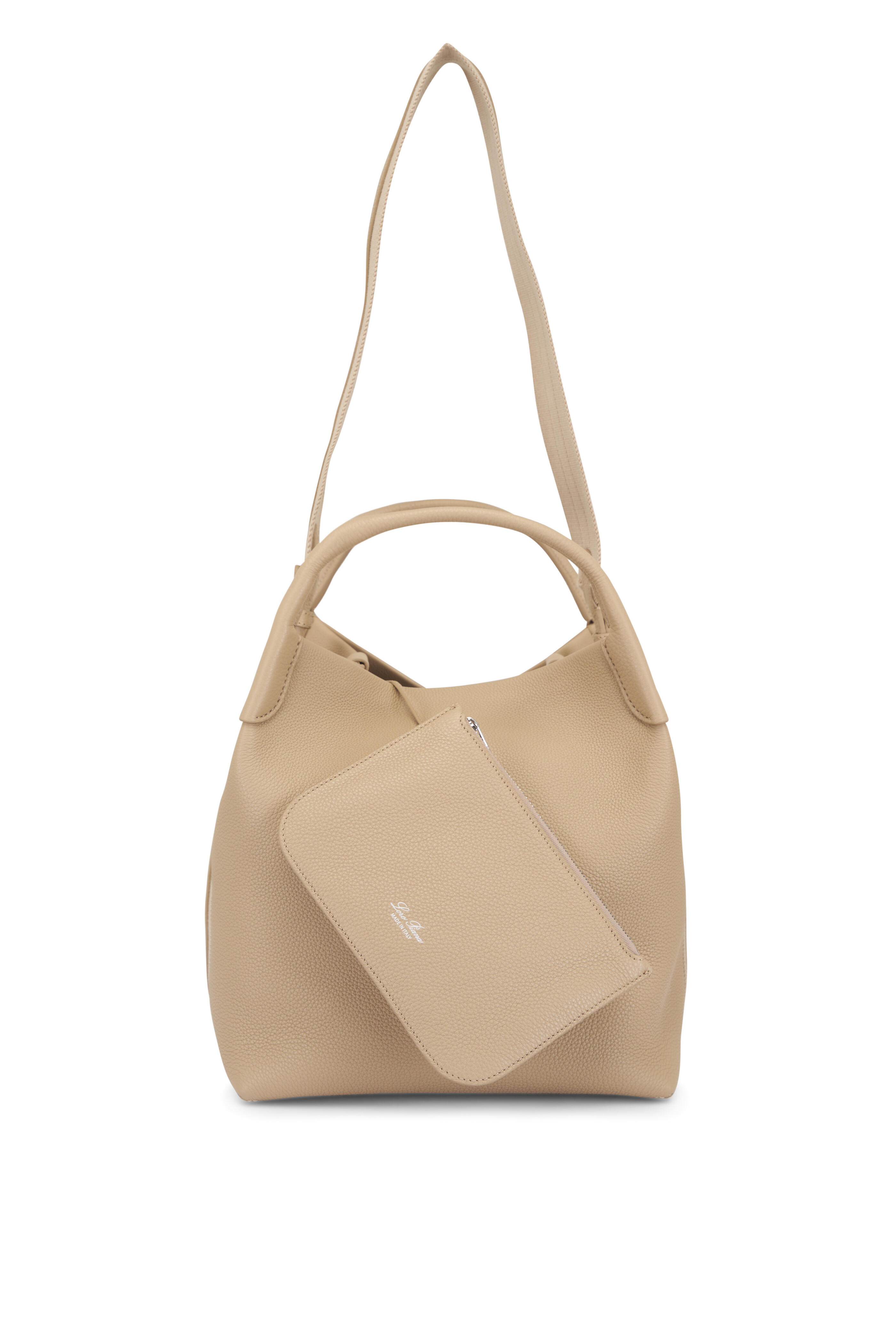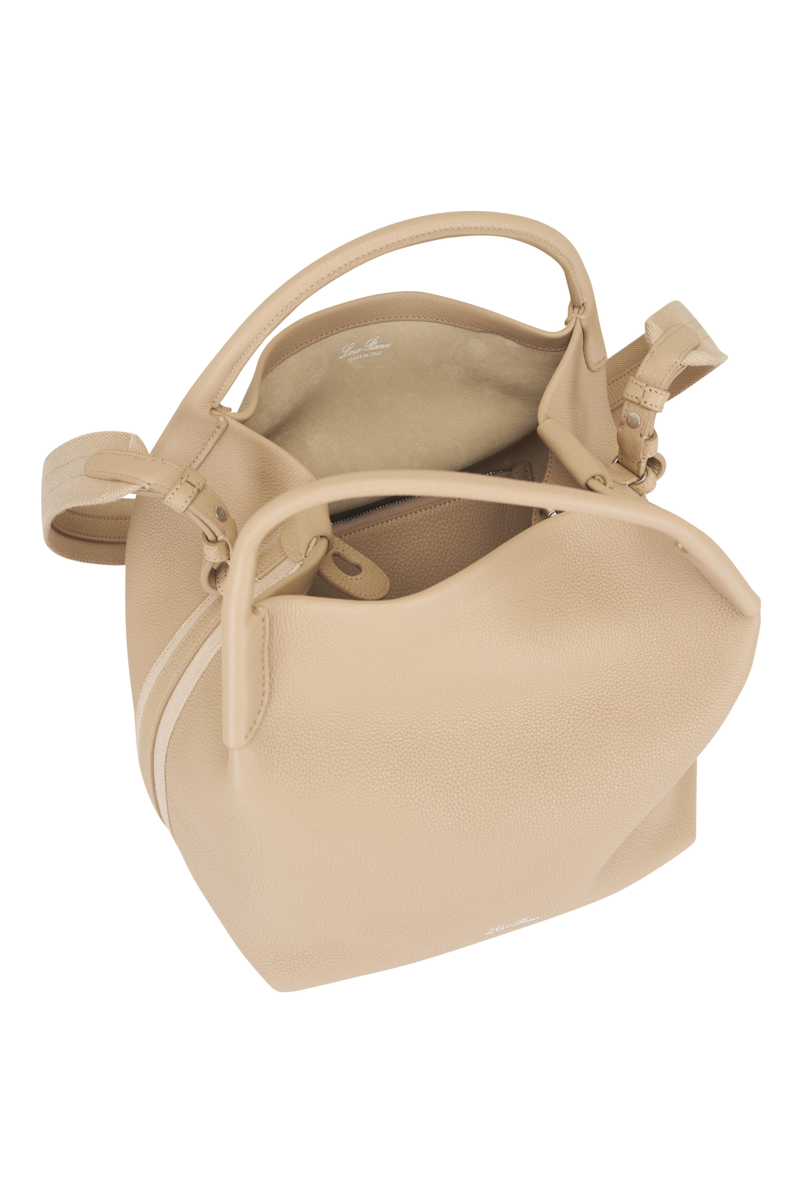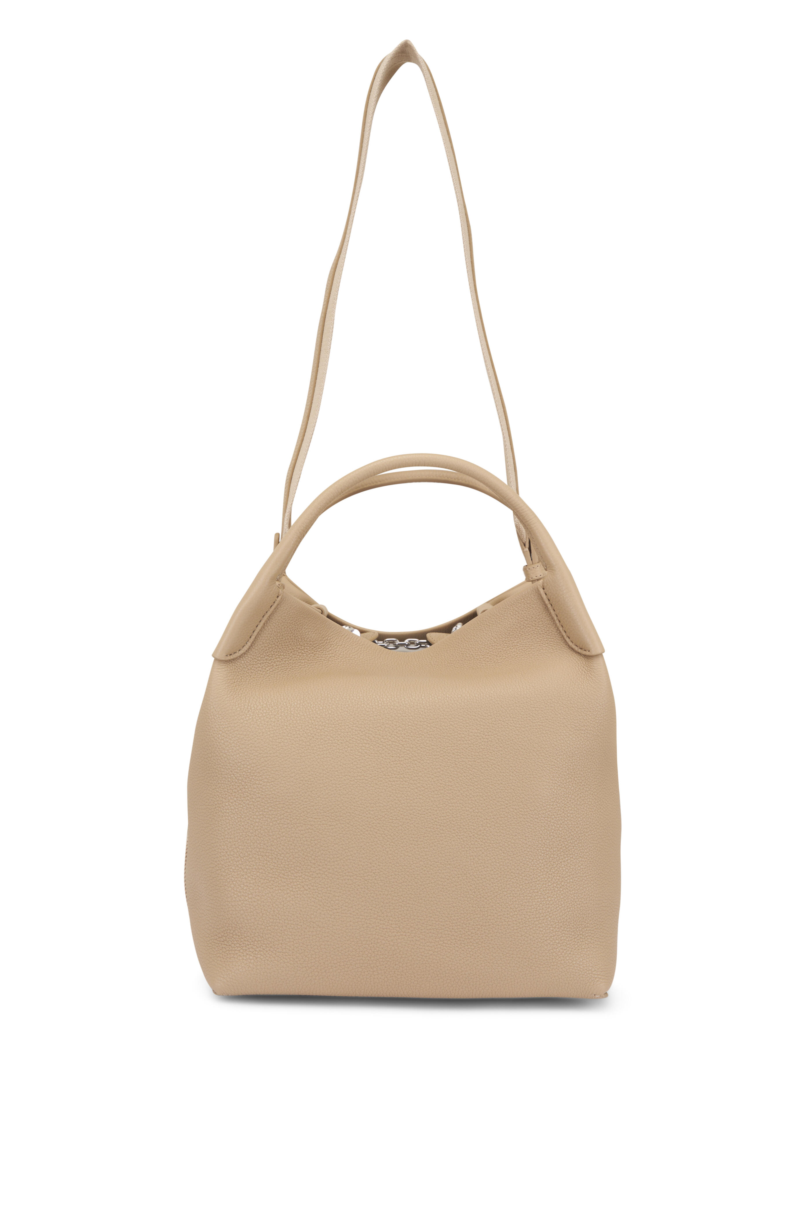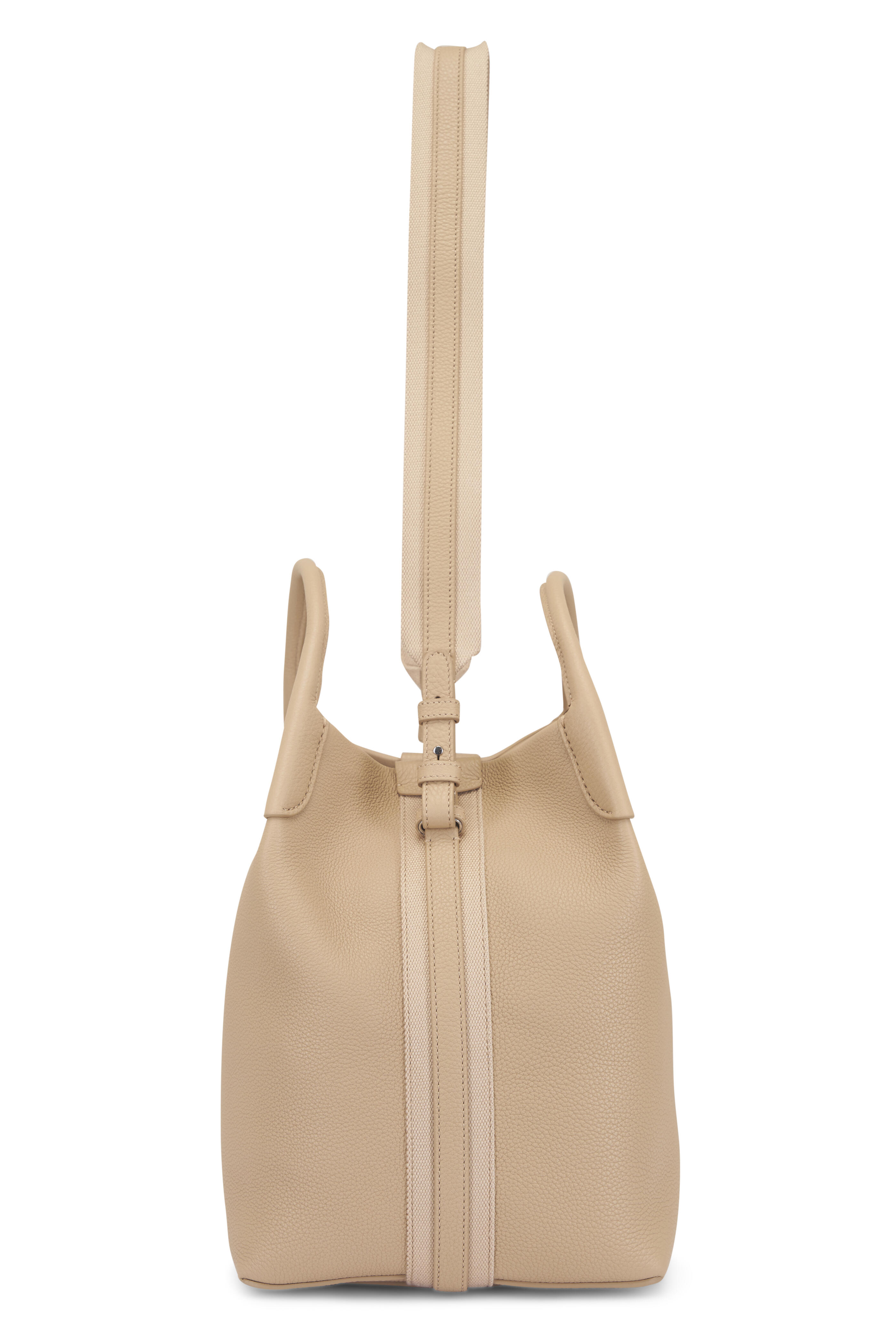 Fine grain calfskin leather. Adjustable removable shoulder strap. Single top handle. Top toggle closure. Removable inner leather pouch; attached to the bag with a toggle. Suede lining. Made in Italy. Size: Large 24 x 20 x 27 cm (9.5" x 7.9" x 10.6").