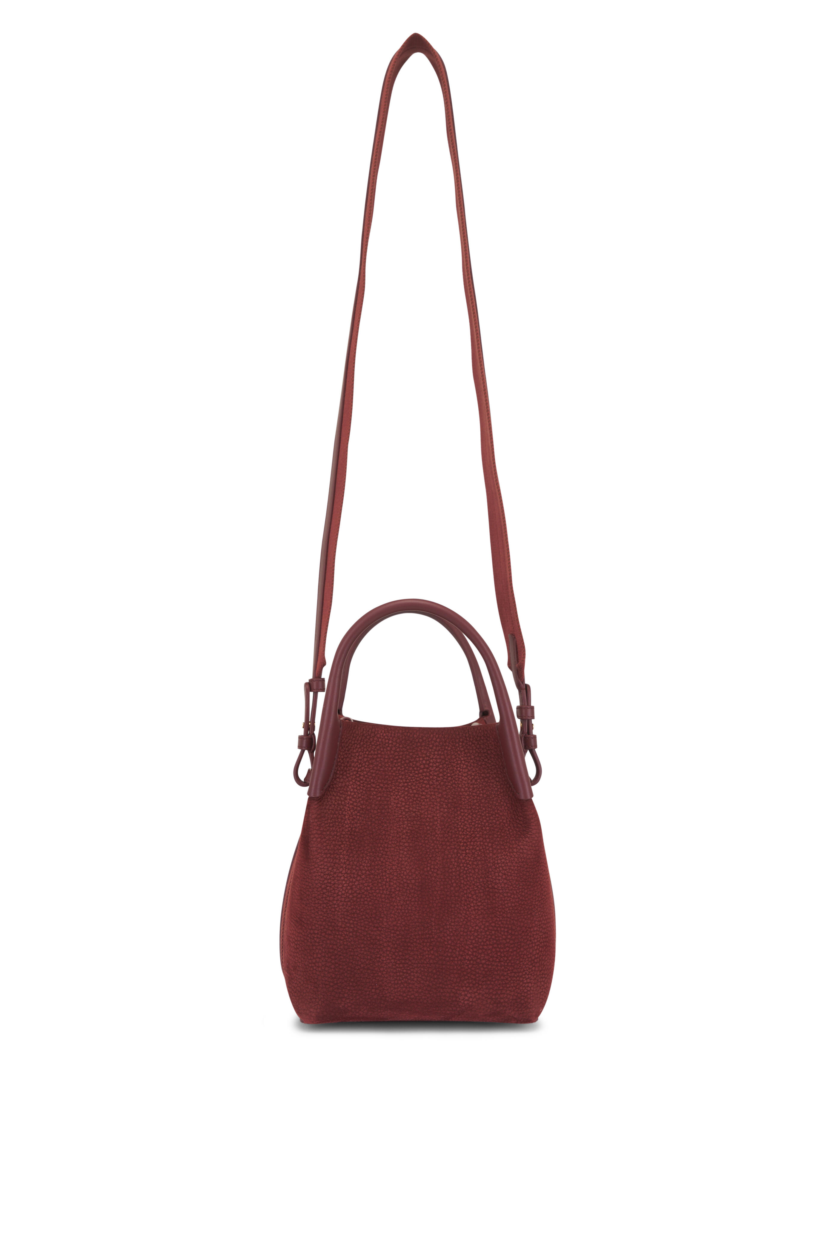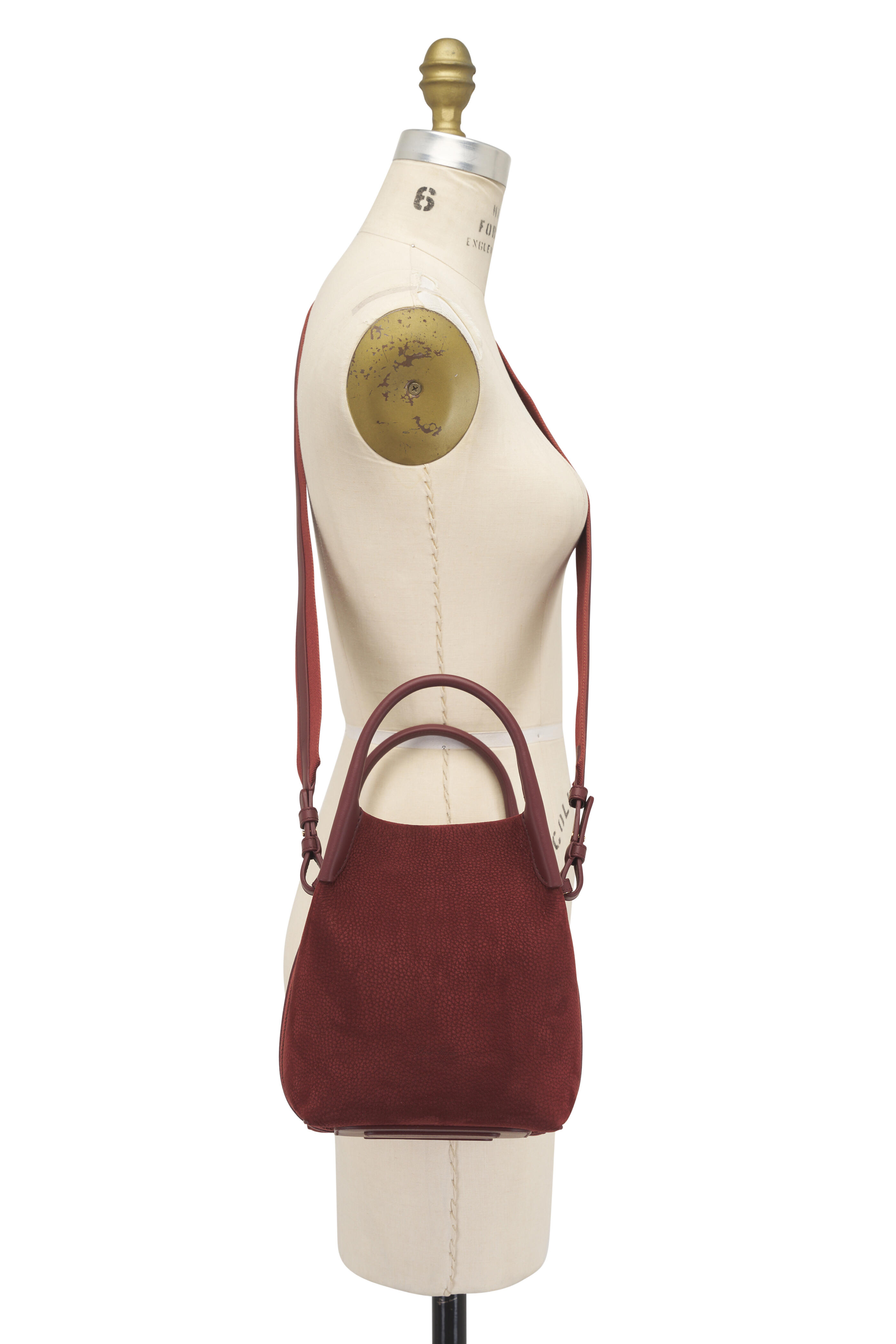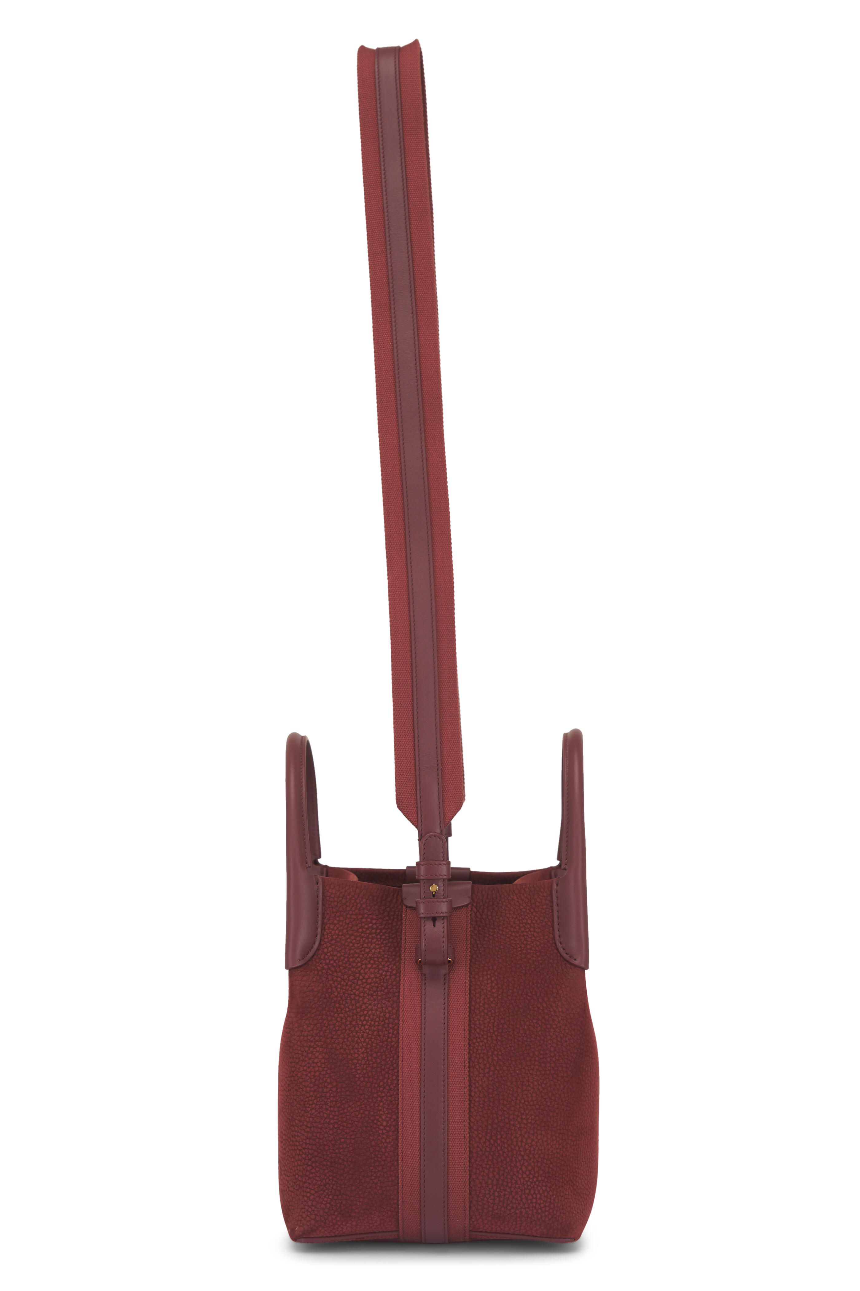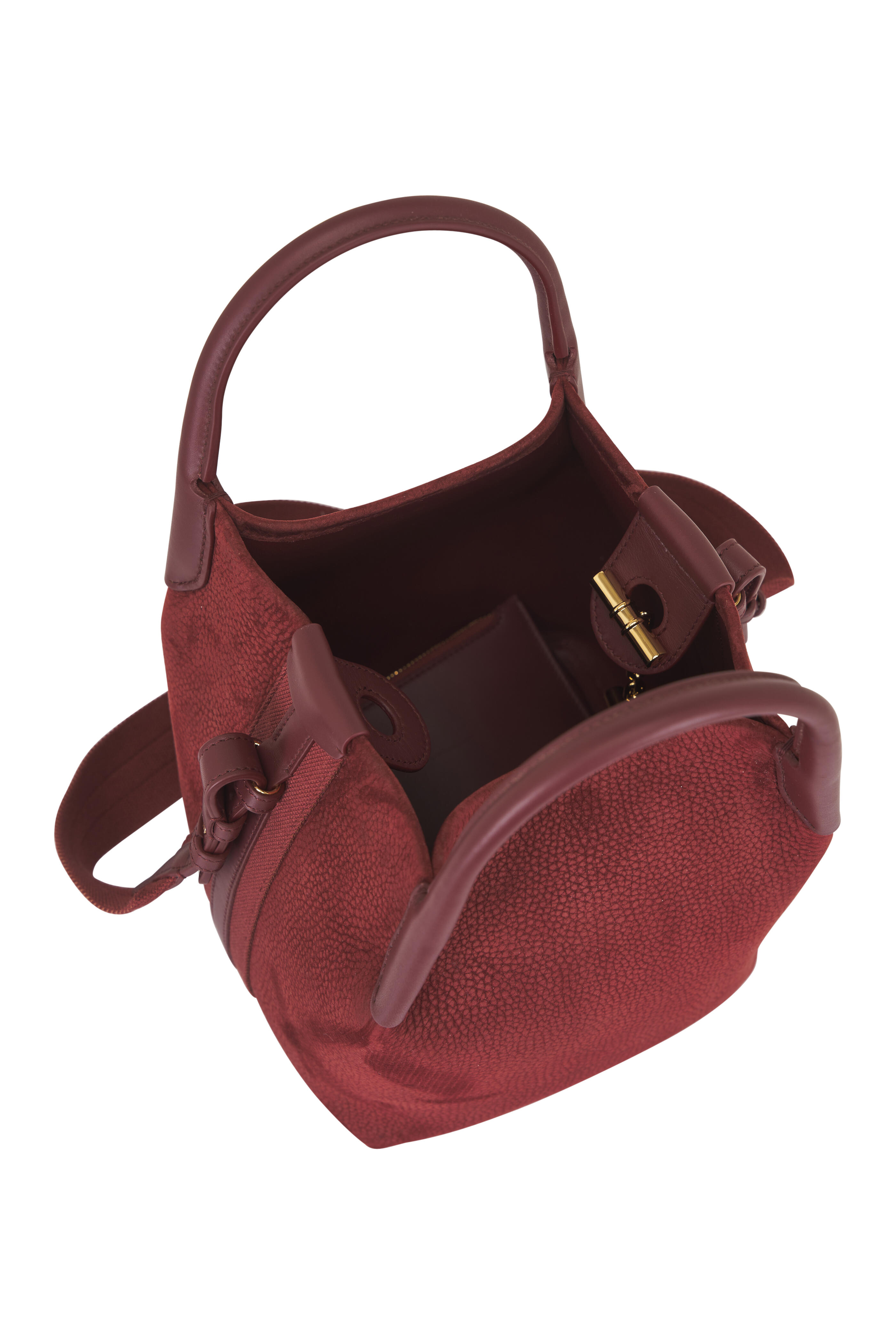 Embossed suede. Dual leather top handles; removable fabric and leather shoulder strap. Top metal toggle closure. Interior leather zip pouch. Sun gold tone hardware. Nappa leather lining. Double-layered leather base. Made in Italy. Color : Glazed Moka/Sun Gold (H1DY). Dimensions: 17 x 20 x 17 cm / 6.7 x 7.9 x 6.7 in. Handle drop: 9 cm / 3.5 in. Strap drop: 52 cm / 20.5 in.