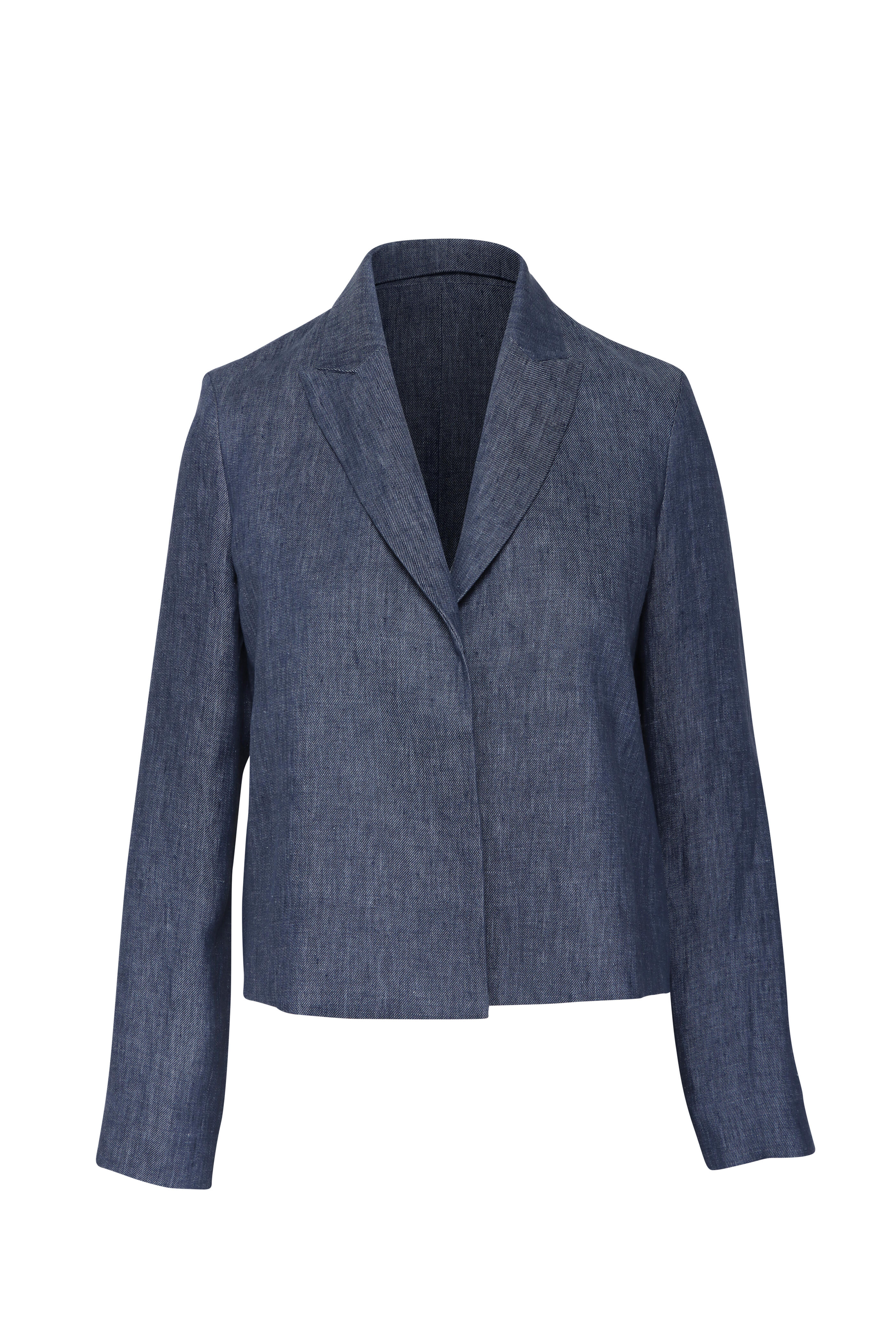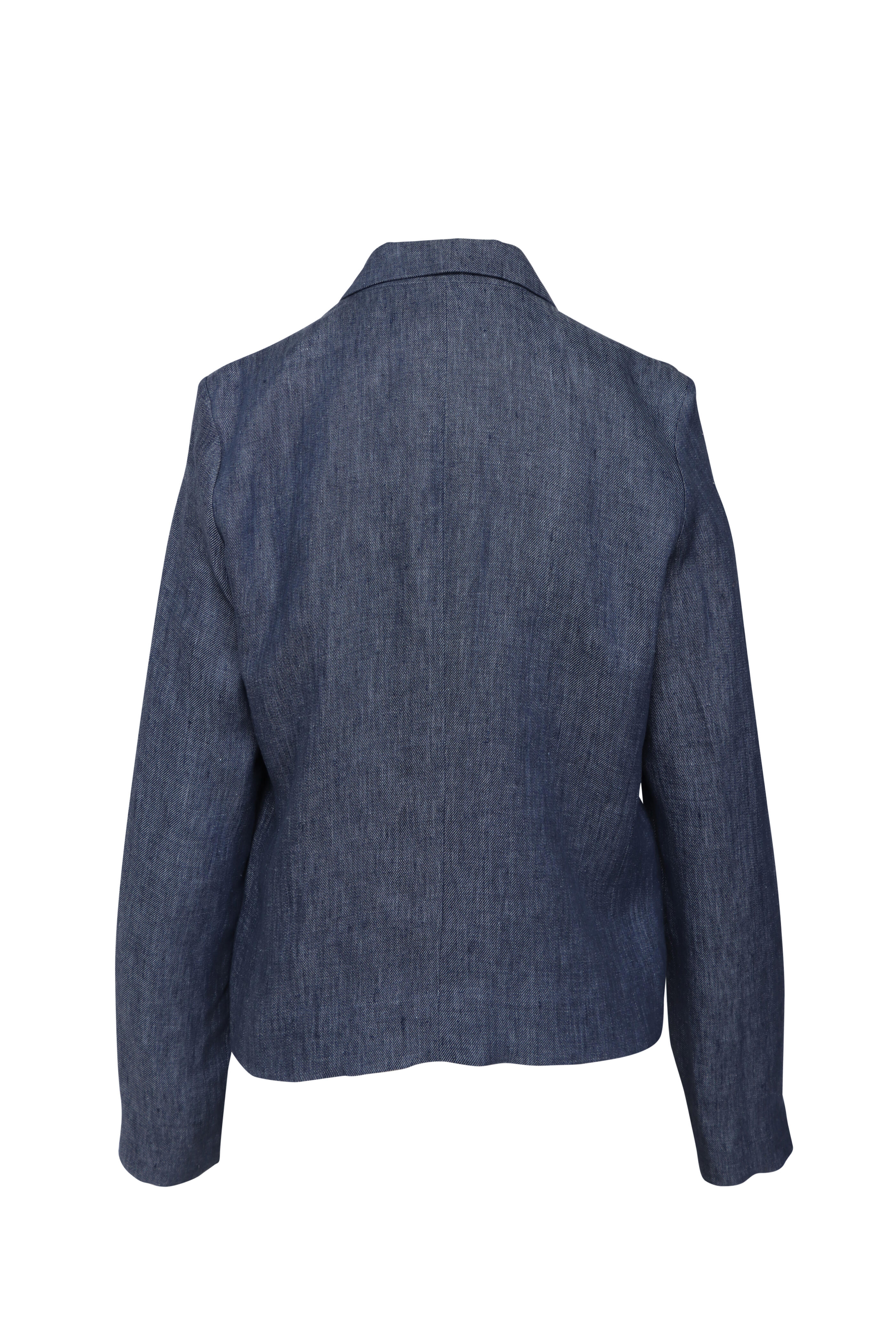 Peak lapel. Long sleeves. Concealed front button closure. Relaxed fit. Lightweight denim fabrication. Imported. Cropped length. 100% hemp. Machine washable.