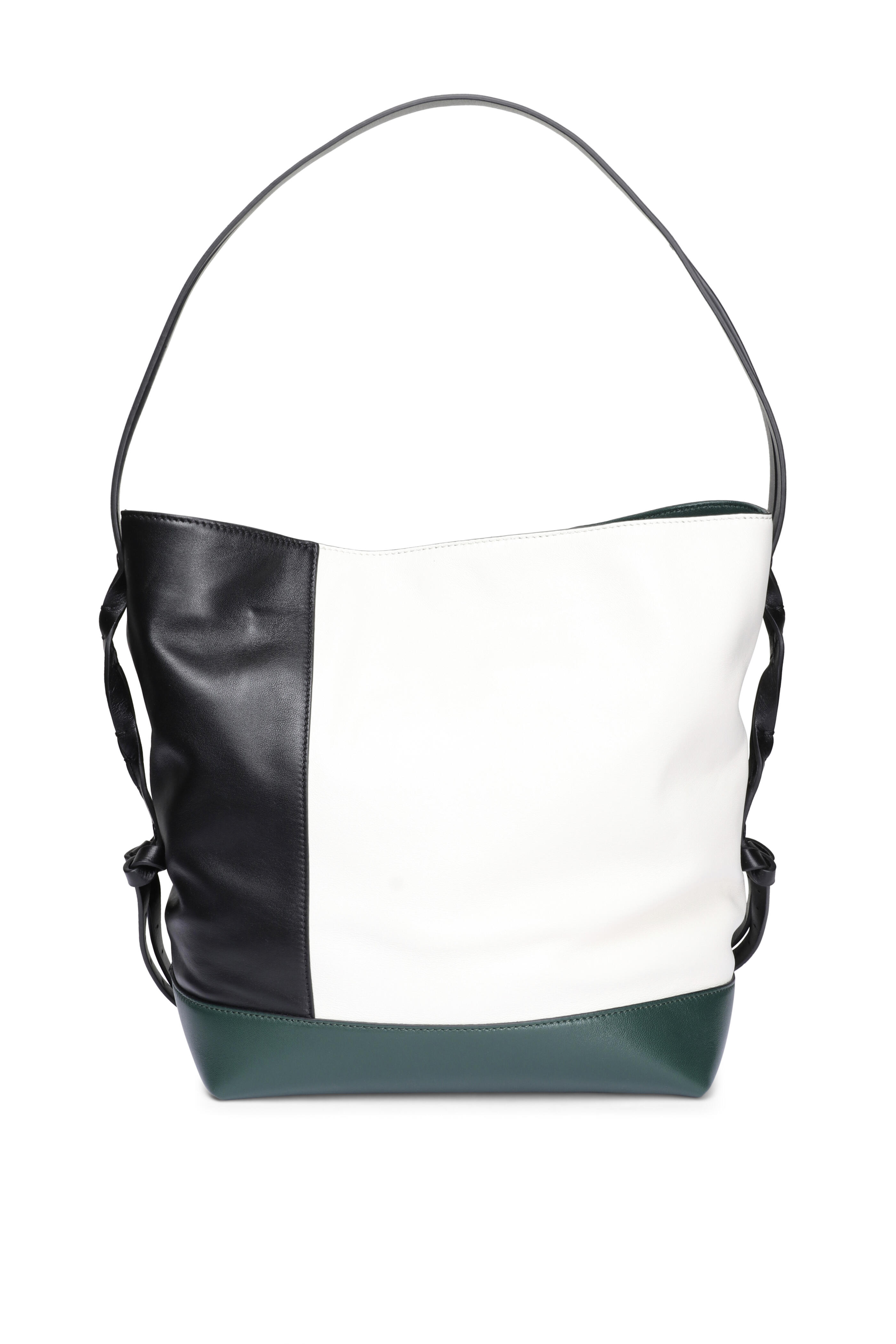 Leather. Top magnetic closure. Single leather top handle. Interior zip pocket. Fabric lining. Gold foil logo detail. Made in Italy. Color: White/Black/Dark Petrol. Height: 11.81". Length: 9.84". Width: 5.51". Handle drop: 7.87".