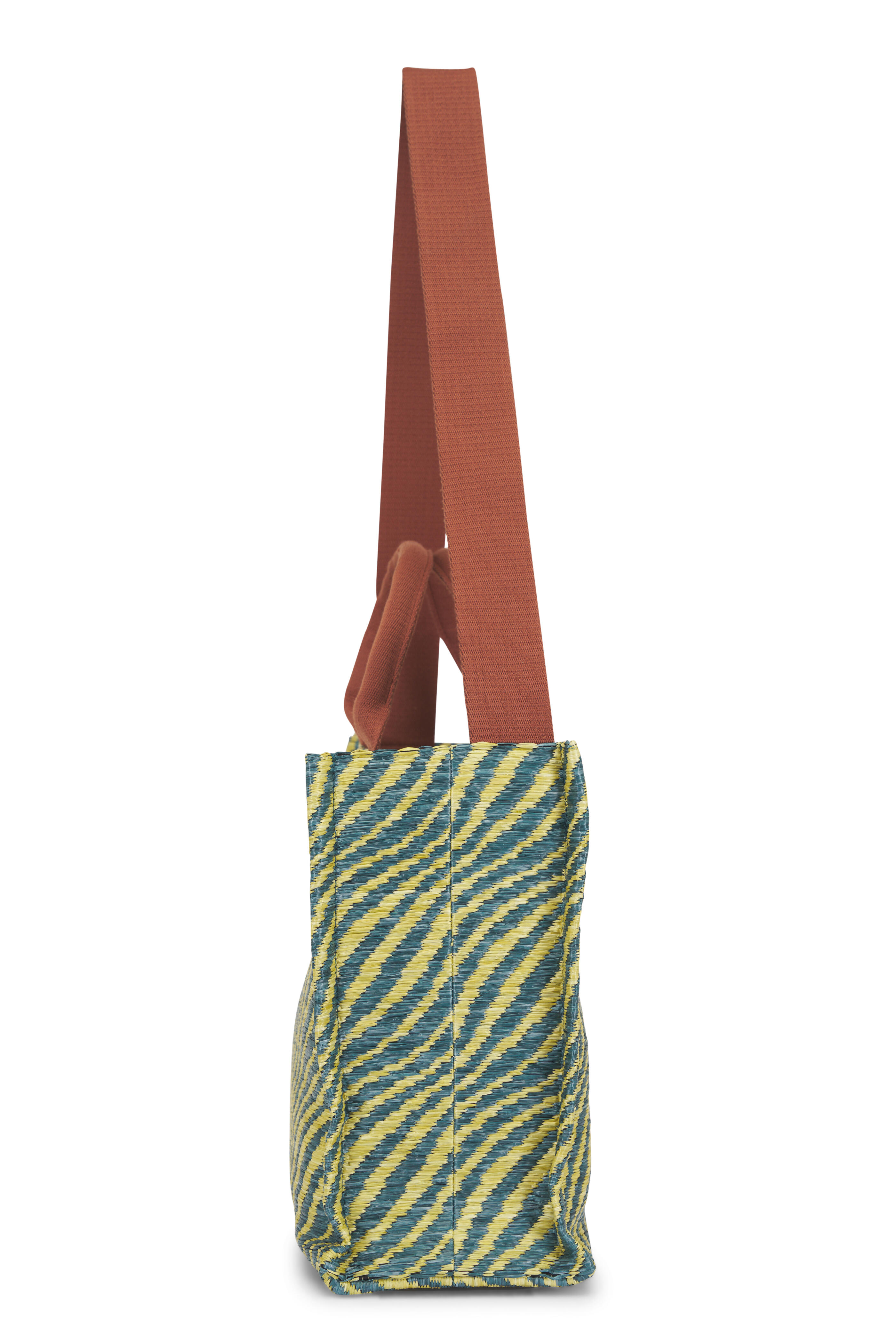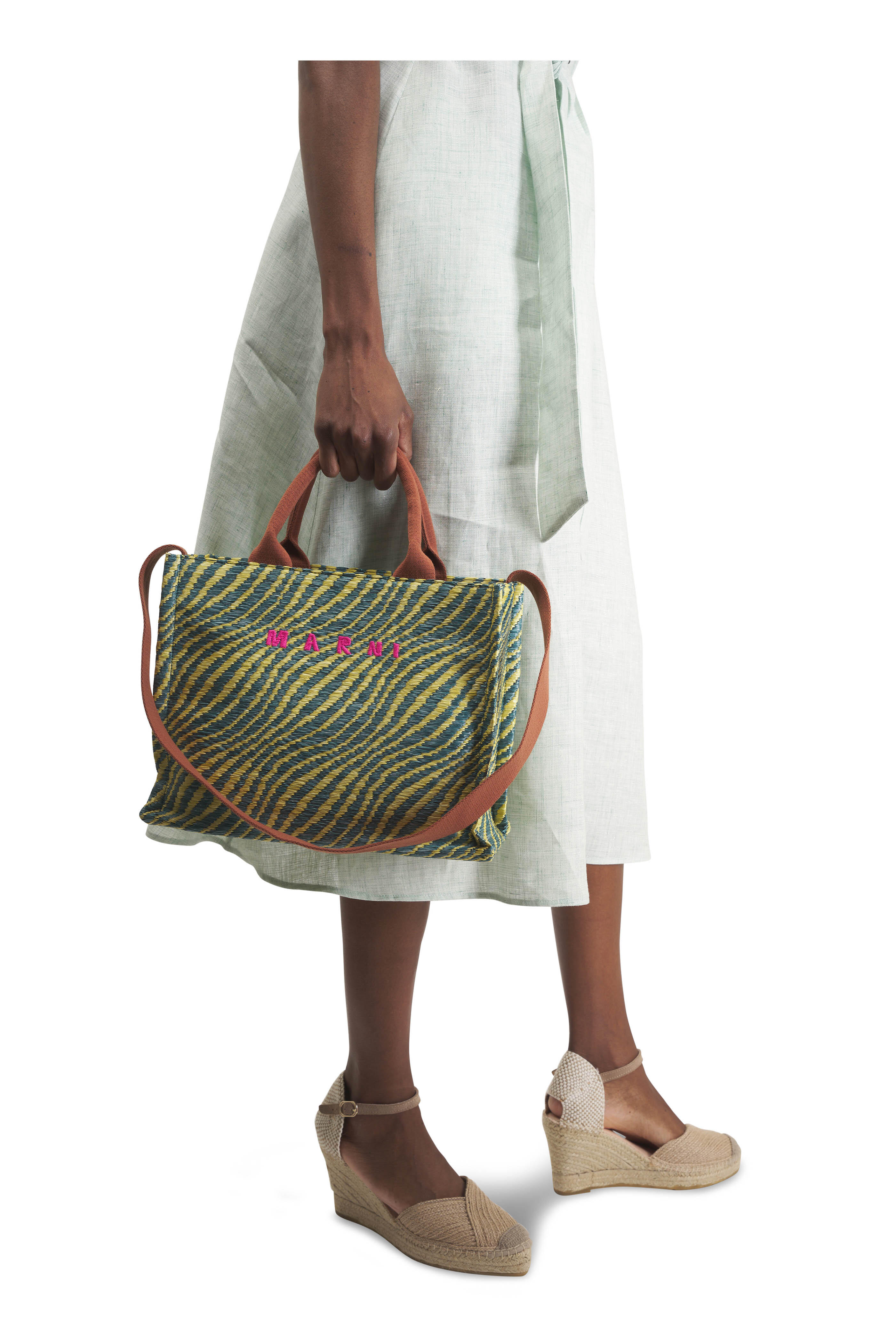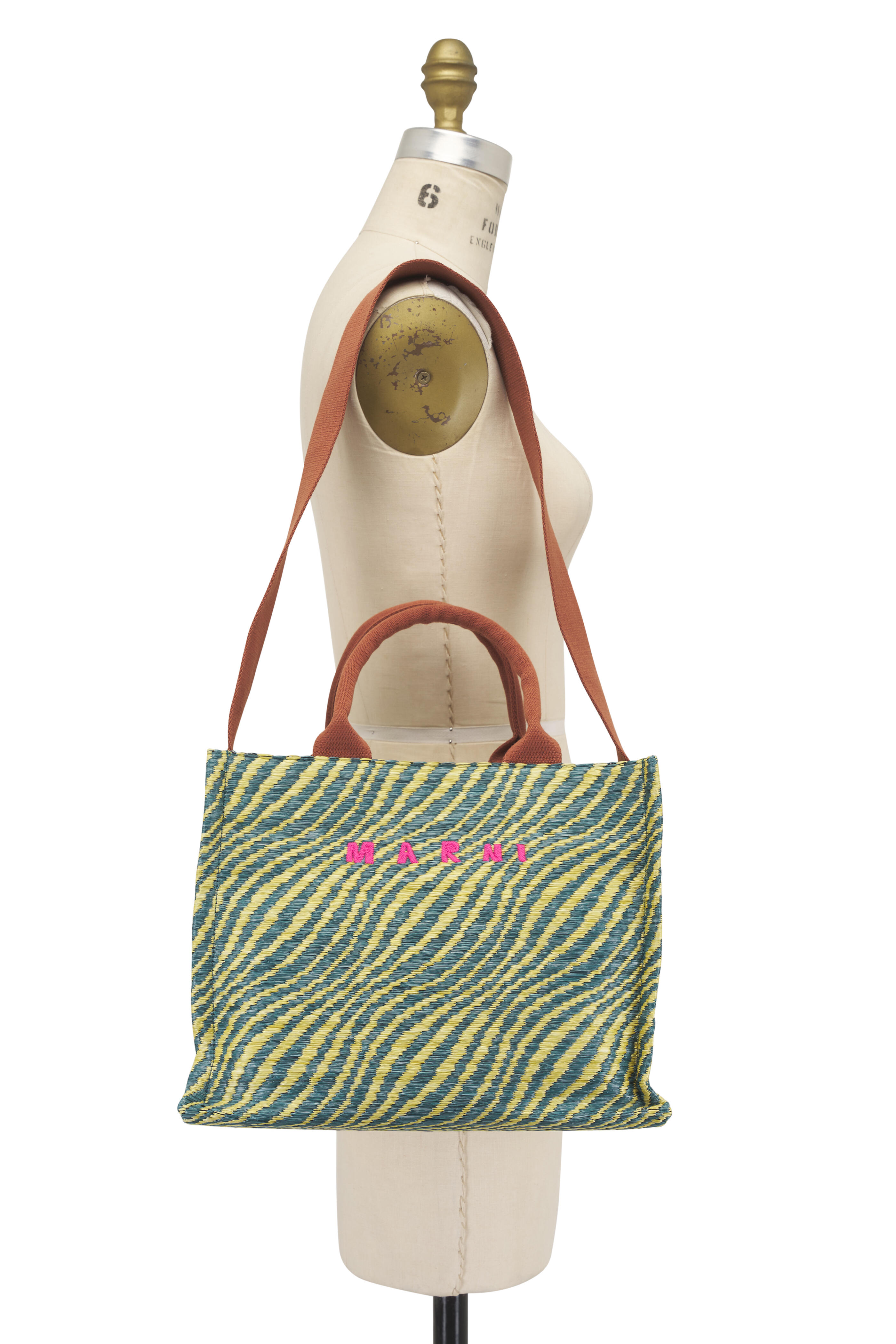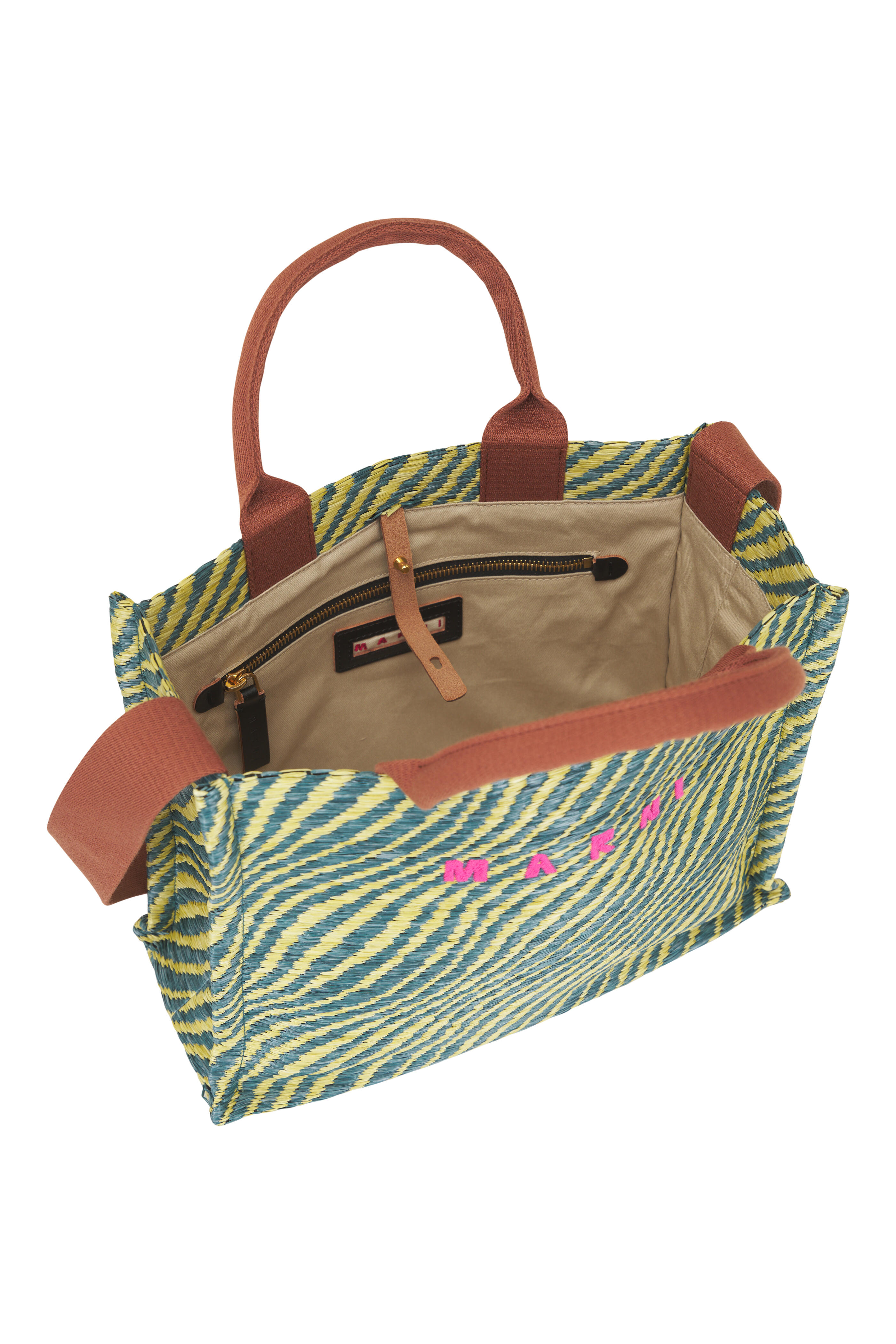 Open top; bride-tab closure. Dual cotton handles and shoulder strap. Embroidered Marni logo on the front. Interior wall zipper pocket. Made in Italy. Height: 9.65". Length: 12.6". Width: 5.51". Handle drop: 4.92". Shoulder strap drop: 32.68". 83% Polyamide Nylon 17% Polyester upper. 95% Cotton 5% Acrylic lining.