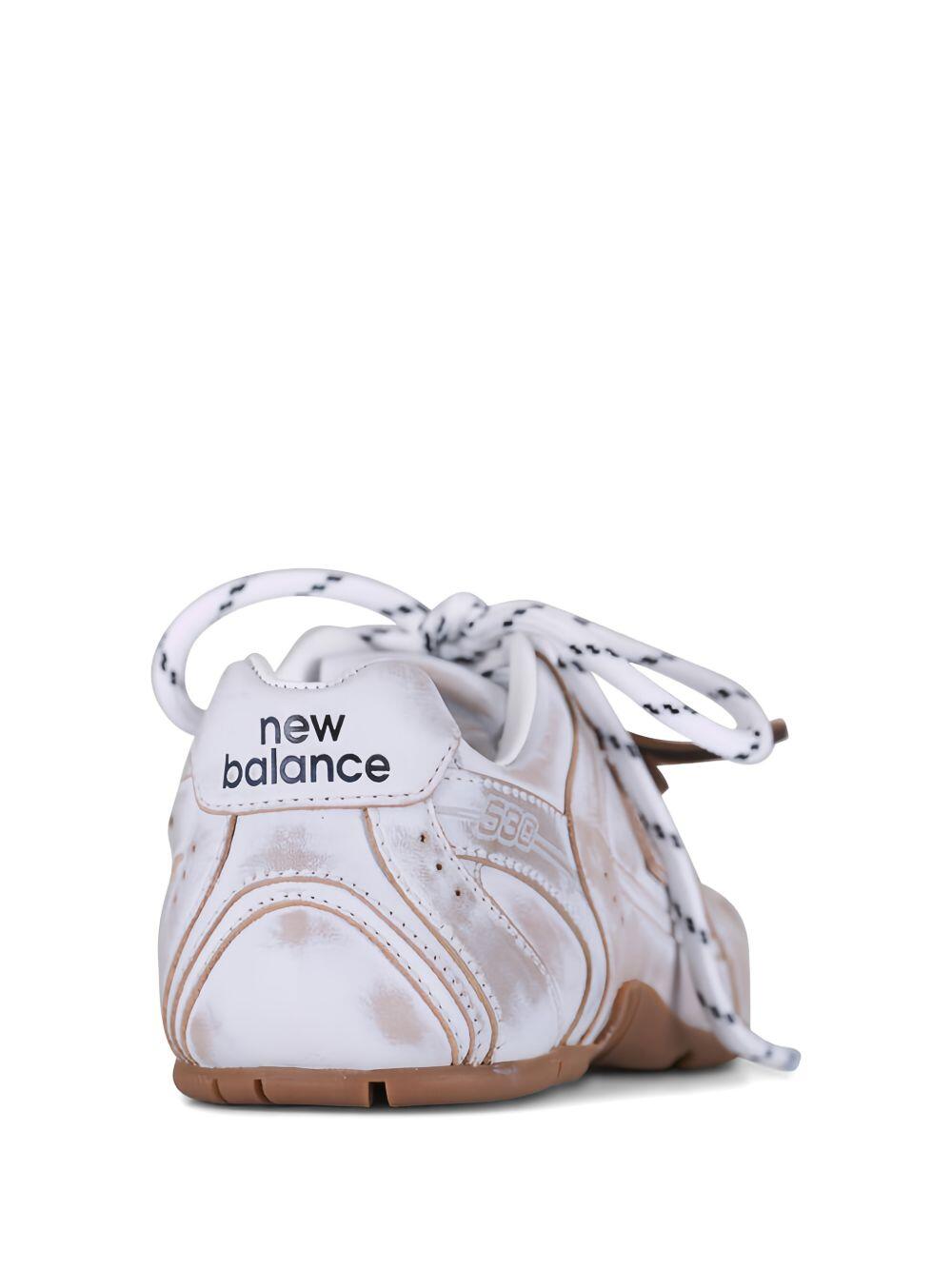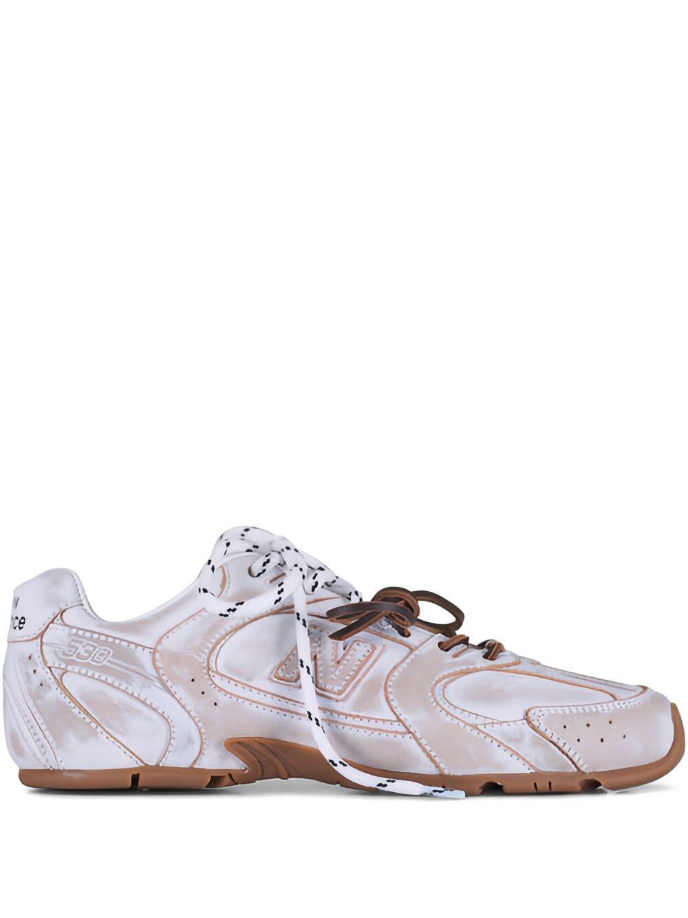 Leather upper. Round toe. Lace up closure; cotton and leather laces. Slip on style. Screen-printed logo on the tongue and insole. Removable fabric-covered insole; fabric lining. Rubber sole. Made in Italy. Collaboration: New Balance X Miu Miu.