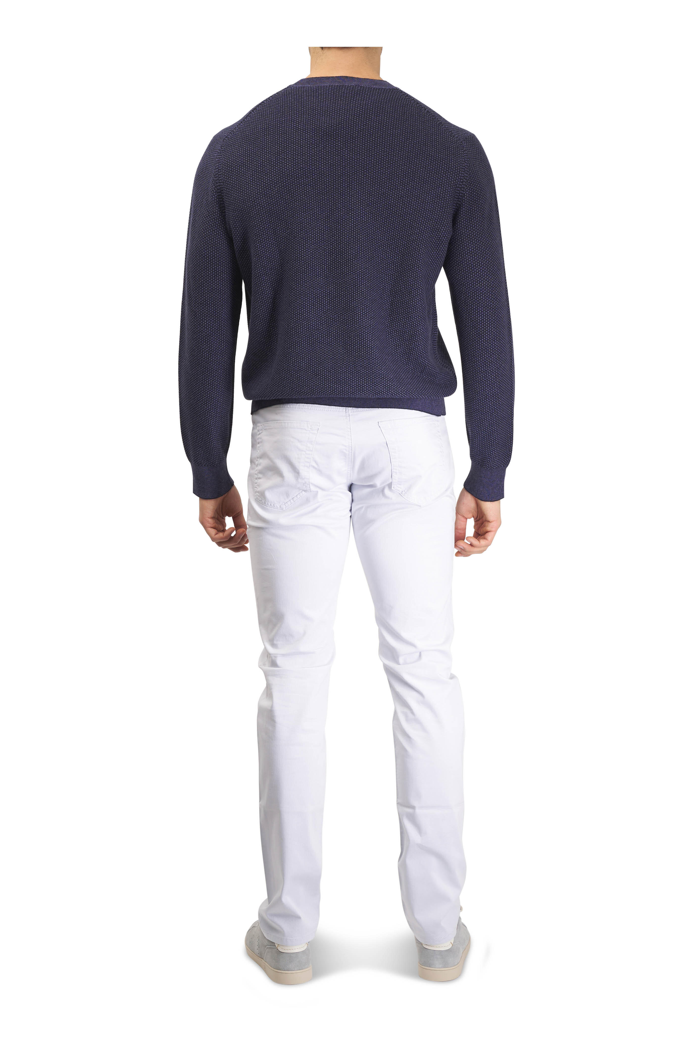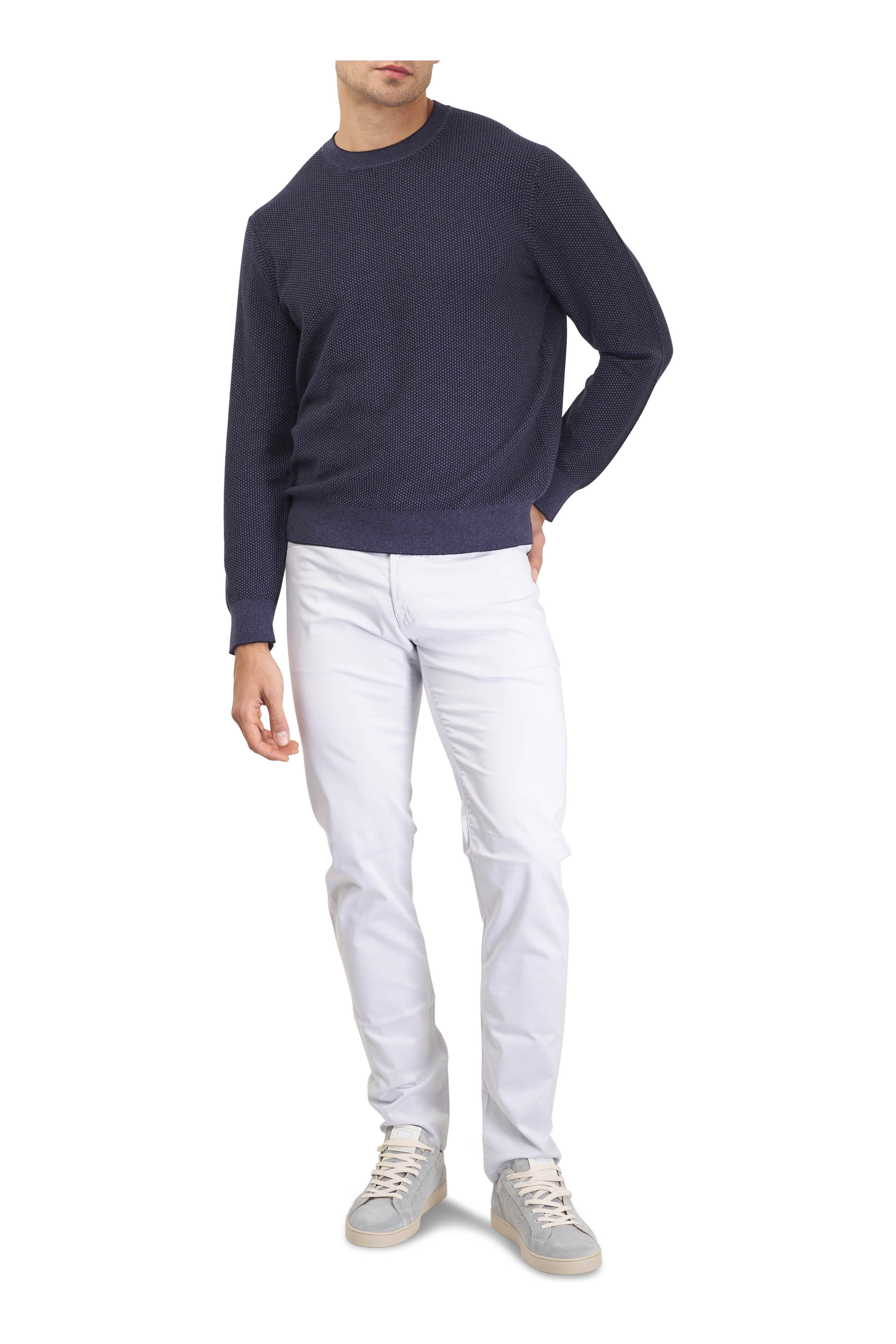 Crew neck. Rib‑knit trim at hem. Imported. 50 % wool, 45 % cotton, 5 % cashmere. Dry clean.