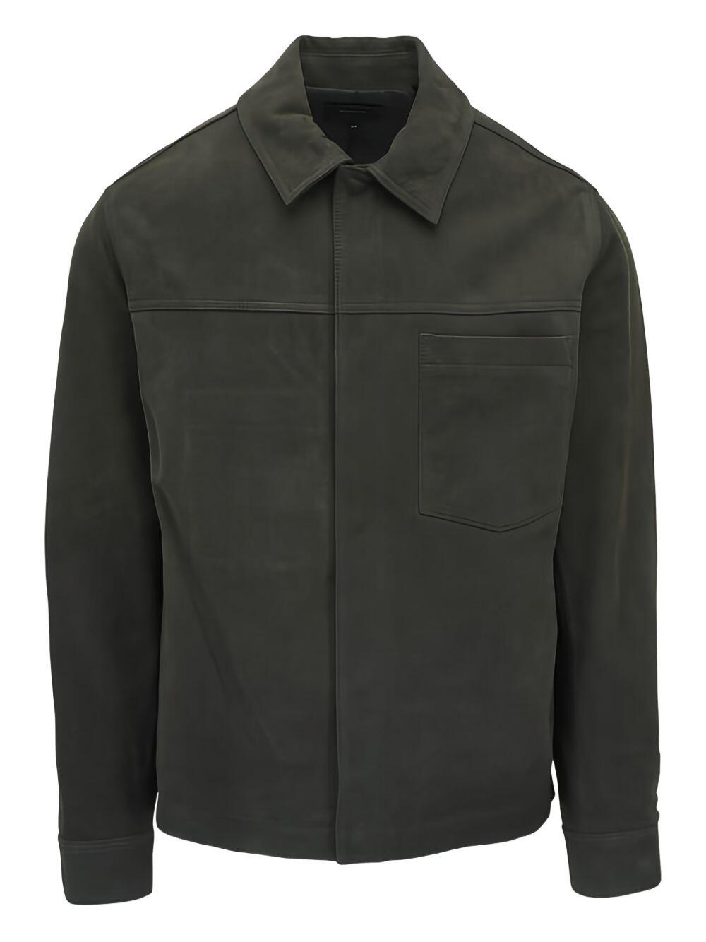 Specialist clean. Concealed front snap button packet. Side slip pockets; chest patch pocket. Single button square cuffs. Imported. 100% leather; lined.