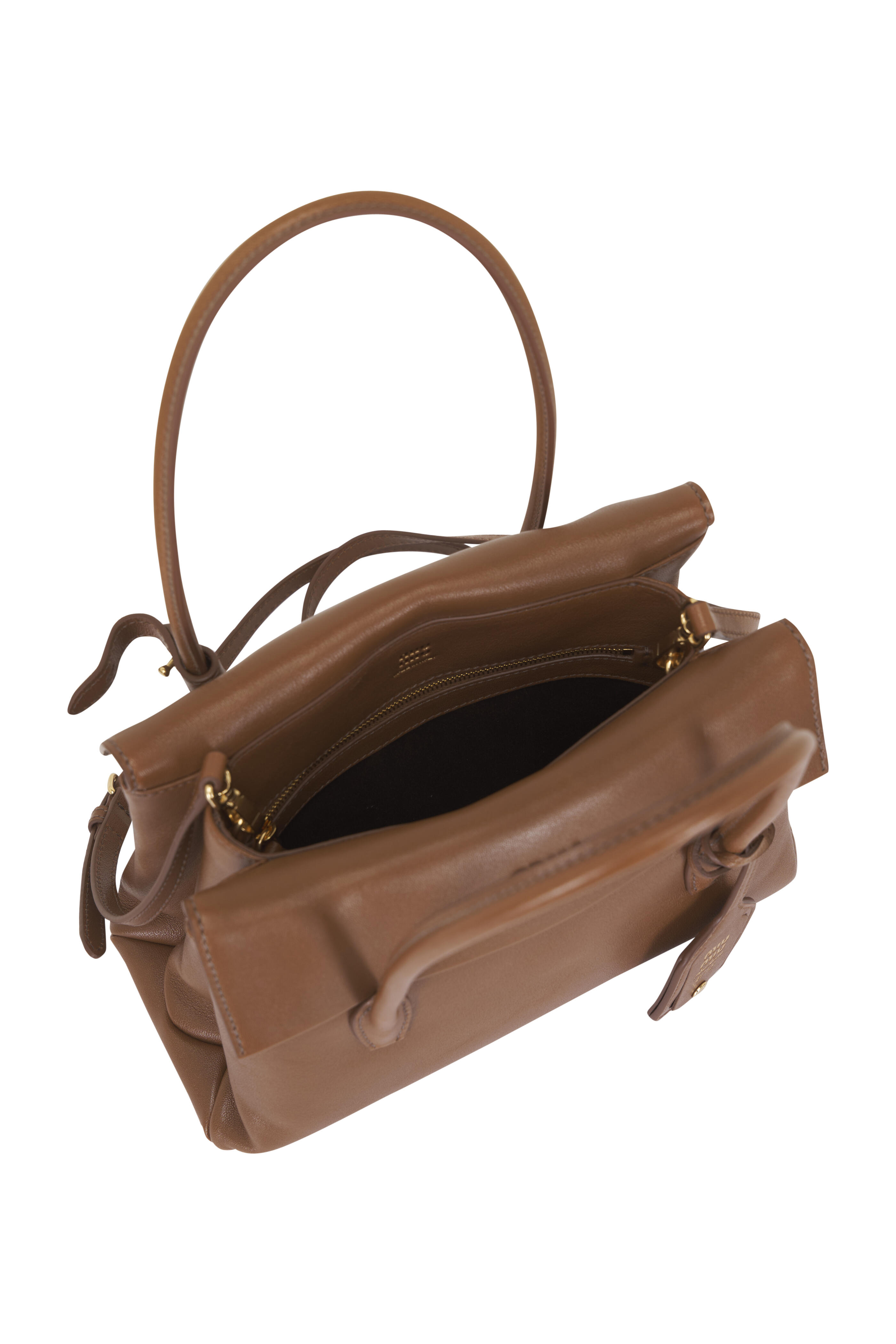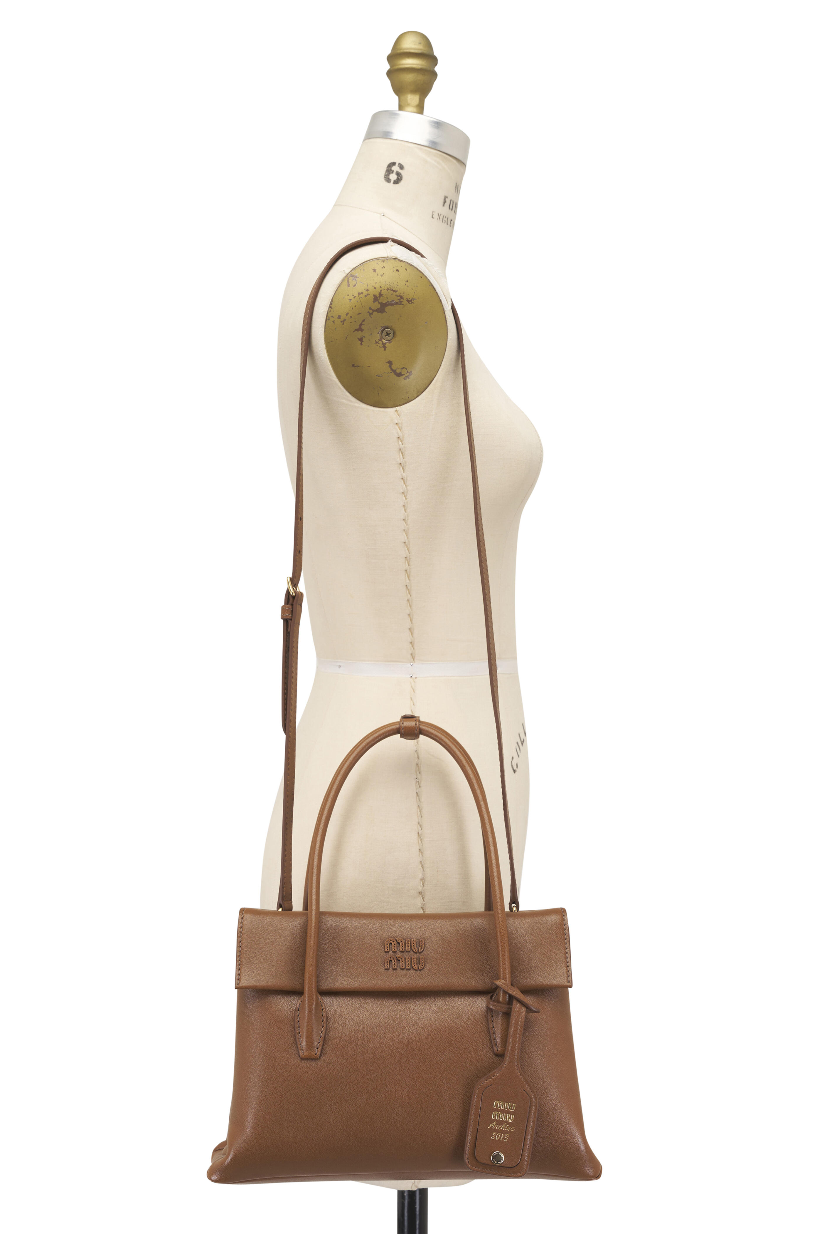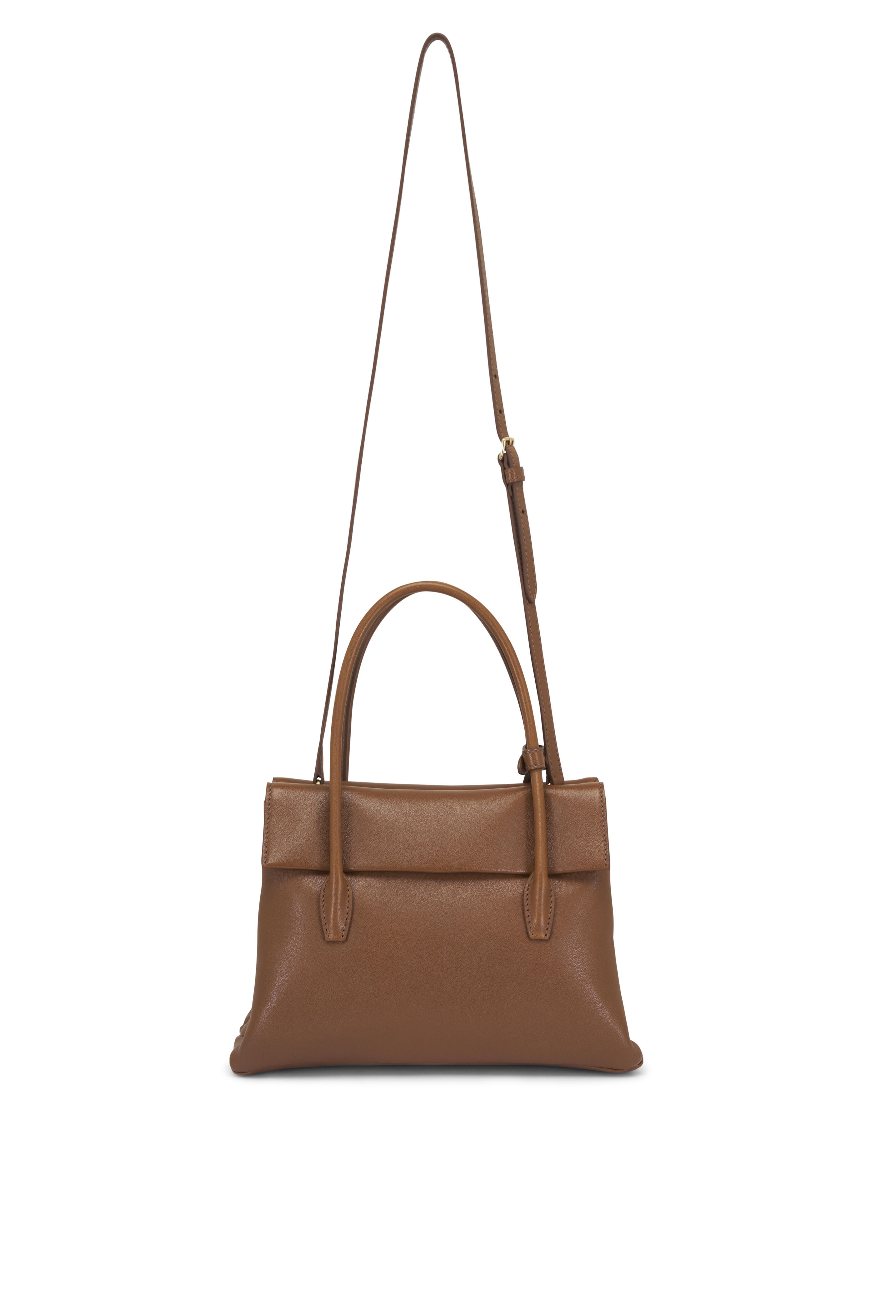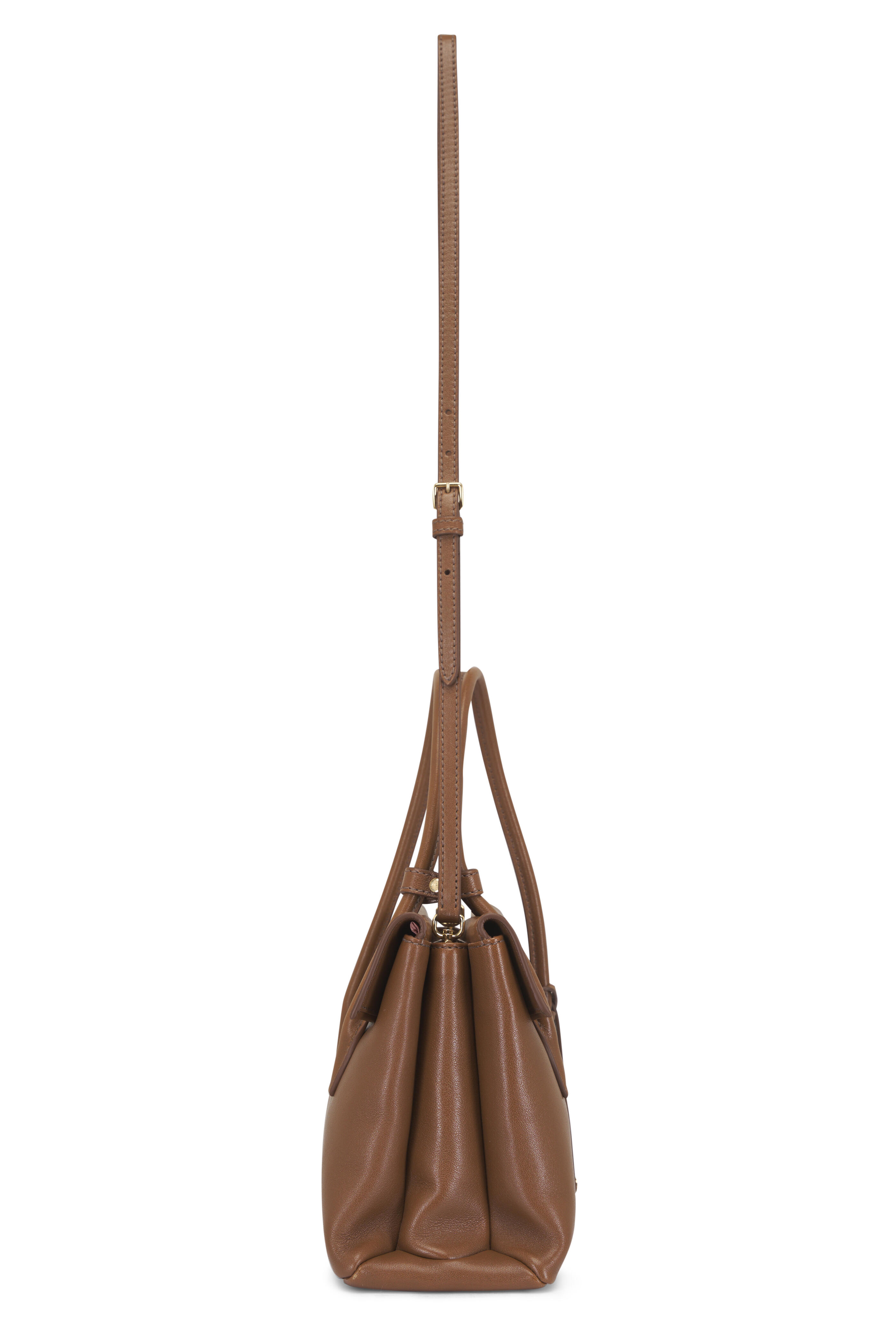 - Dual leather top handles; sliding and removable shoulder strap