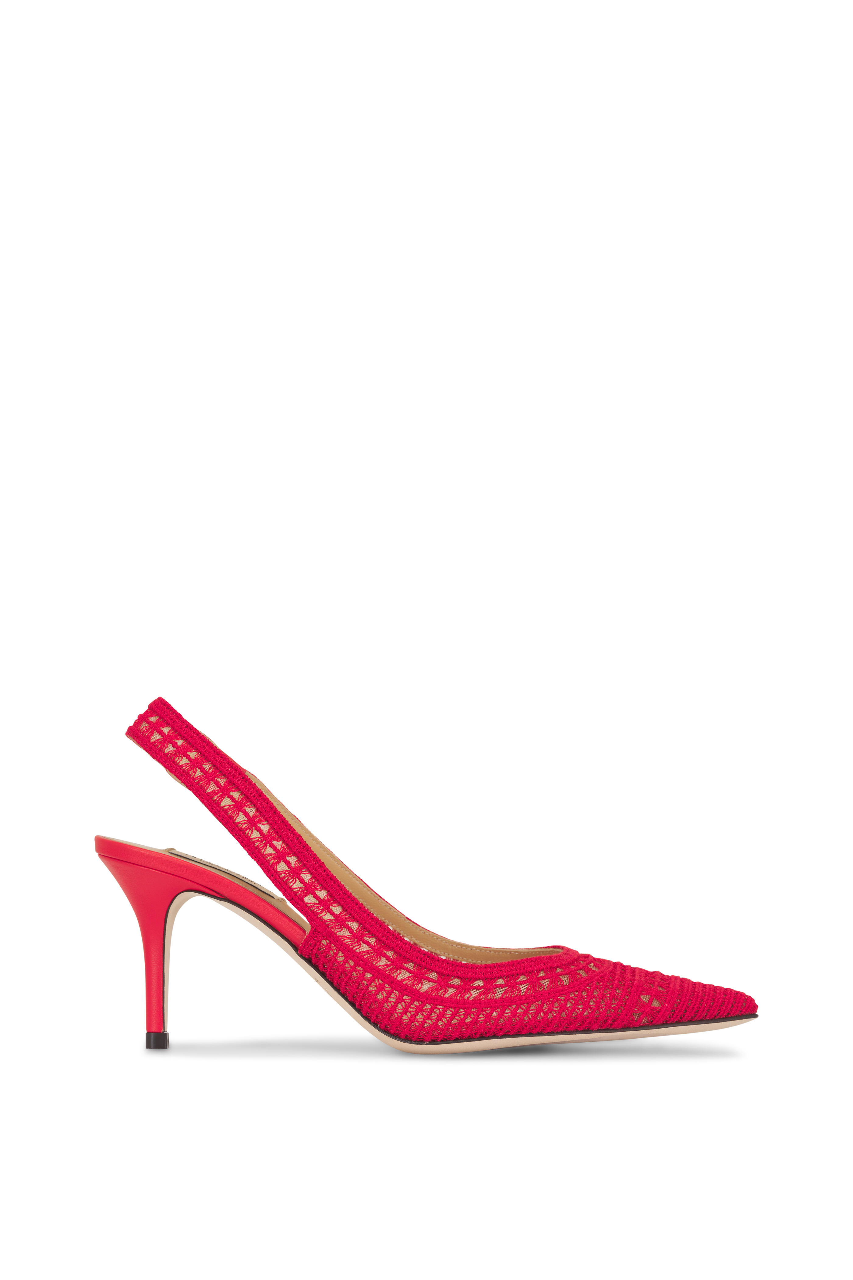 Crochet on mesh upper; leather trim. Pointed toe. Slingback. Leather insole; unlined. Leather sole. Made in Italy. Heel measurement: 75mm. True to size.