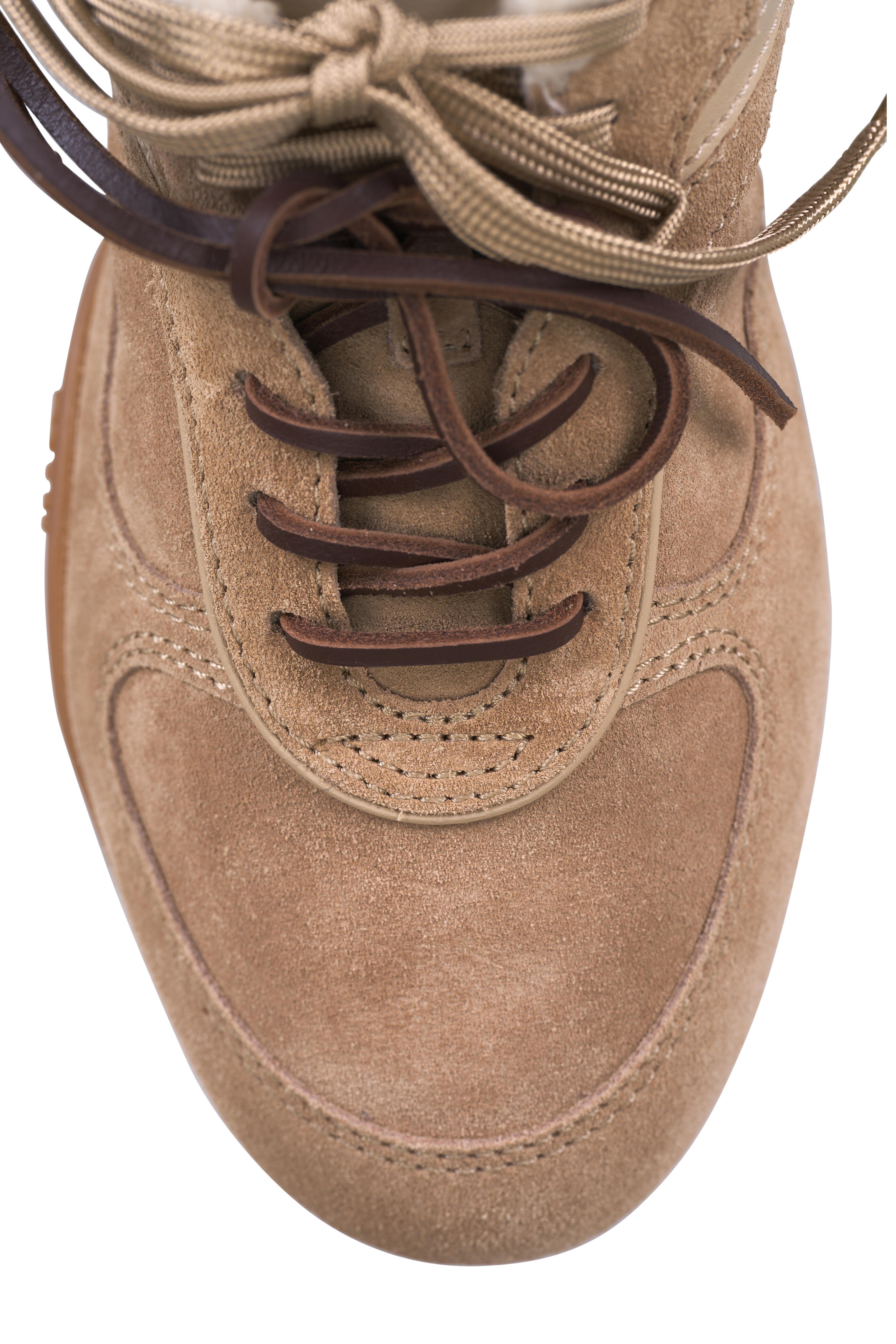 Suede upper. Tapered toe. Double lace up closure. Shearling lining and insole. Rubber sole. Made in Italy.