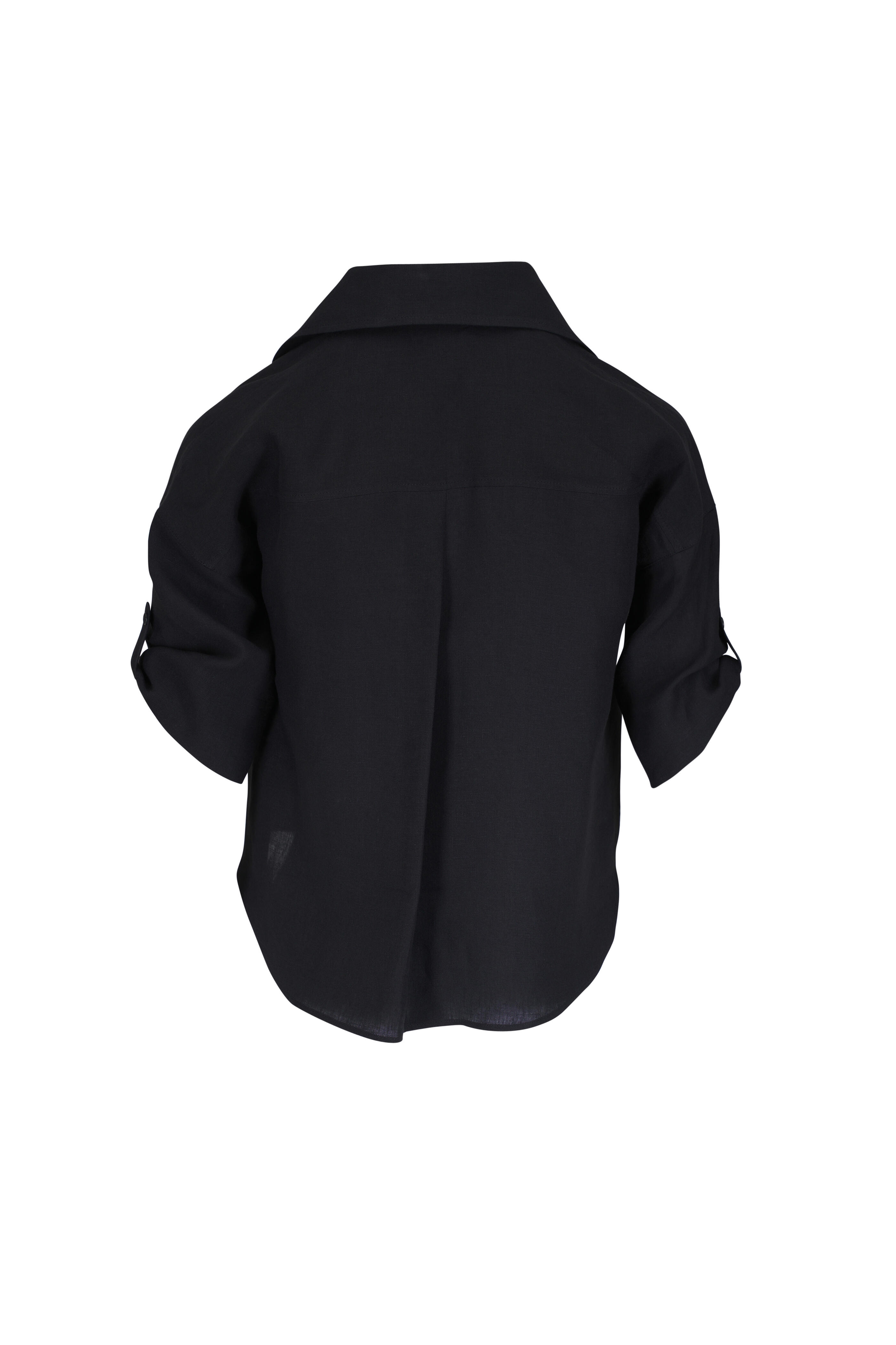 Linen. Spread collar. Short tabbed sleeves. Inverted back pleat. Relaxed fit. Button front closure. Imported. Dry clean.