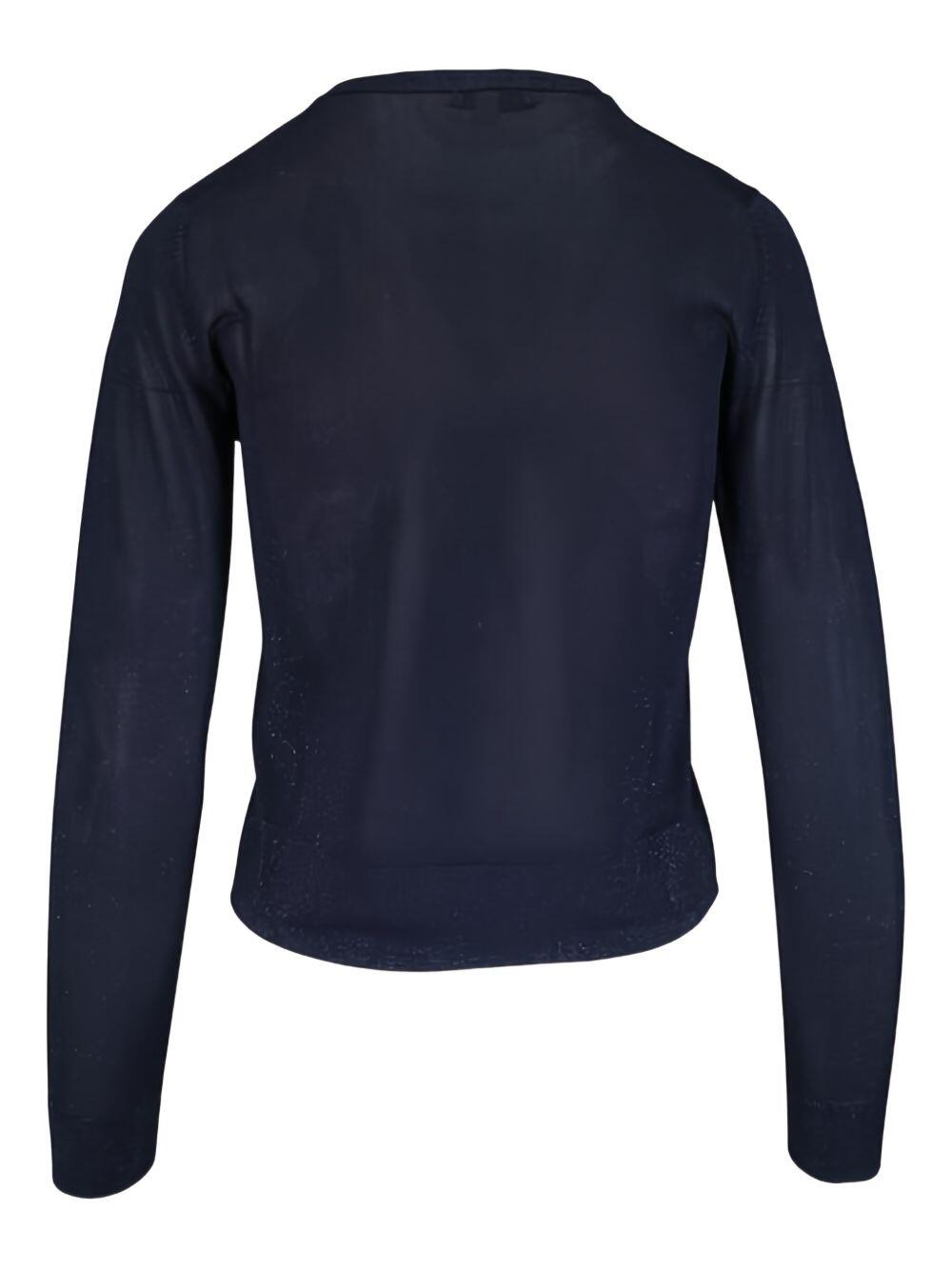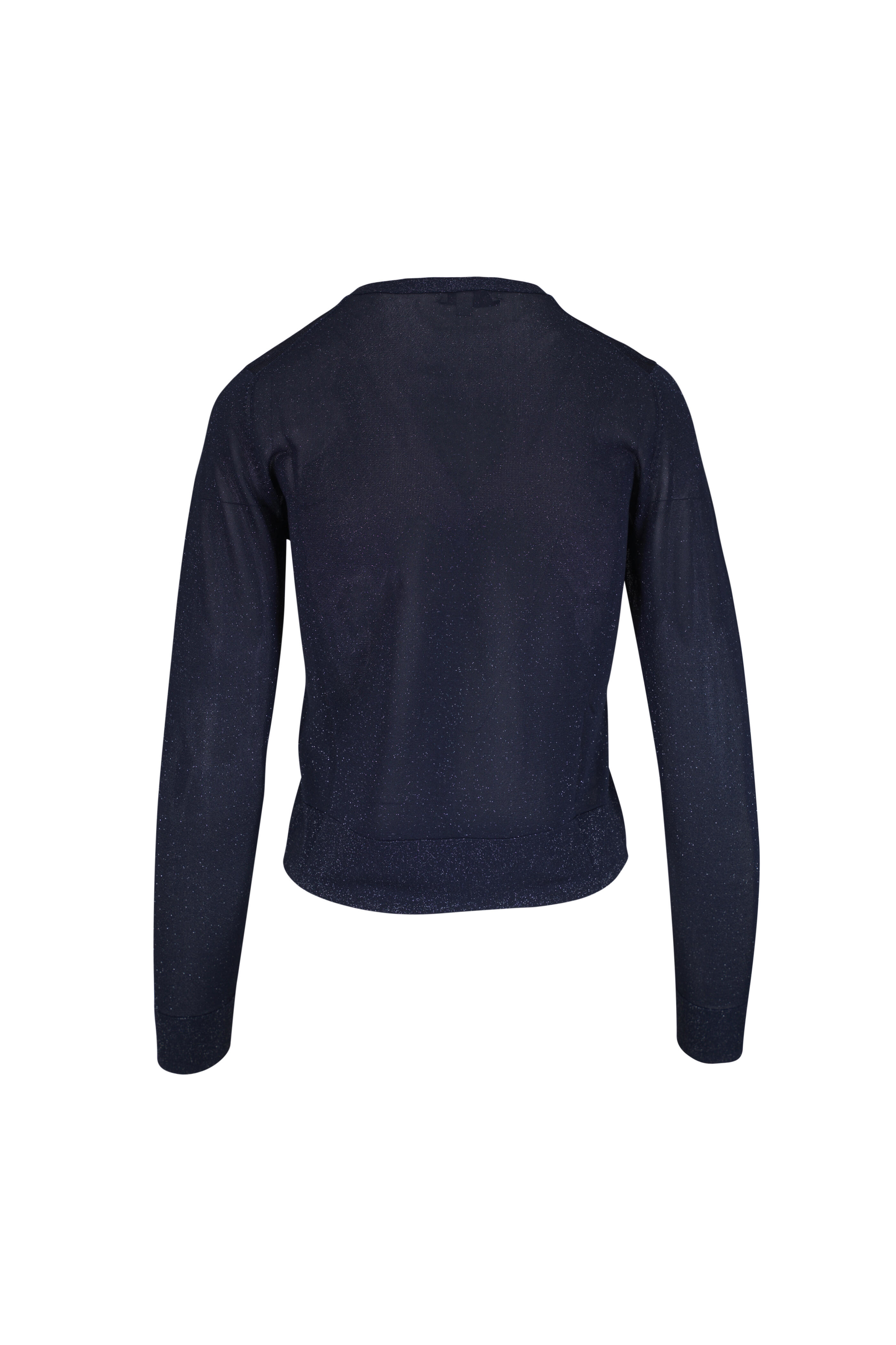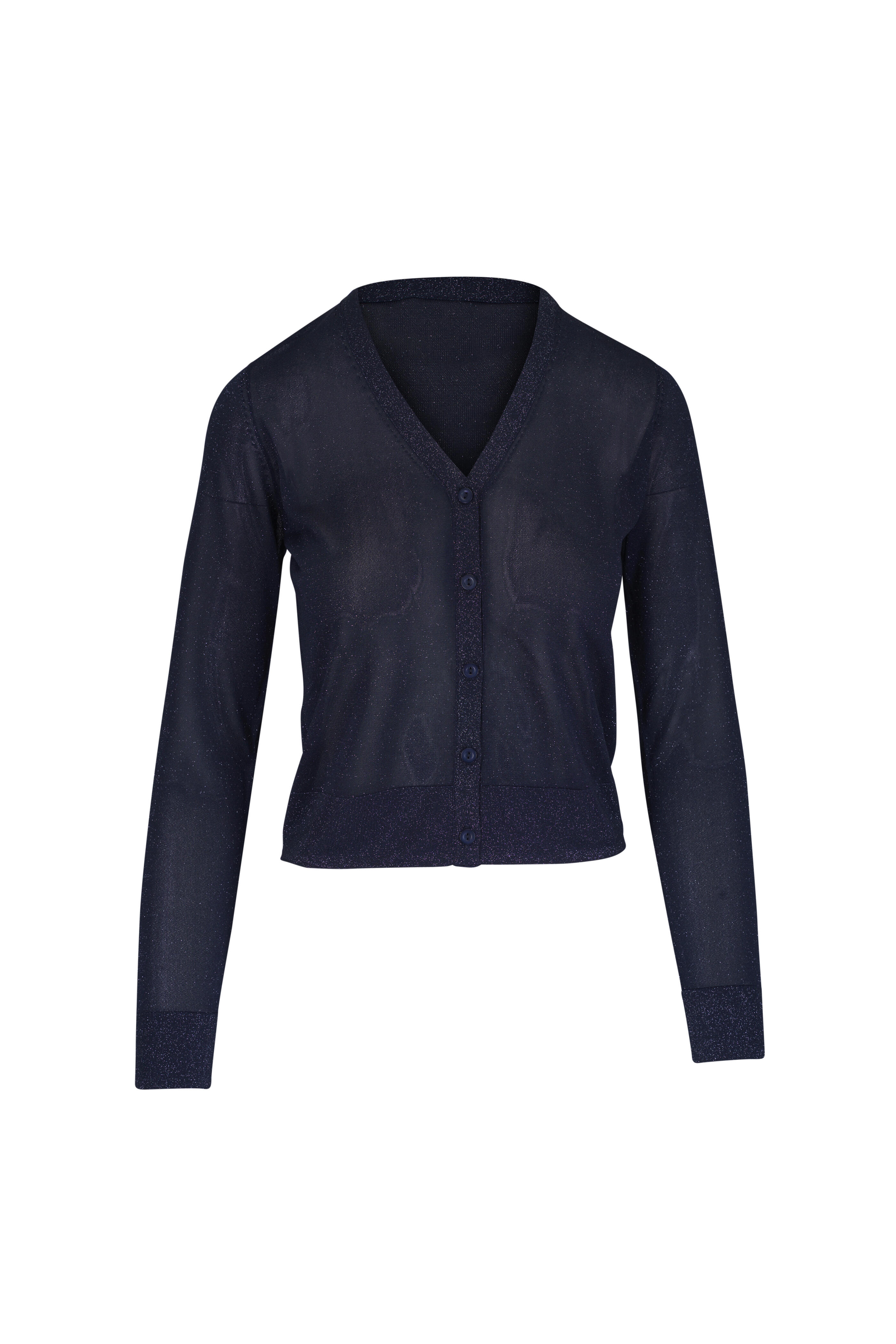 V-neckline. Front button placket. Ribbed knit trim. Imported. Approximately 20" shoulder to hem (measurements taken from size XS). 95% viscose, 5% metallic fiber. Dry clean.