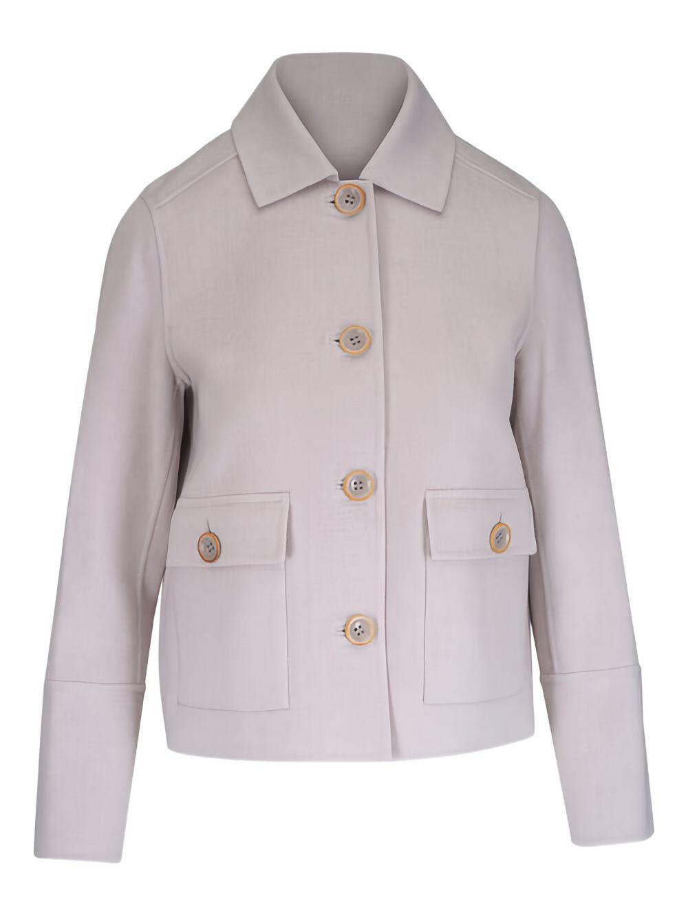Spread collar. Front button placket. Lower buttoned patch pockets. Three button cuffs. Pleat at back. Imported. Approximately 21" shoulder to hem (measurements taken from size XS). 70% wool, 30% cashmere. Dry clean.