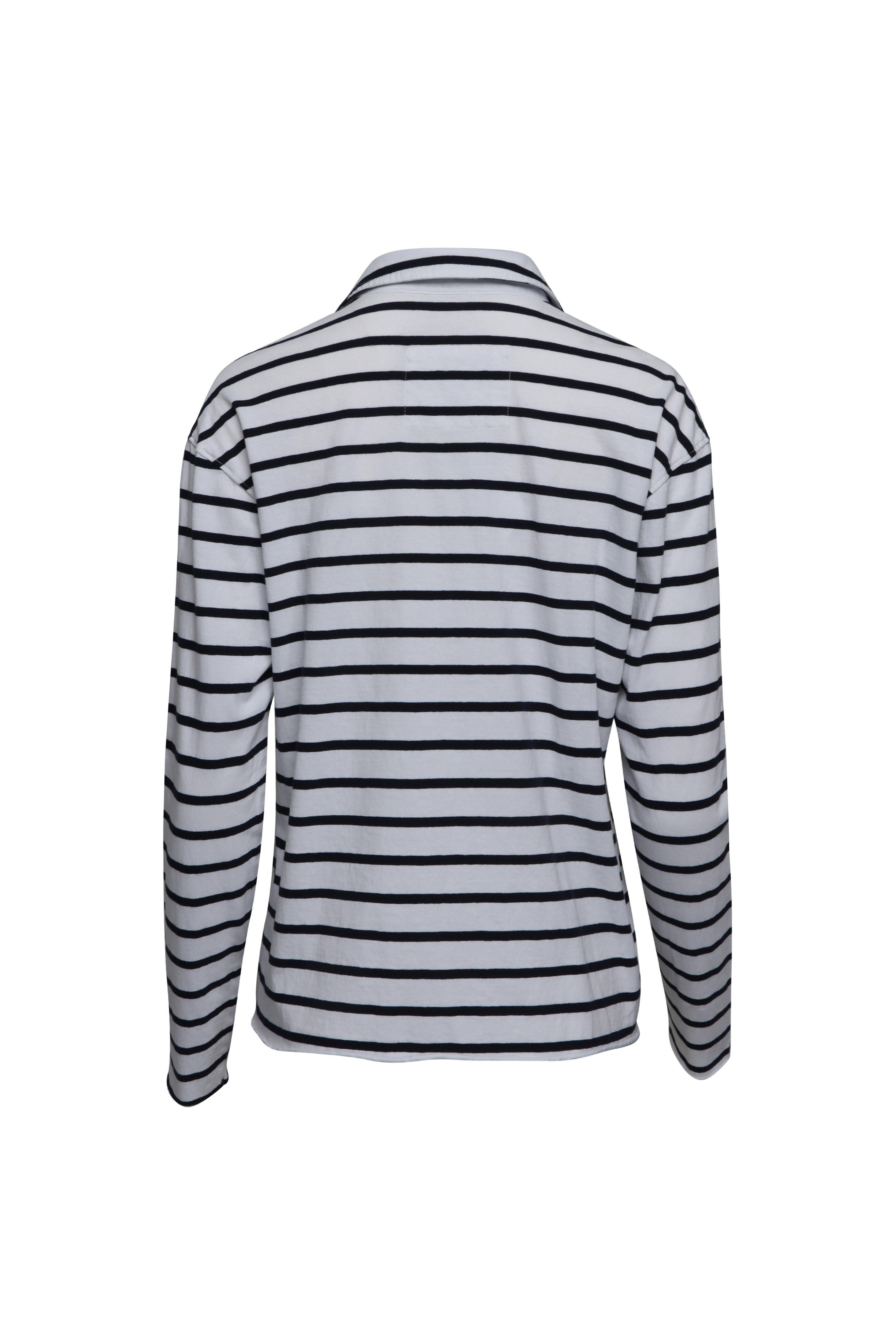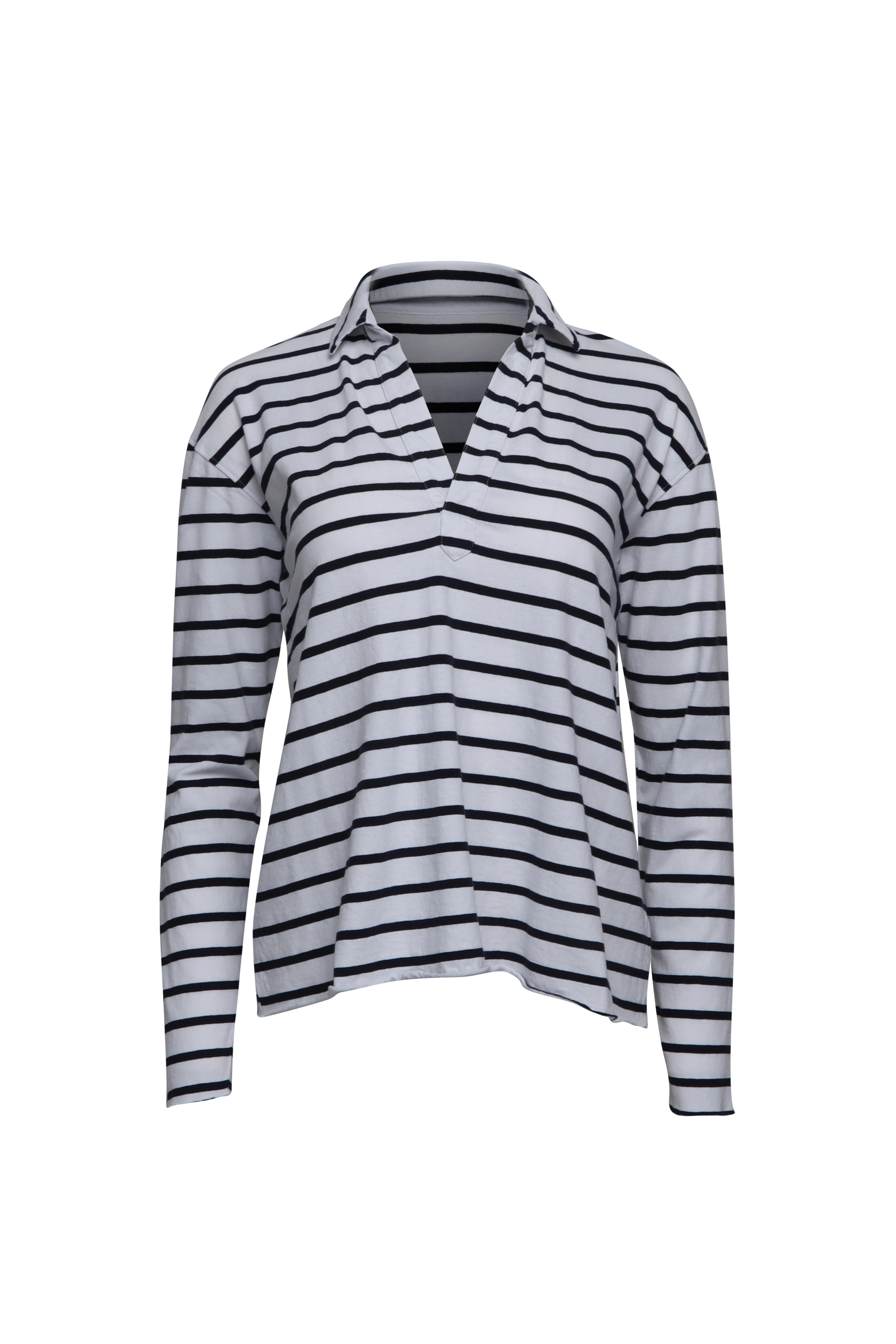 Collar. V neck. Drop shoulders. Long sleeves. Relaxed fit. Raw trim. Jersey fabrication. Made in USA. Bust 35” (Size S). 100% cotton. Machine washable.