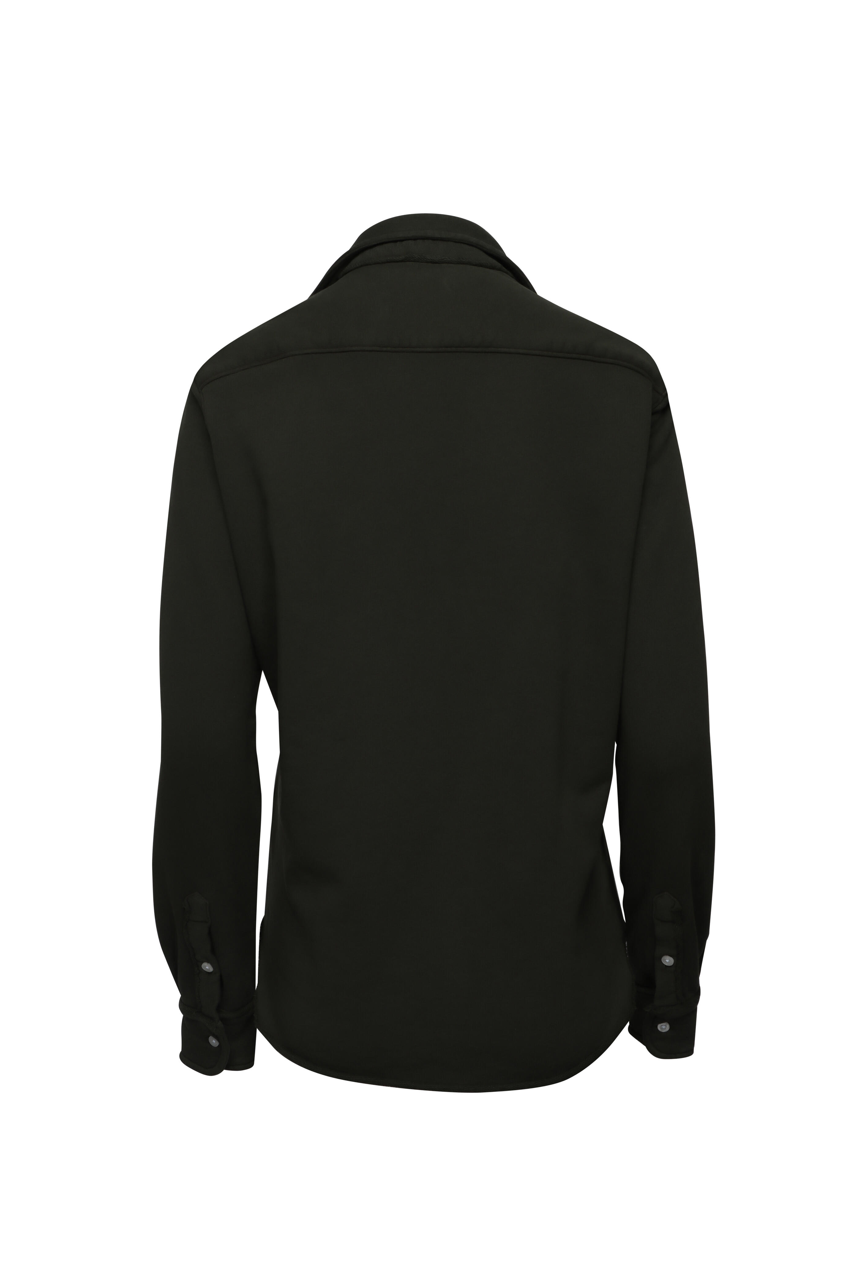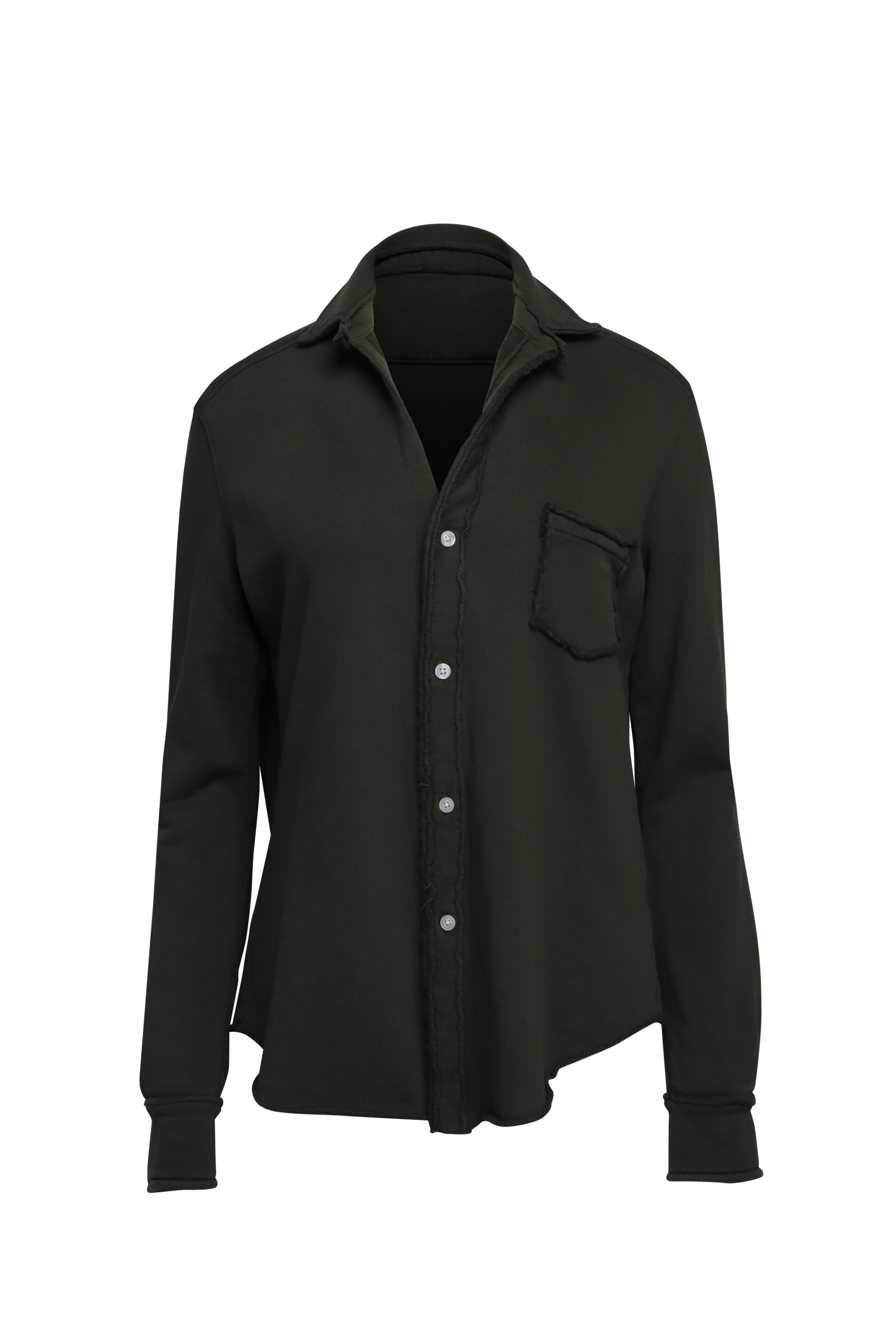Collar. Long sleeves. V neck. Button up front closure. Single chest patch pocket. Relaxed fit. Rounded hem. Raw trims. Fleece fabrication. Made in USA. Bust 35” (Size S). 100% cotton. Machine washable.