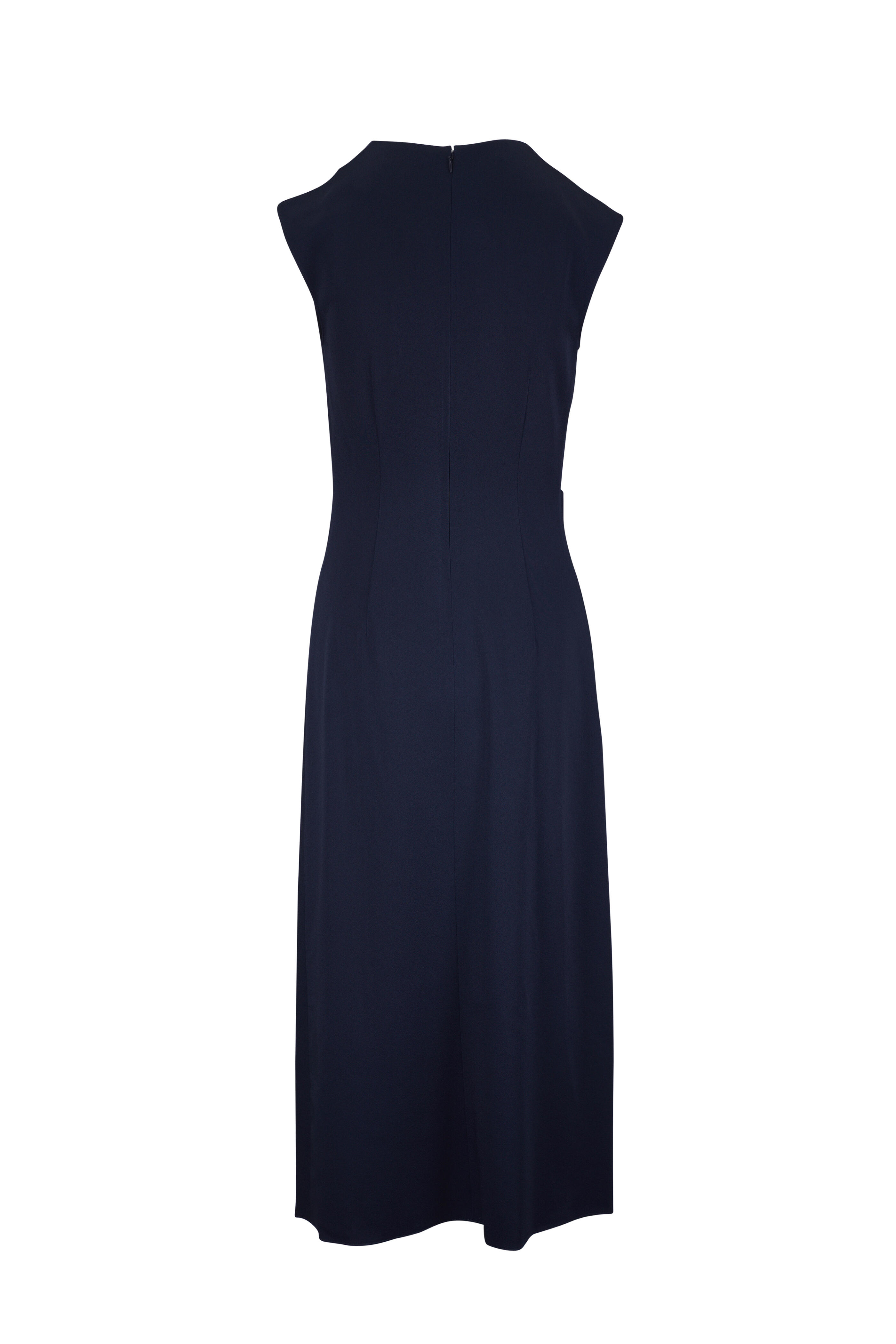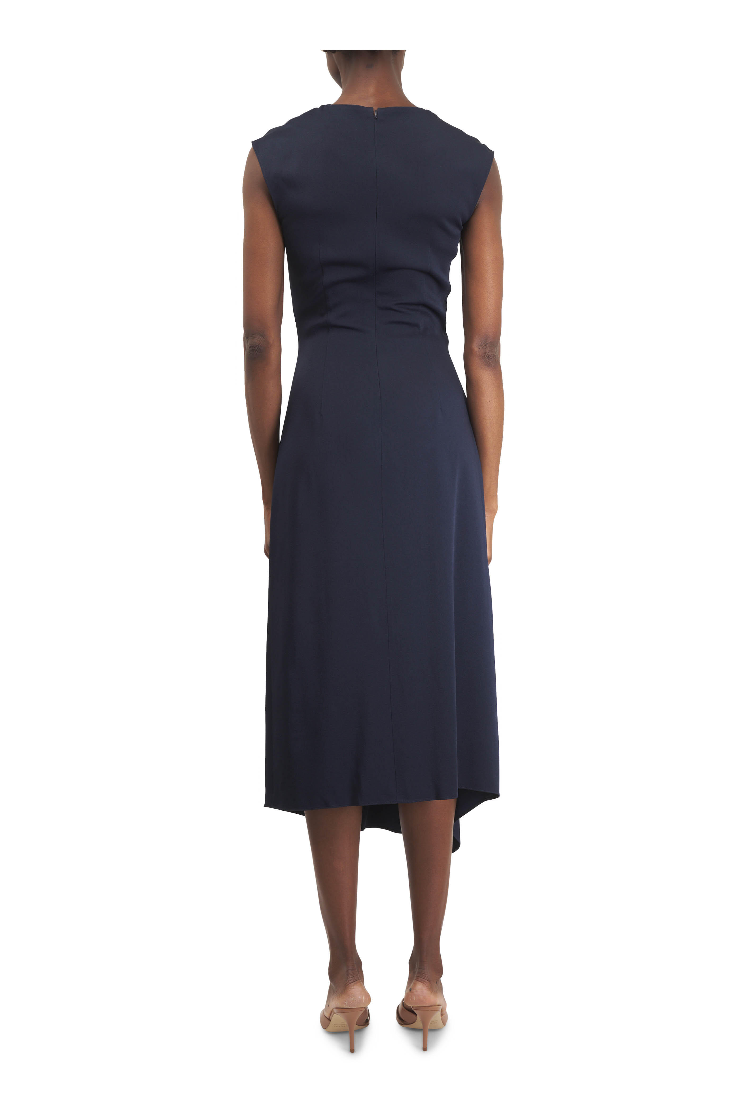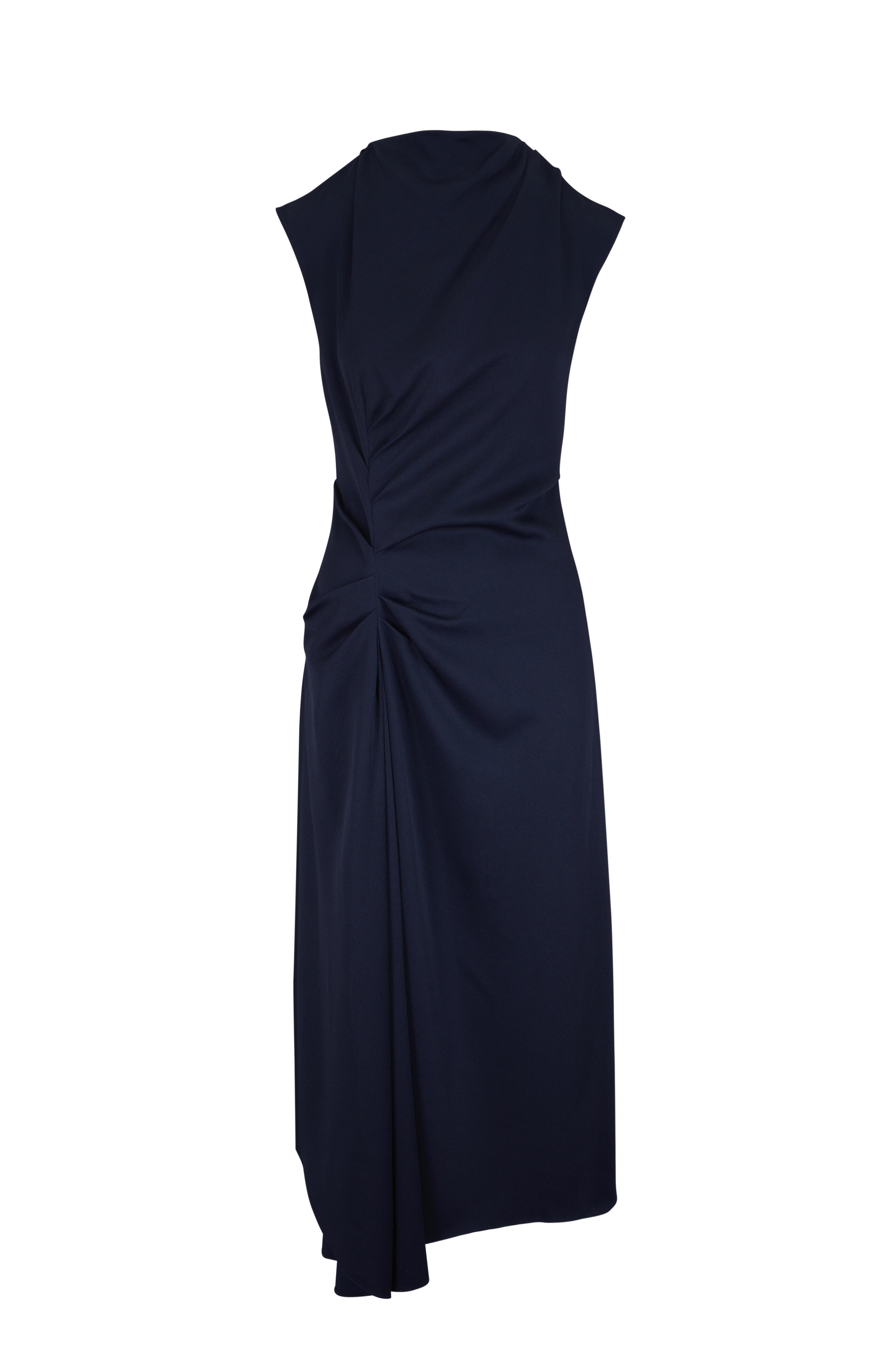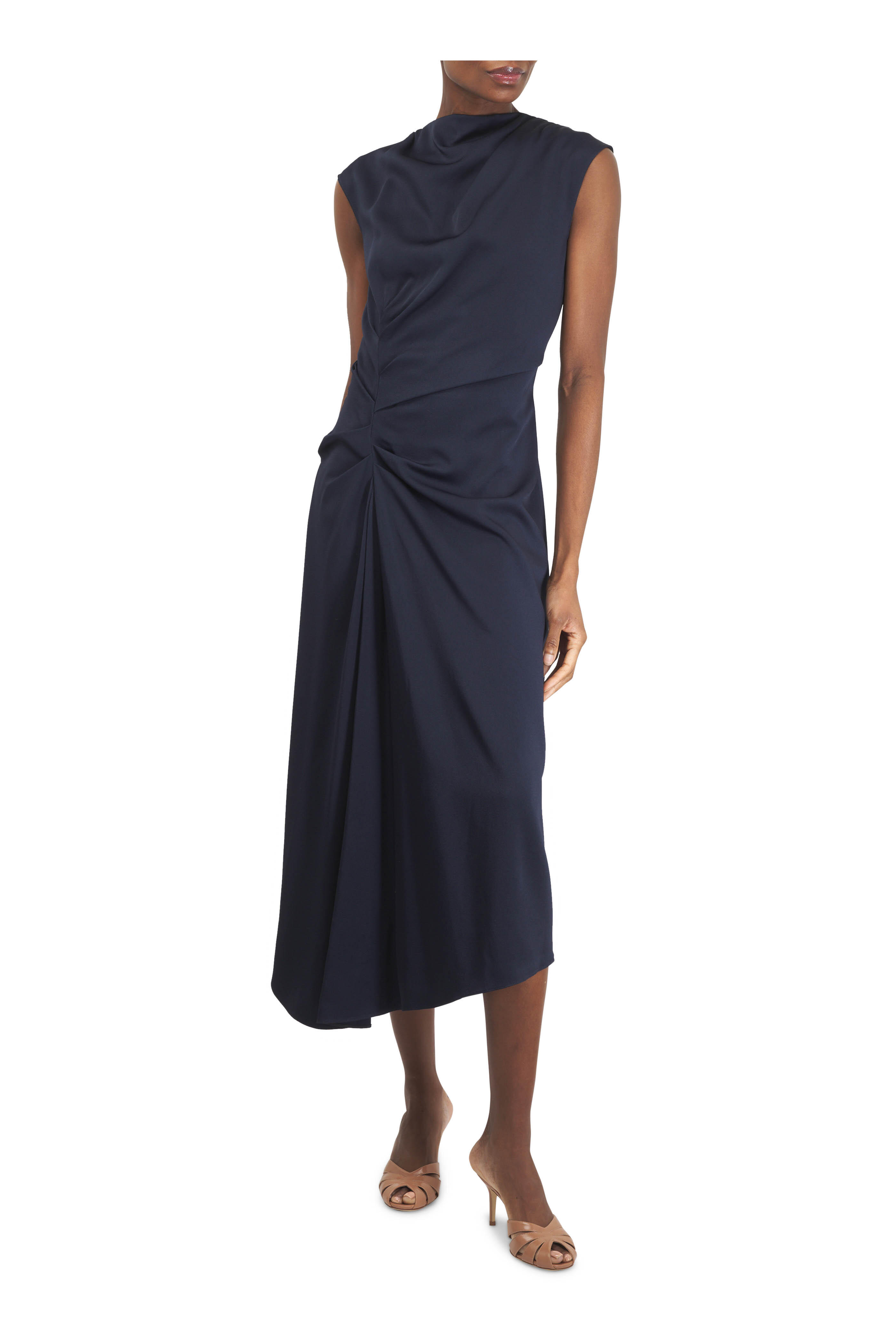 Subtle cowl neckline. Concealed back zip closure. Asymmetric hem. Fluid ruching detailing. Made in Italy. Mid-calf length. 69% acetate, 31% viscose. Dry clean.