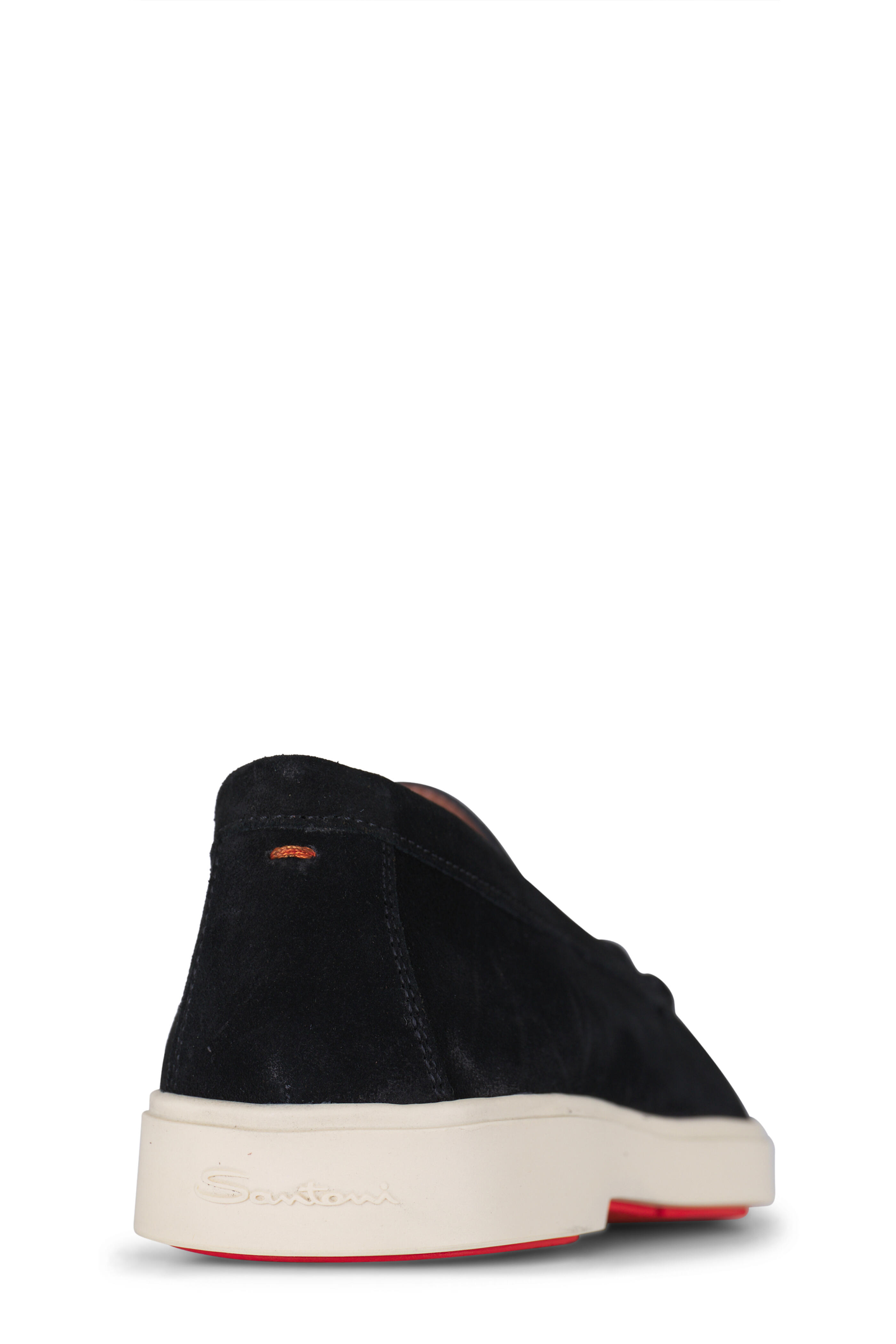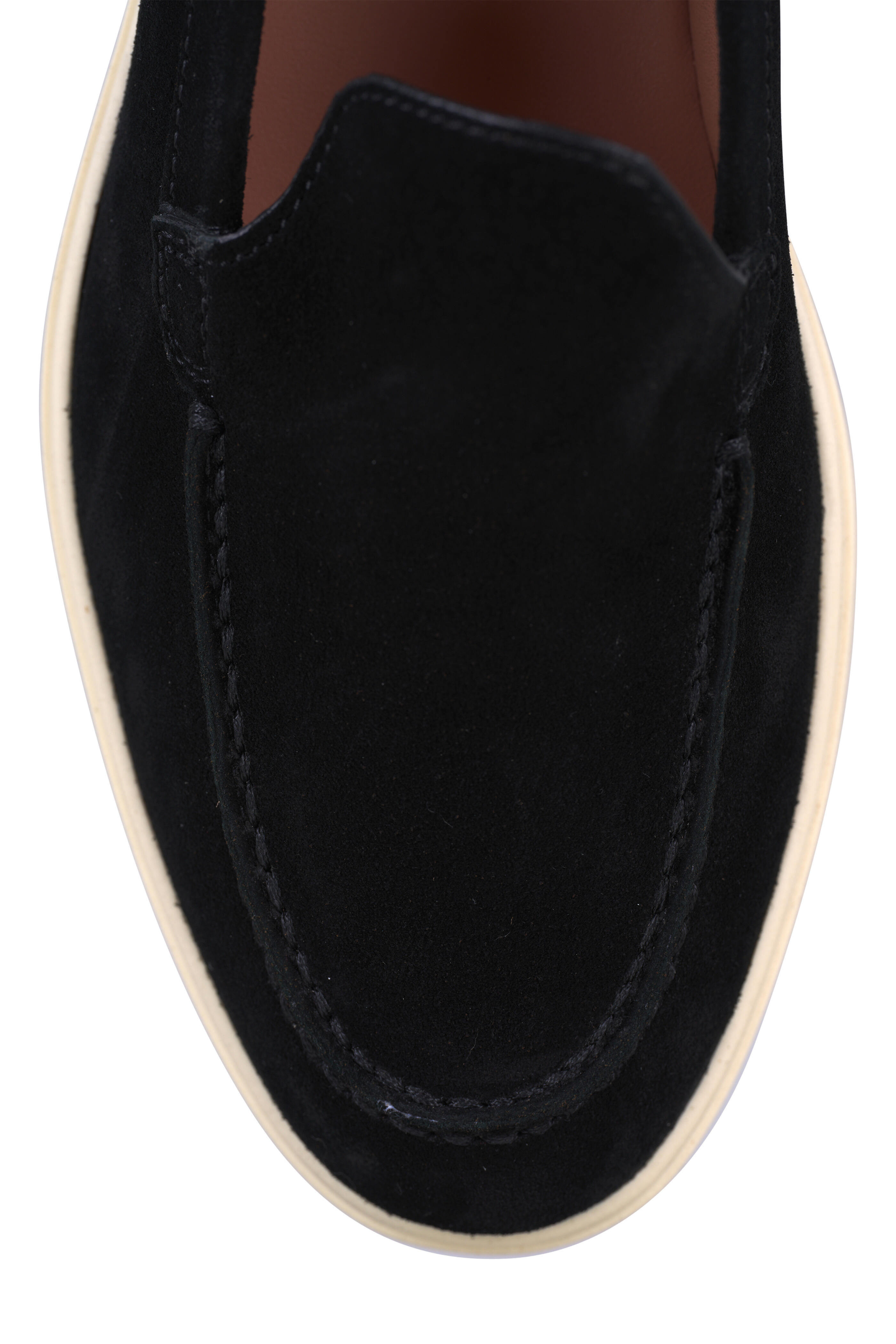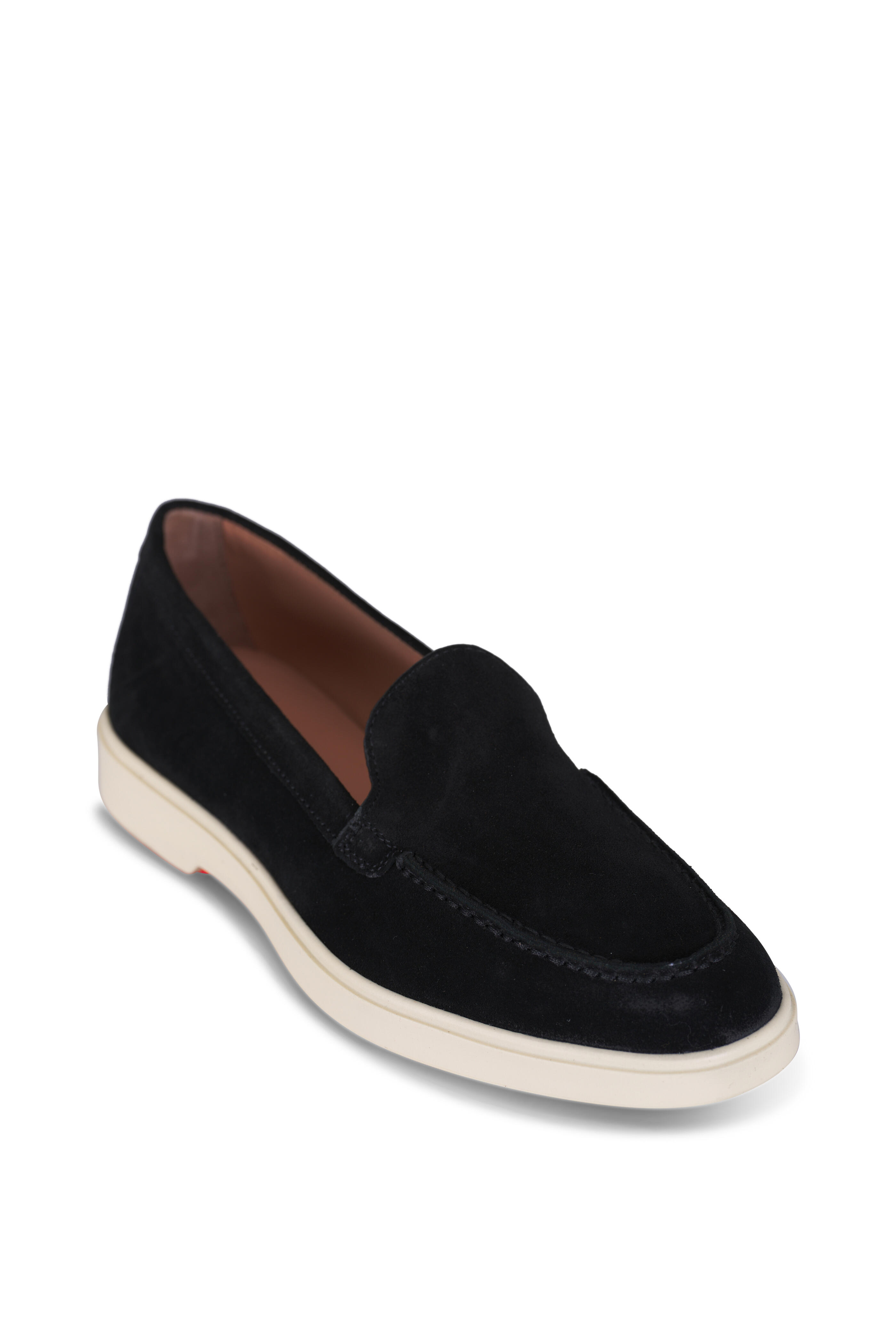 Suede upper. Tapered round toe. Slip on style. Apron stitching. Leather lining and insole. Rubber sole. Made in Italy.