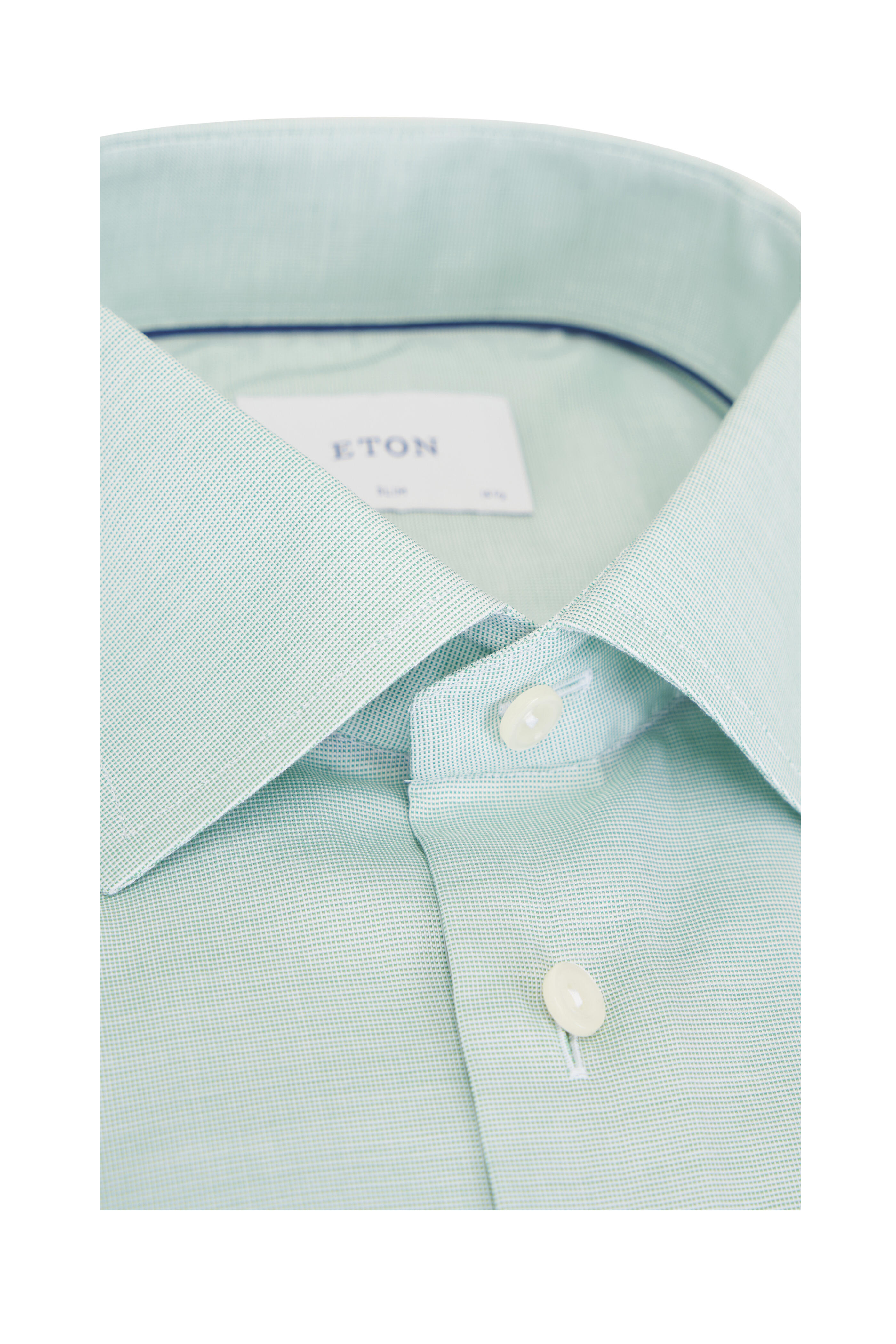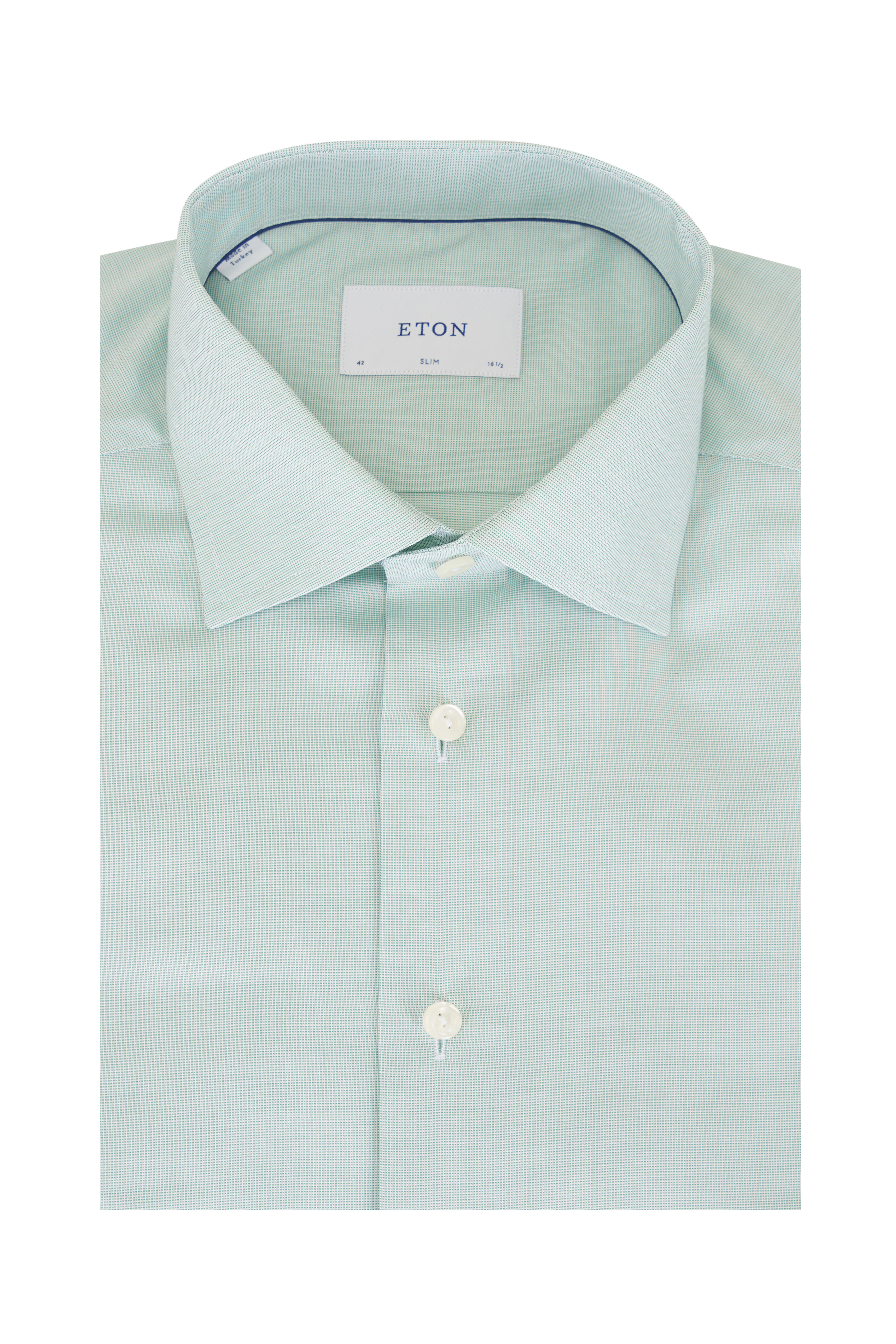 Spread collar. Front button placket. Single button mitered cuffs. Imported. Slim fit. 100% Cotton. Machine wash.