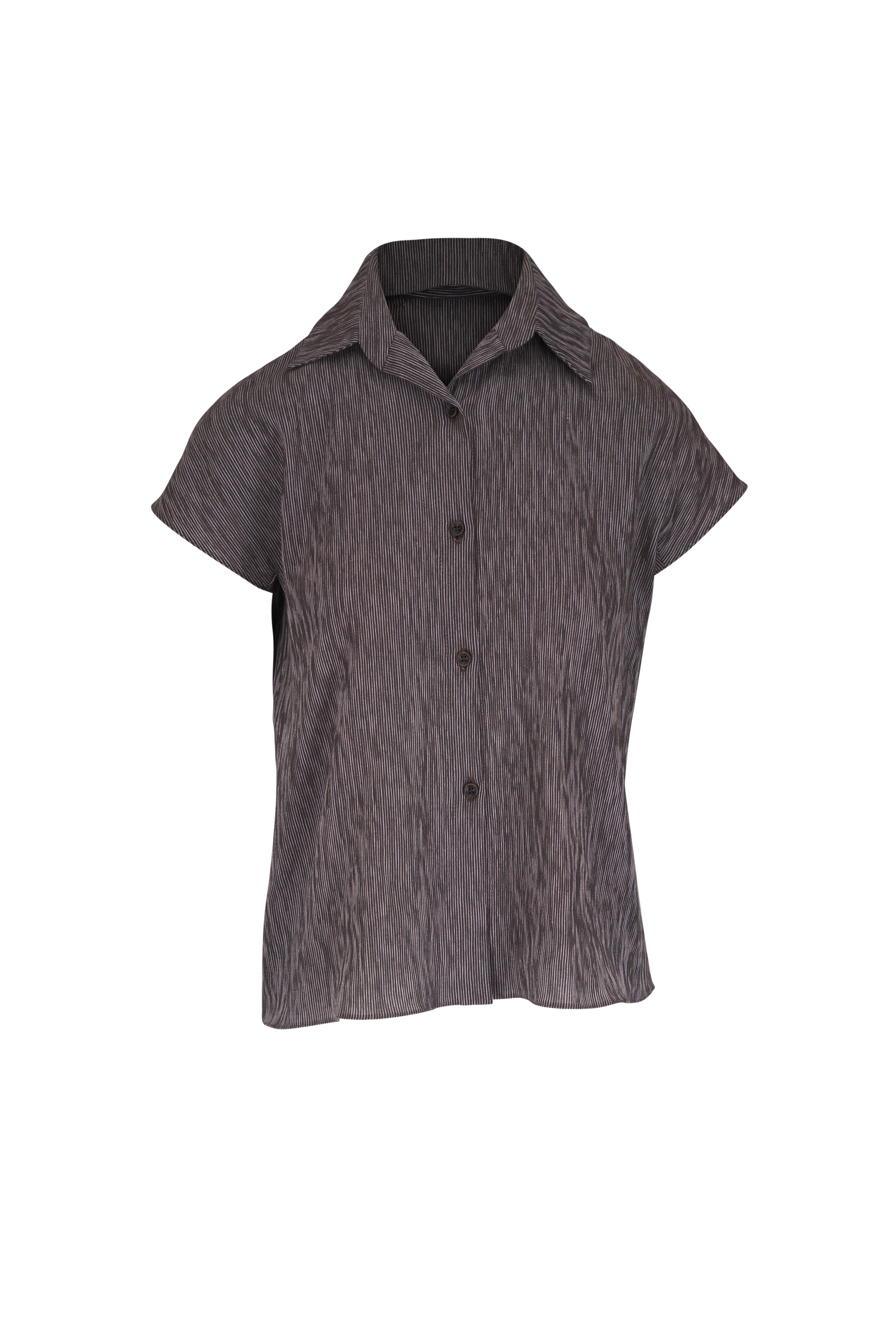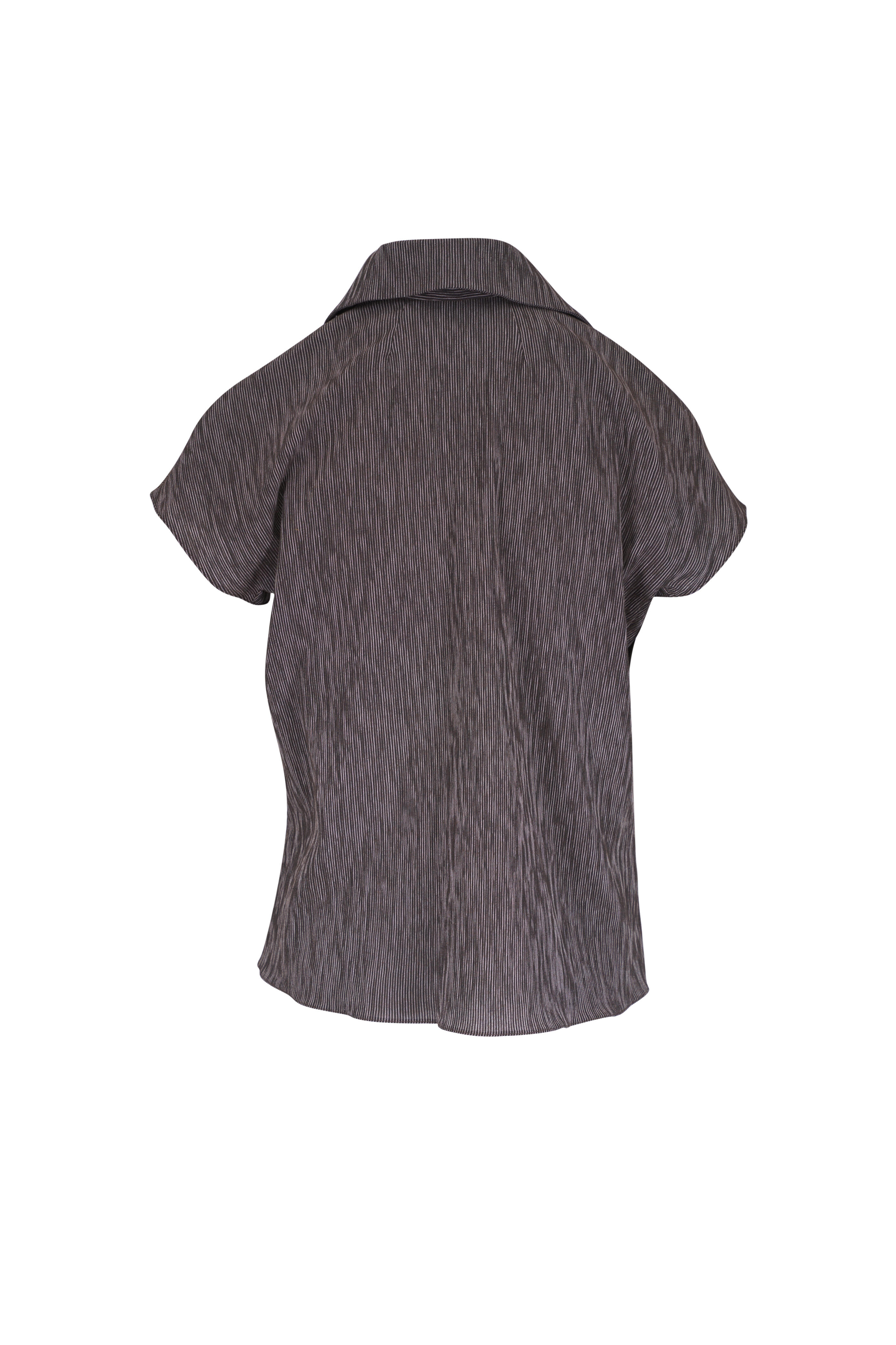 Spread collar. Front button placket. Made in USA. 100% cotton. Dry clean.