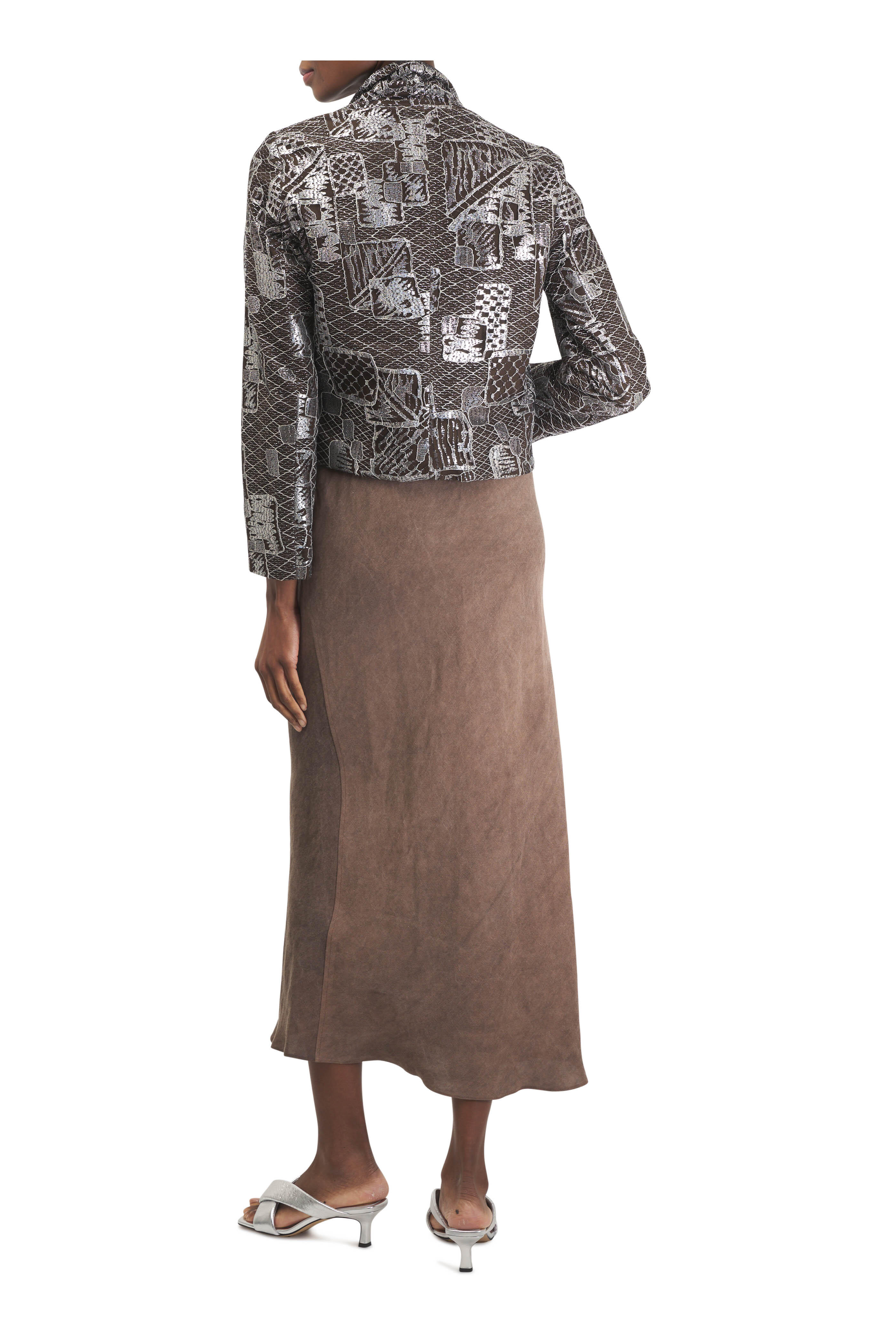 V-neckline; v-back. Pull over style. Made in USA. 56" shoulder to hem. 64% viscose, 36% linen. Dry clean.