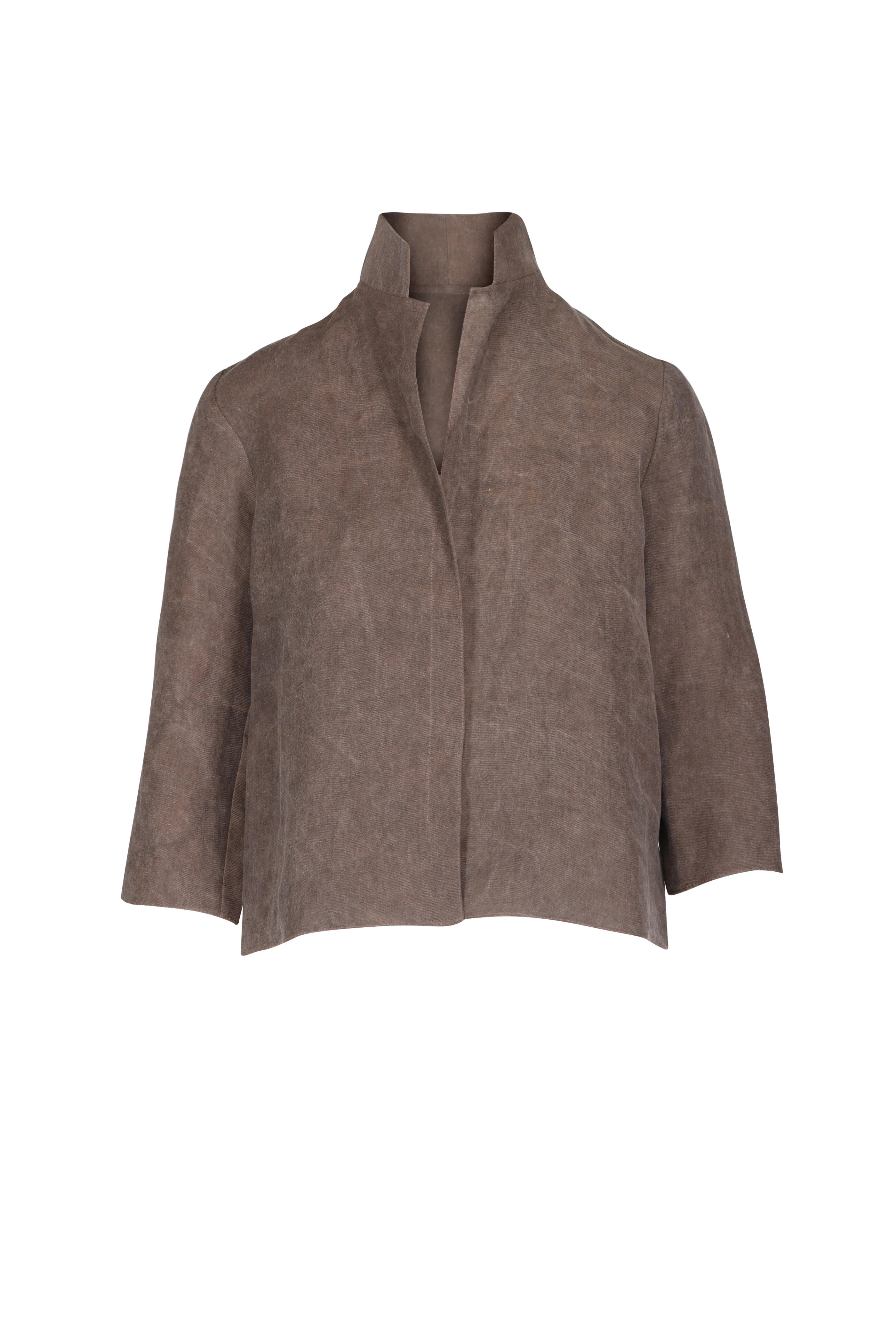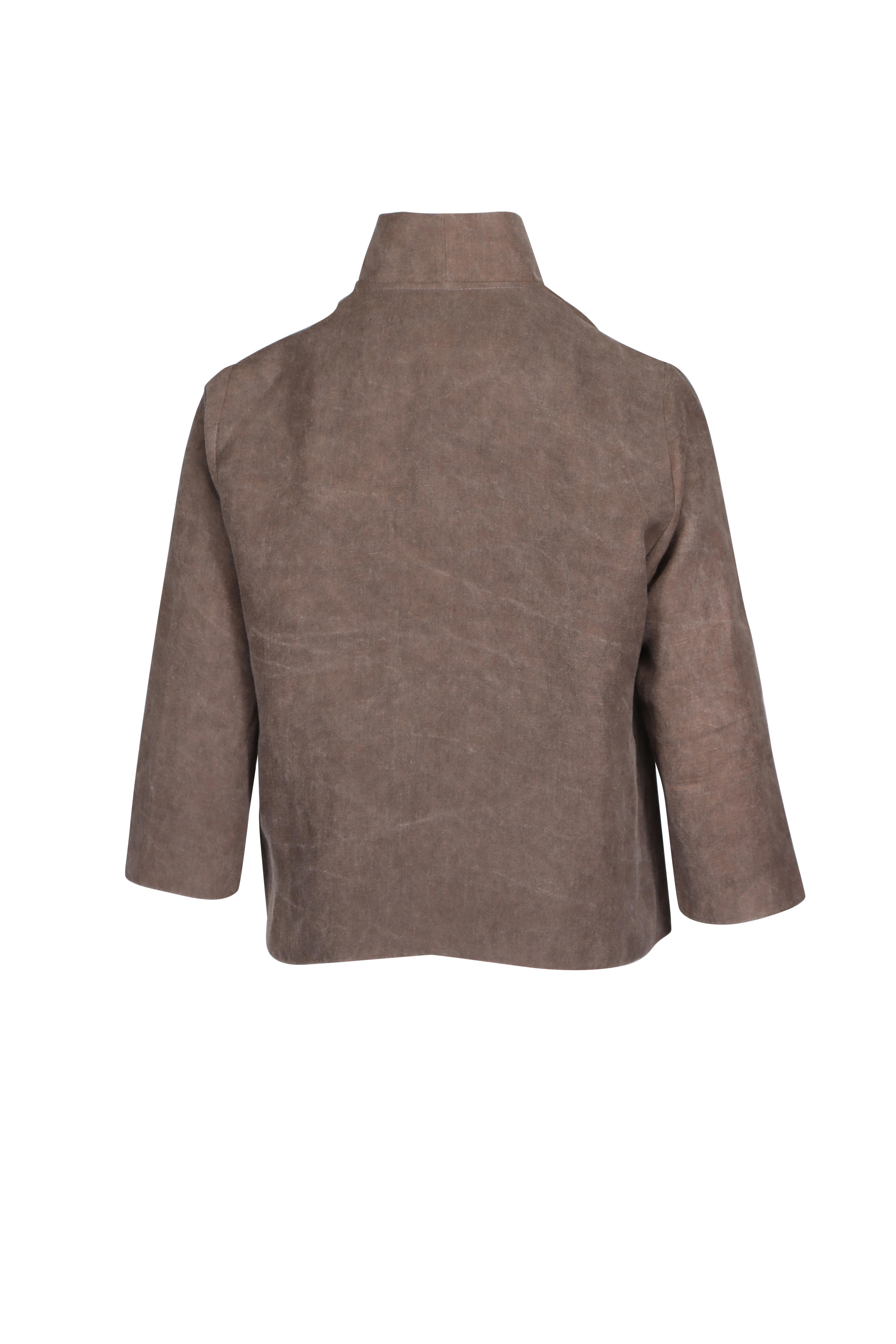 Notch collar. V Neck. ¾ length sleeves. Center front foldover detail. Relaxed fit. Straight hem. Made in USA. 64% Viscose, 36% linen. Dry clean.