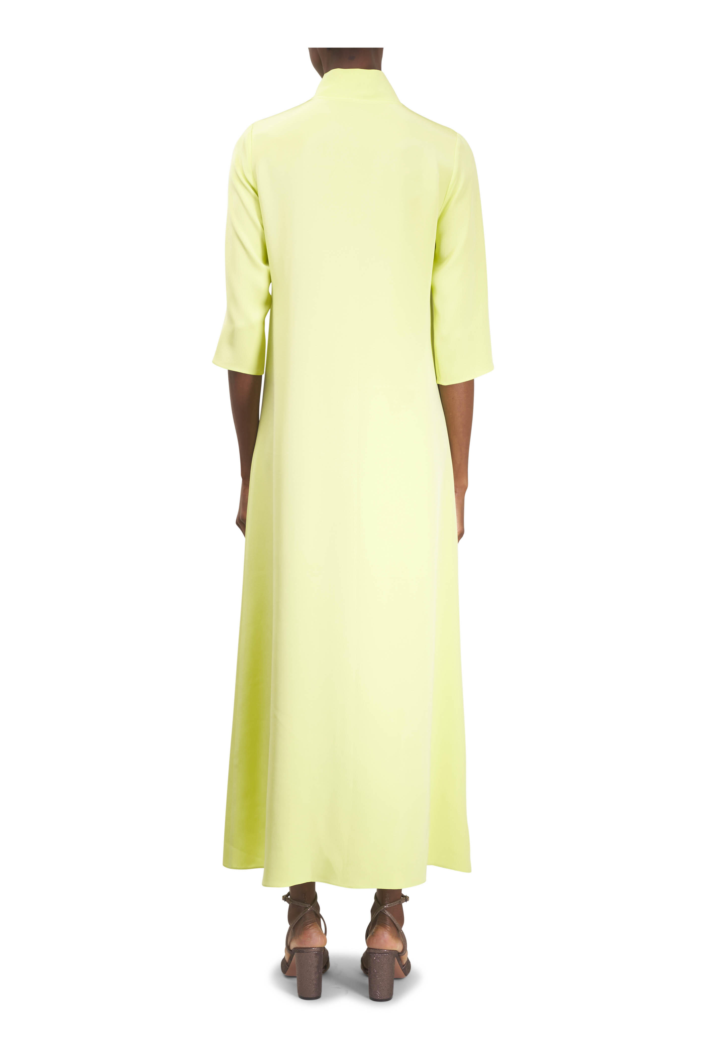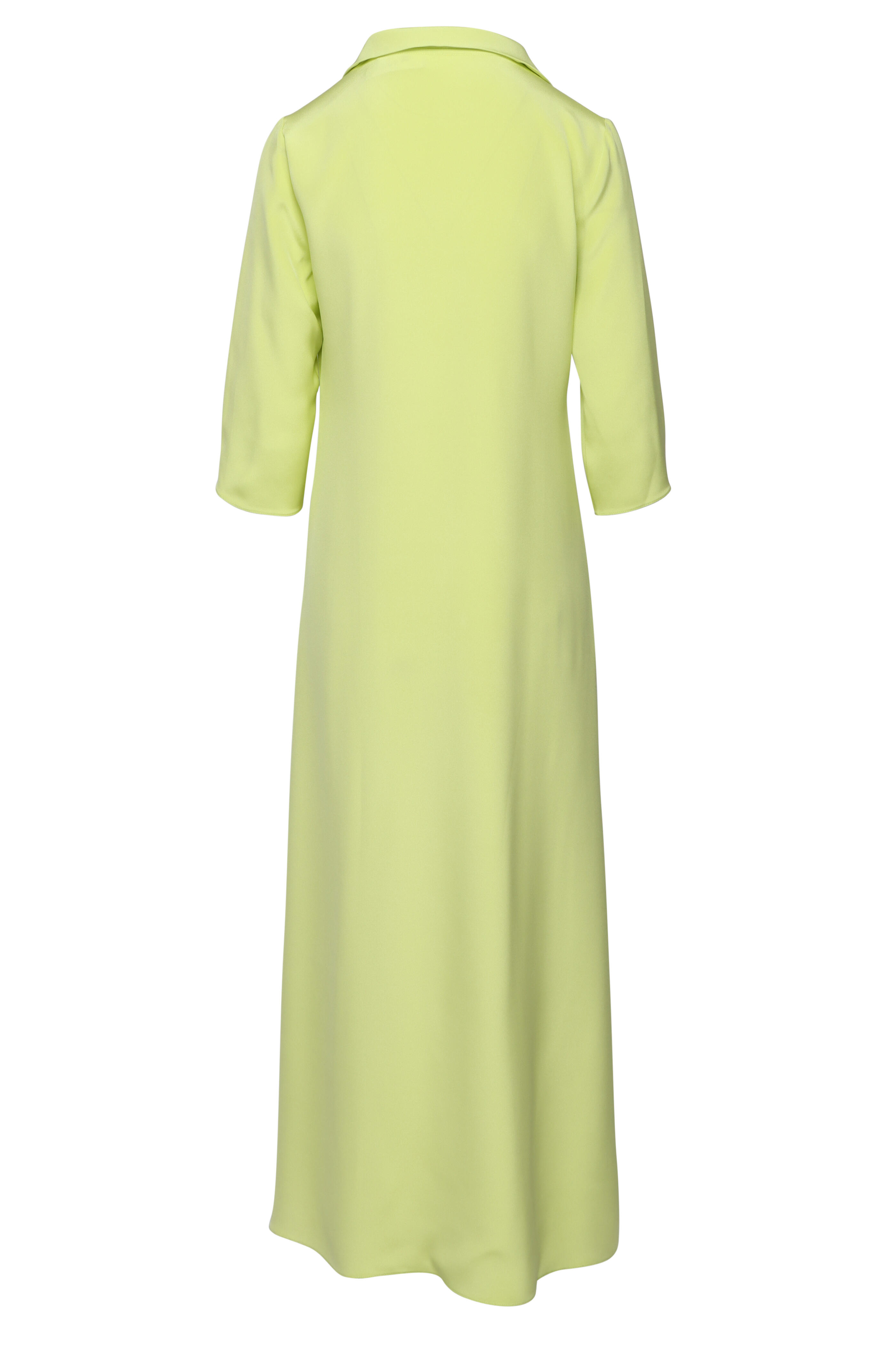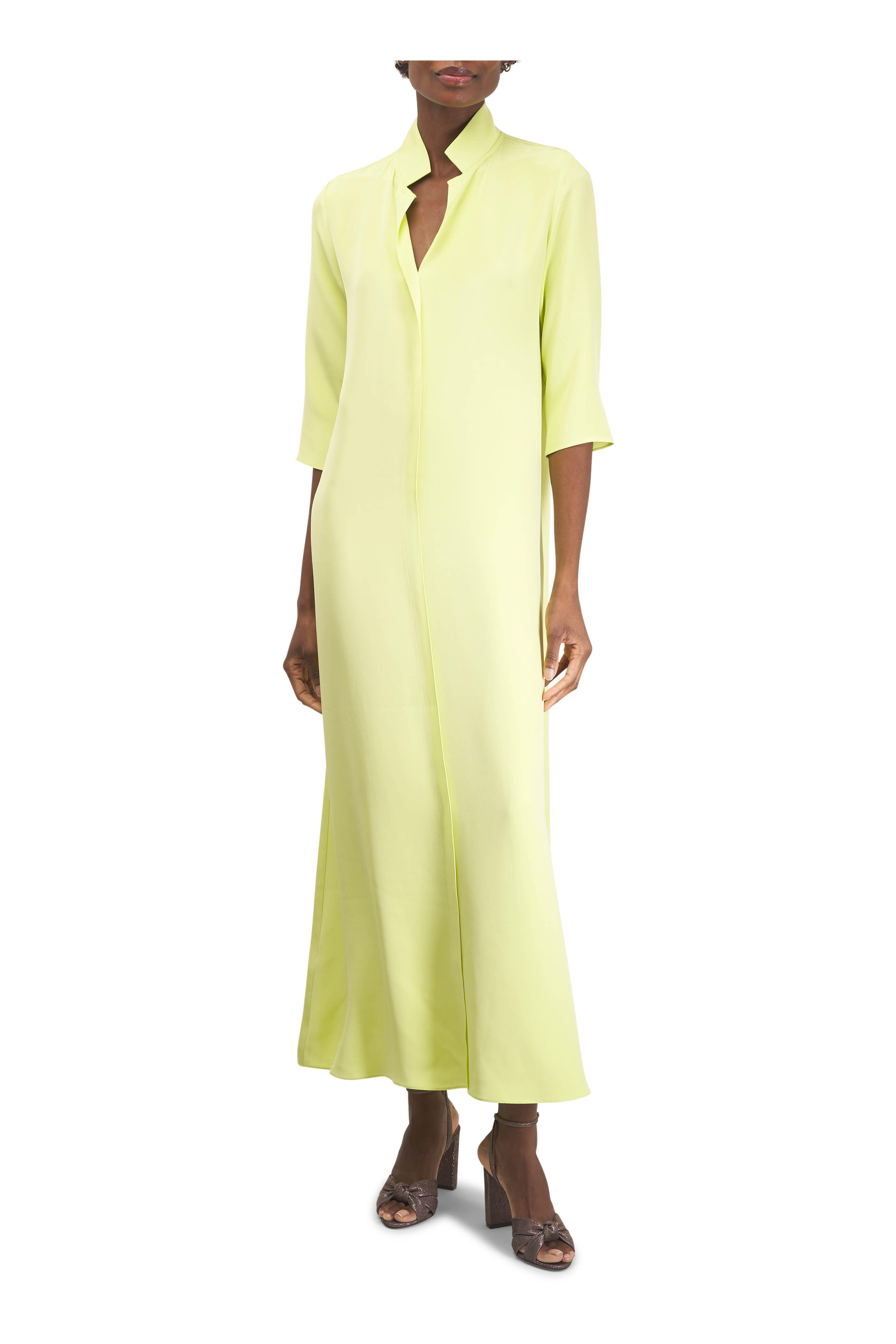 Notch collar. V neckline. ¾ length sleeves. Center front foldover detail. Made in USA. Maxi length. Relaxed fit. 100% silk. Dry clean.