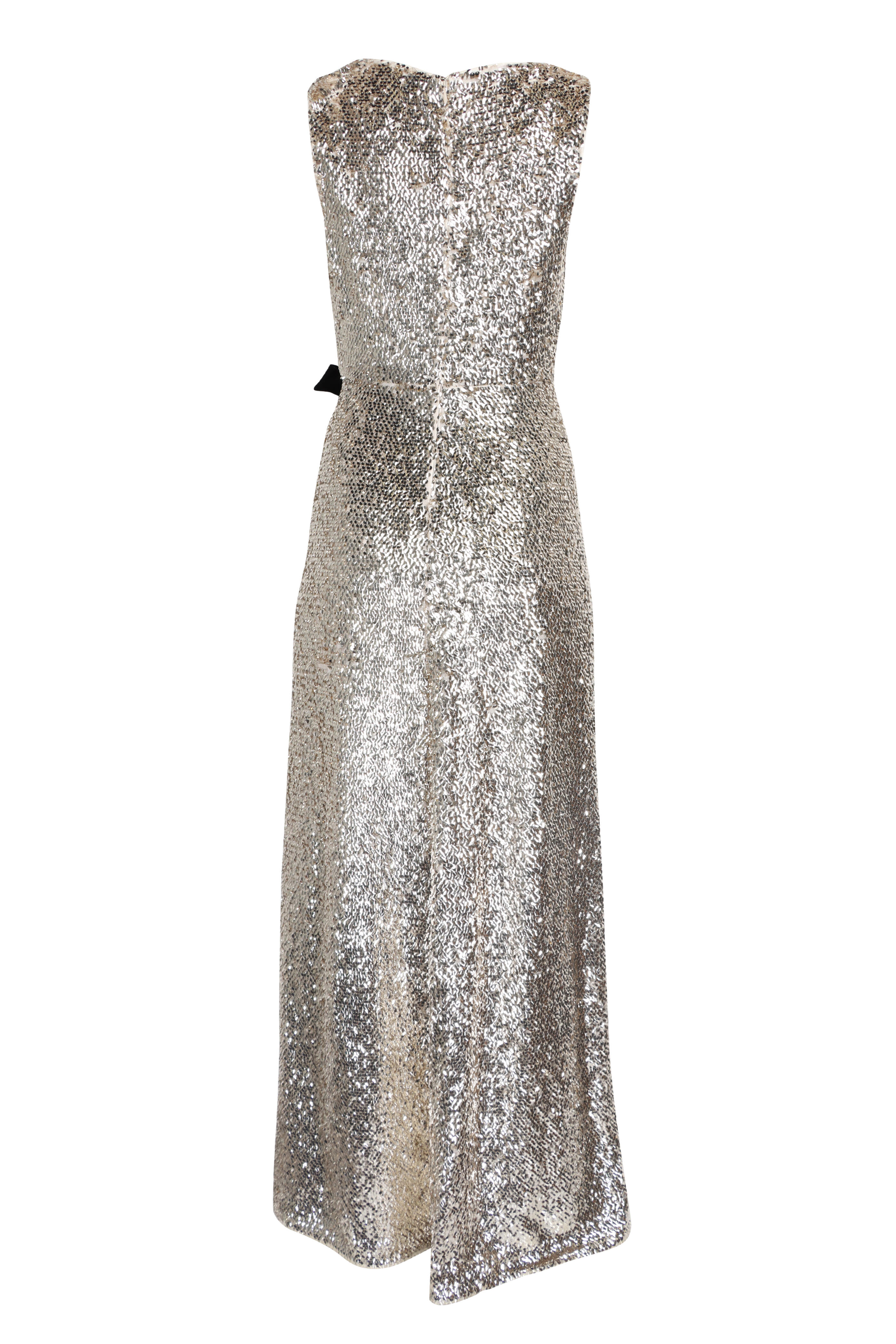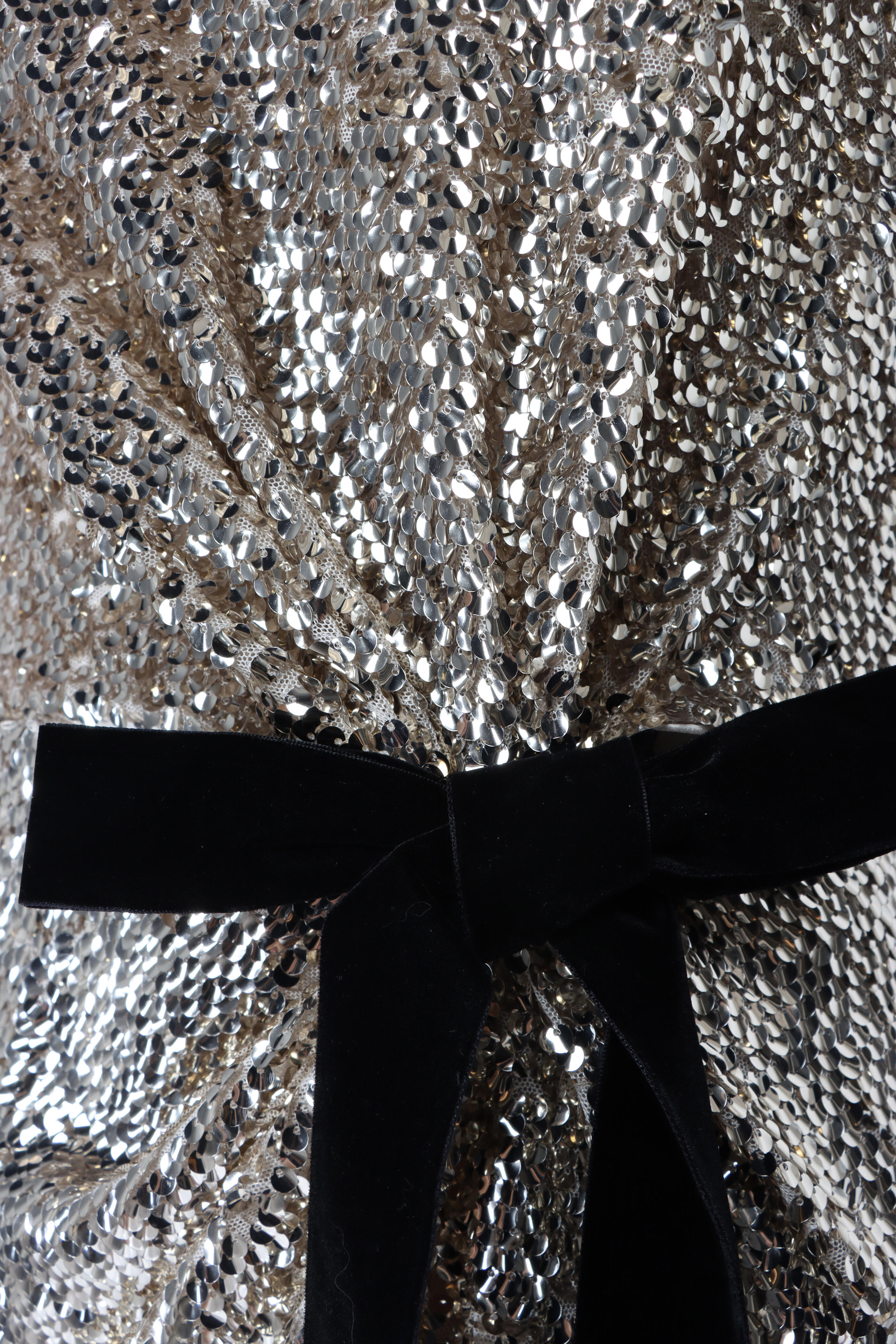 Boatneck. Sleeveless. Concealed back zip closure. Contrast velvet bow detail. Straight silhouette. Sequin fabrication throughout. Imported. Full length. 95% polyester, 5% spandex outer, 100% polyester lining. Dry clean.