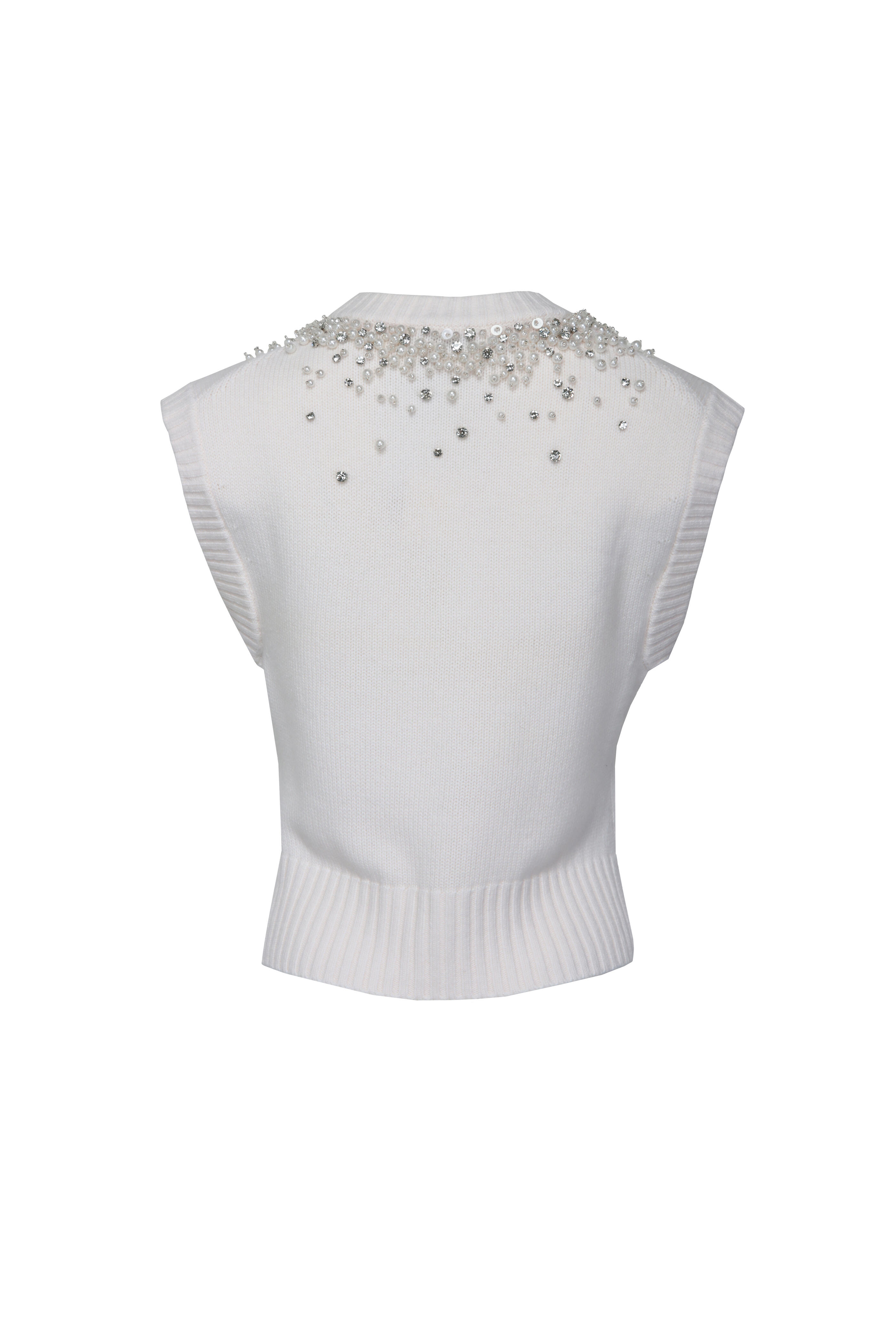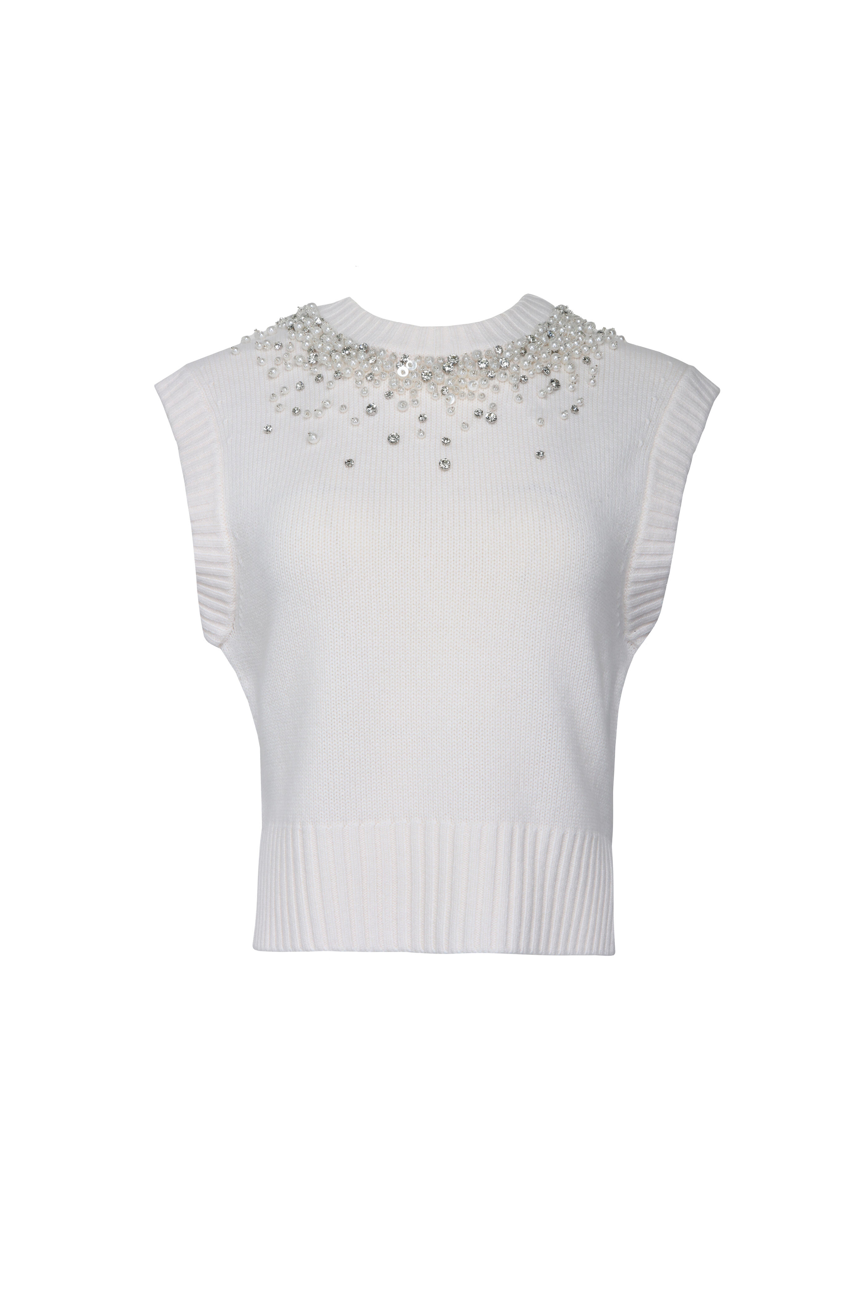 Crewneck. Short cap sleeves. Embellished detail at chest and back. Ribbed neck, cuffs, and hem. Relaxed fit. Imported. 89% wool, 10% cashmere, 1% nylon. Dry clean.