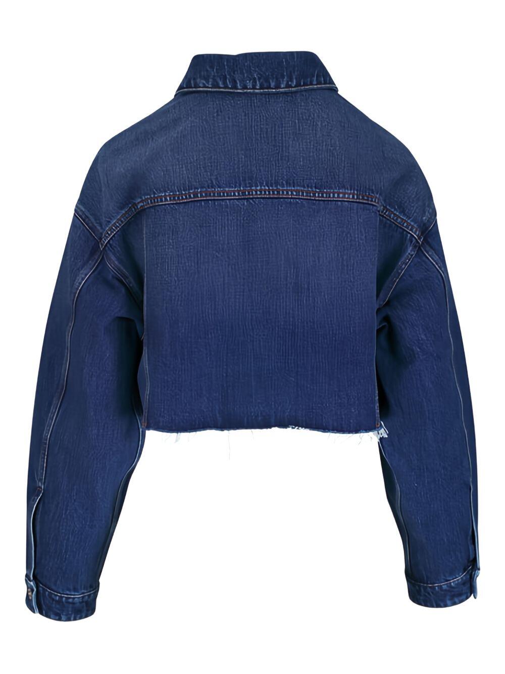 Spread collar. Front button placket. Button cuffs. Chest button flap pockets. Embroidered logo. Raw edge hem. Contrasting top-stitching. Imported. Cropped. 100% cotton. Hand wash.