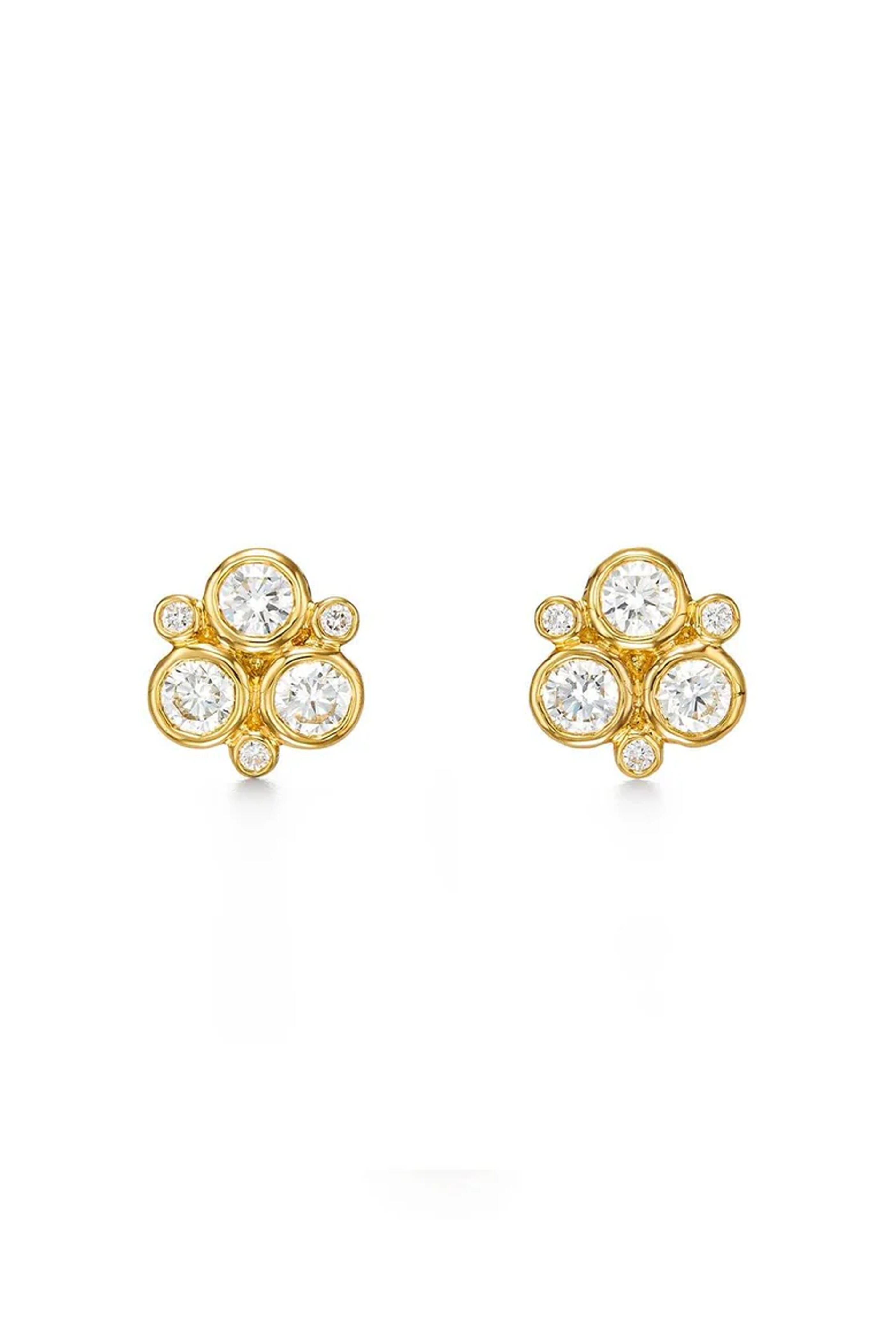 18k gold. Diamond 1.02 total carat weight. Round, brilliant cut diamonds. Cluster design. Gold bezel. Stud style. Push back post. Made in Italy. Length: 0.40”. Width: 0.30”.