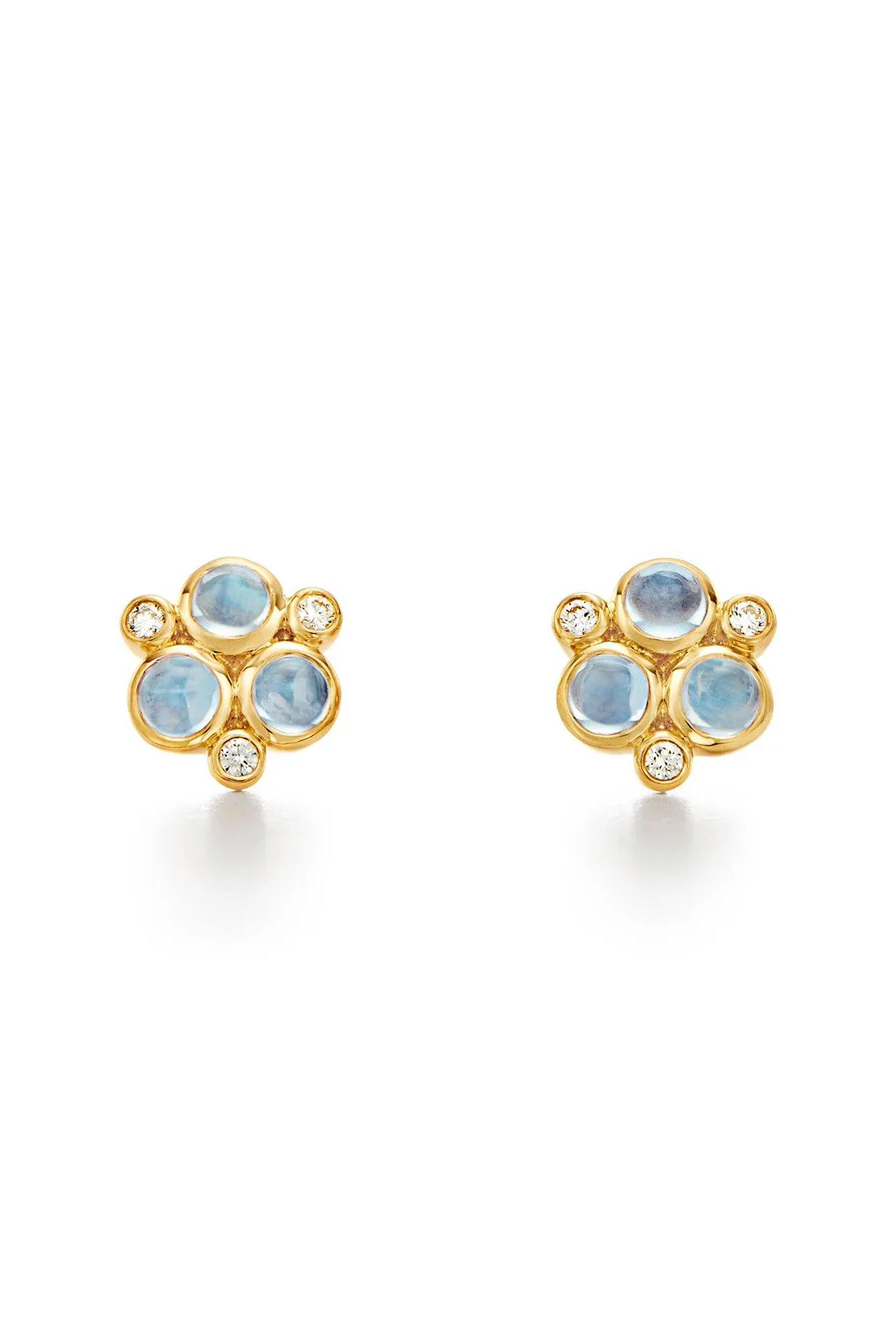 18k gold. Diamond 0.29 total carat weight. Blue moonstone 1.80 total carat weight. Round cabochon cut gemstones. Cluster design. Gold bezel. Stud style. Push back post. Made in Italy. Length: 0.30”. Width: 0.30”.