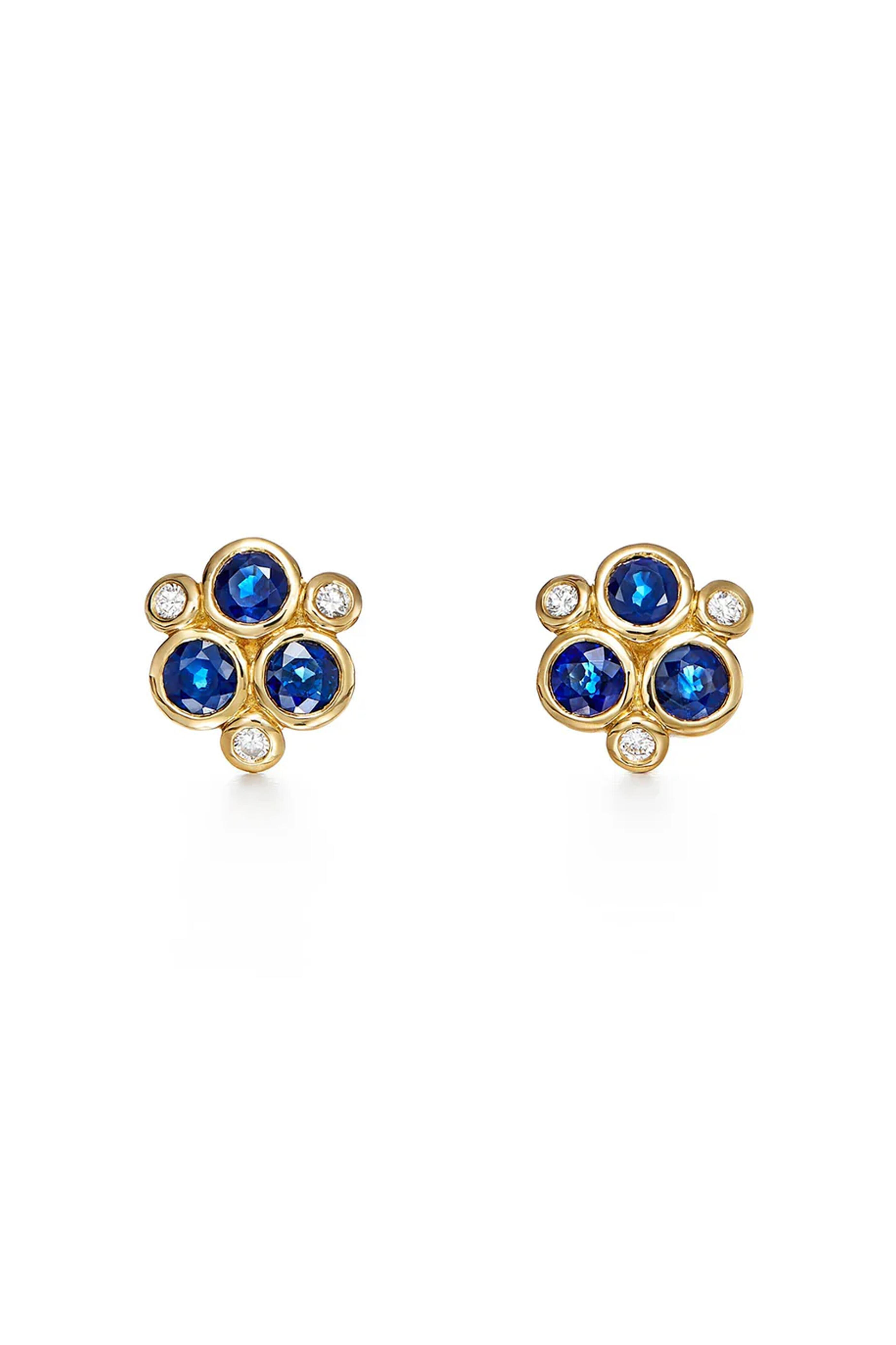 18k gold. Diamond 0.20 total carat weight. Blue sapphire 2.16 total carat weight. Round faceted cut gemstones. Cluster design. Gold bezel. Stud style. Push back post. Made in Italy. Length: 0.40”. Width: 0.40”.