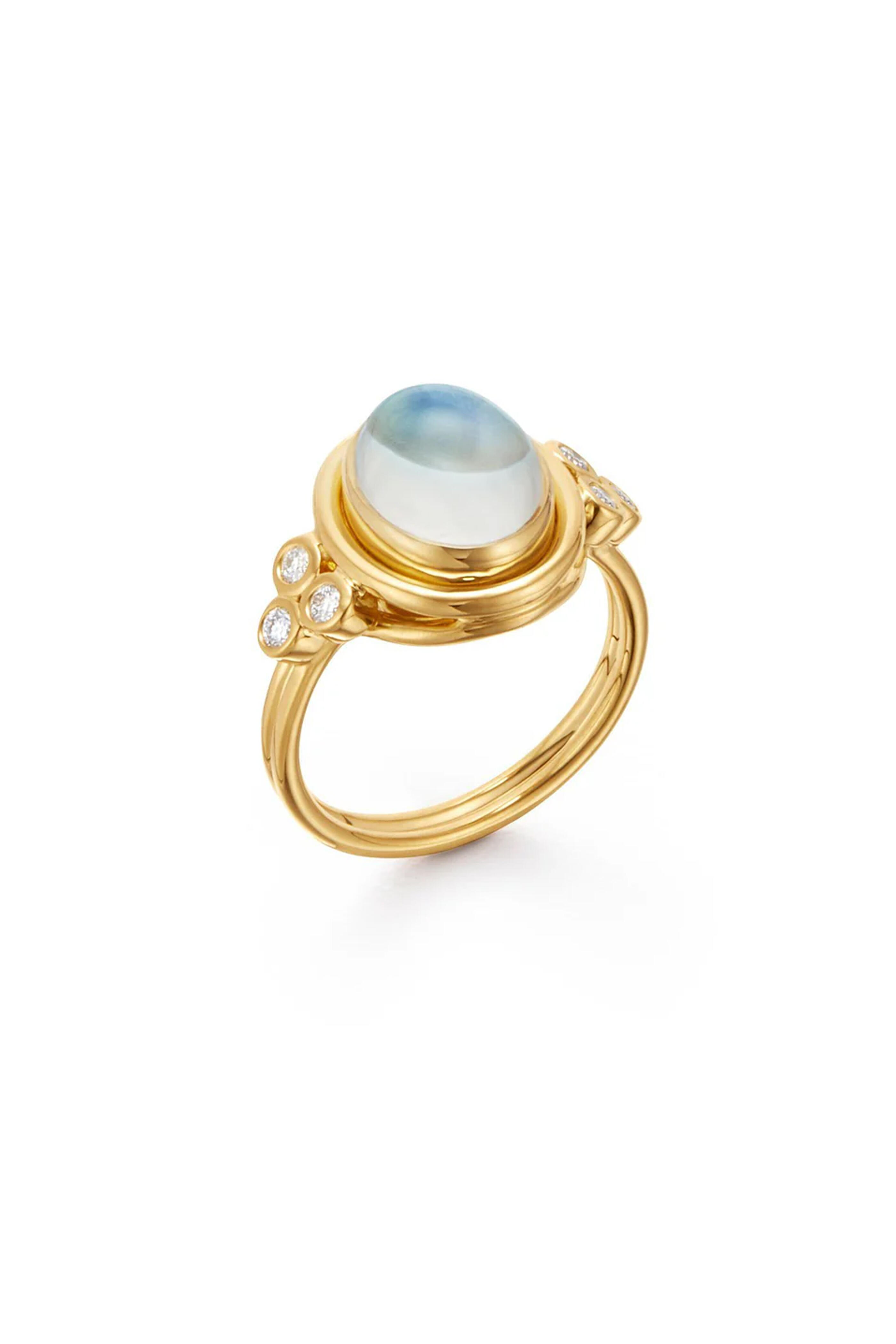 18k gold. Diamond 0.20 total carat weight. Blue moonstone 2.75 total carat weight. Three small white diamond cluster on each side. Oval cut. Double gold bezel. Made in Italy. Call for ring size. Width: 0.5”.