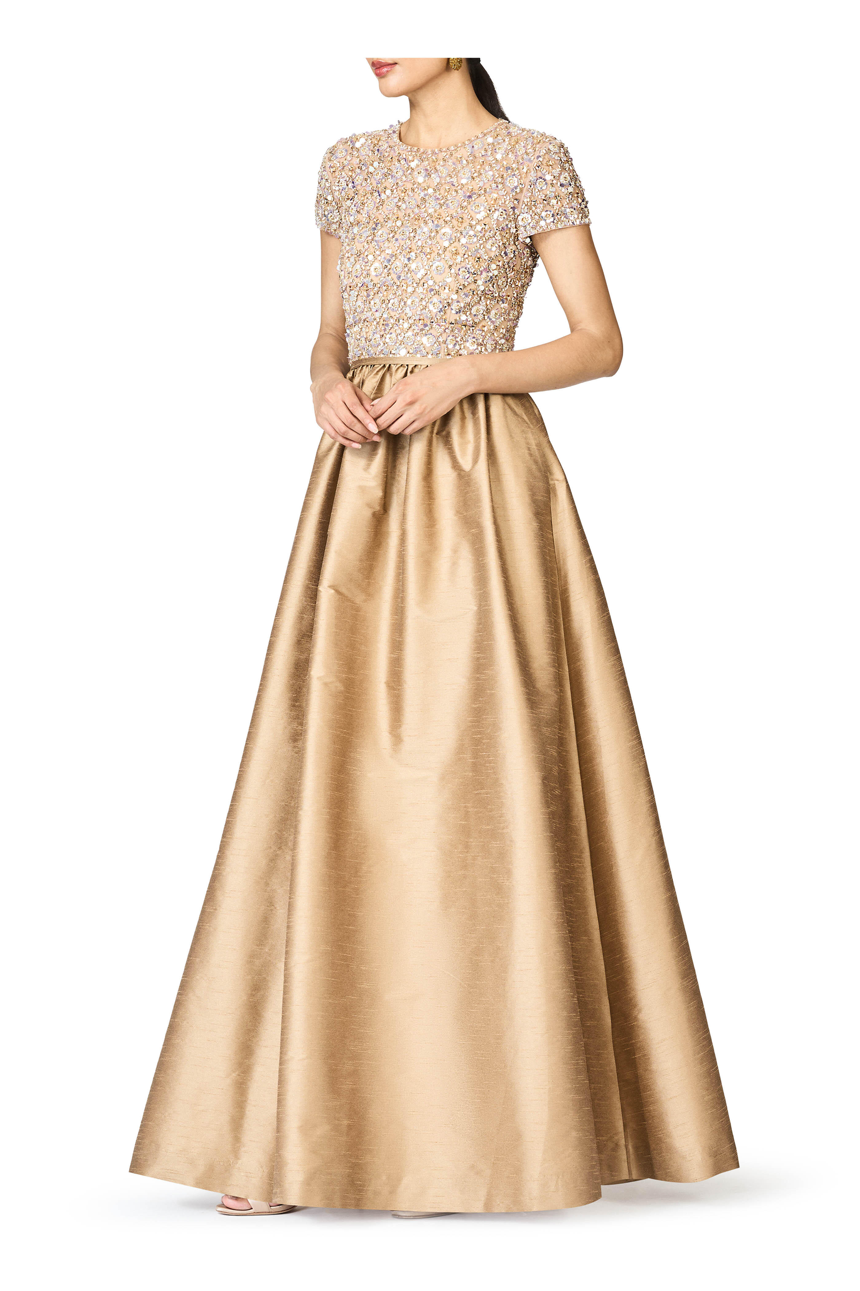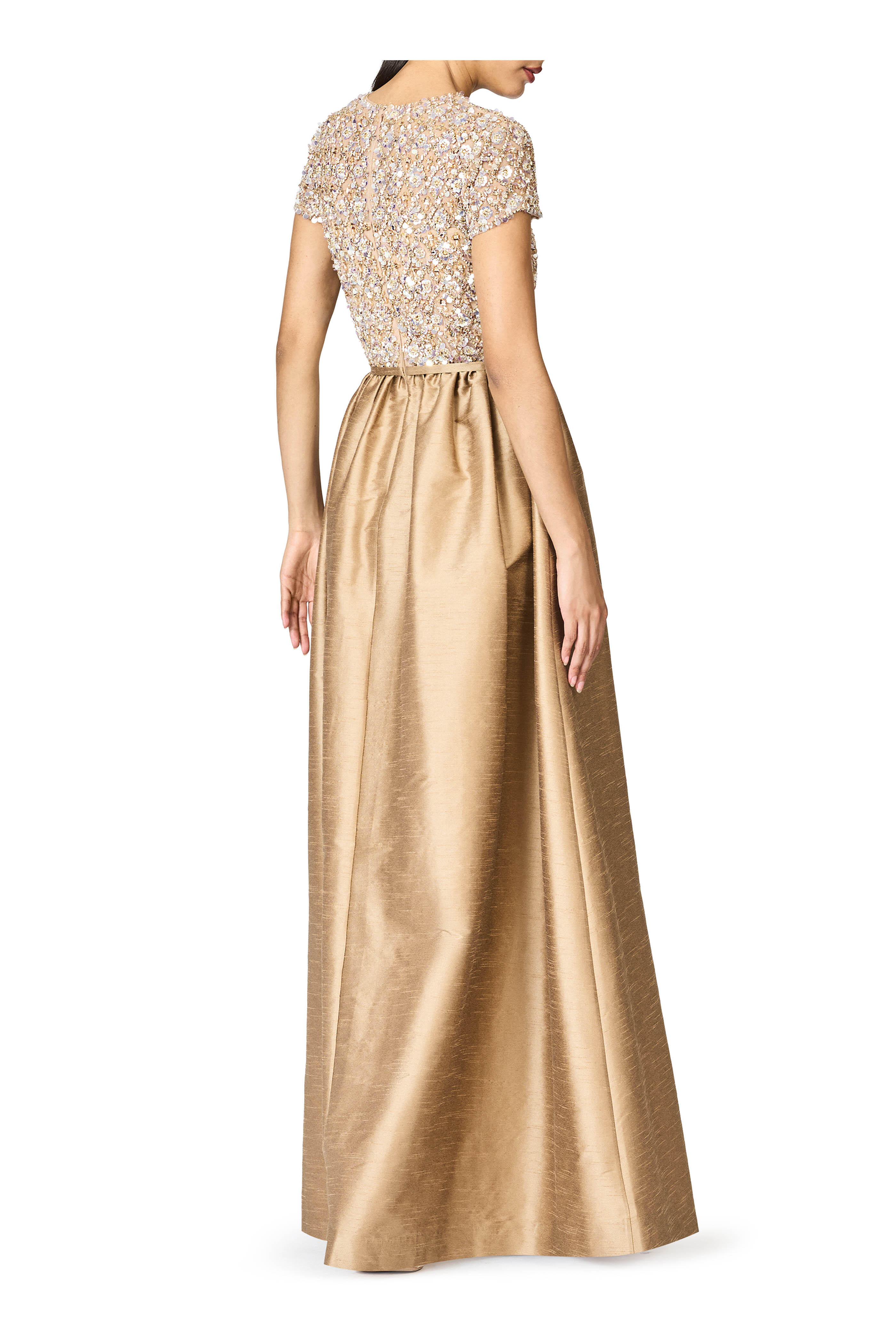 Jewel neckline. Back zip closure. Side slip pockets. Embellished Indian Tulle. Indian Dupioni skirt. Imported. 60.5" shoulder to hem. 100% polyester; fully lined. Dry clean.