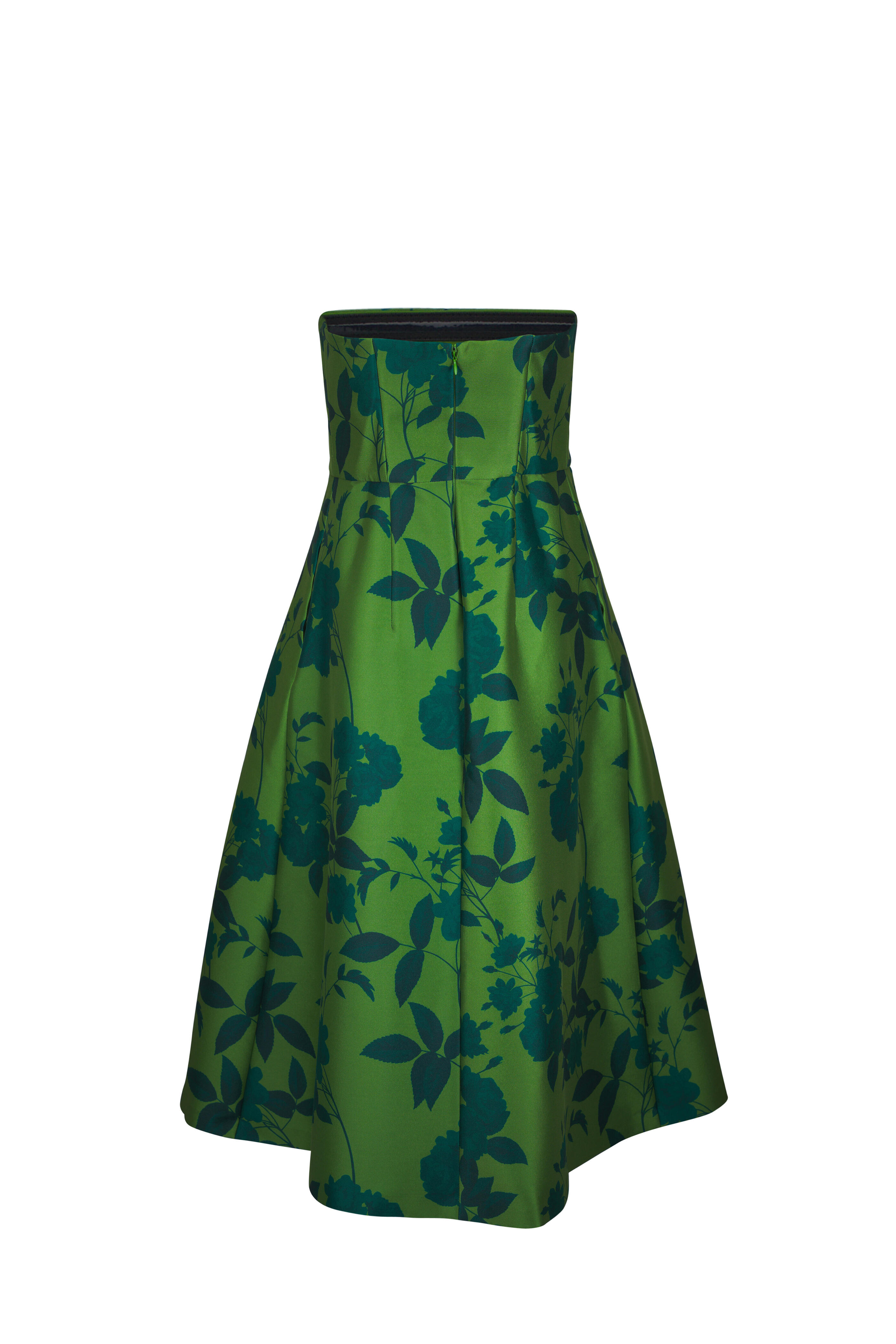 Strapless. Concealed back zip. Side slip pockets. Imported. 50" length from shoulder to bottom hem (size 2). 97% Polyester, 3% Spandex; lined. Dry clean.