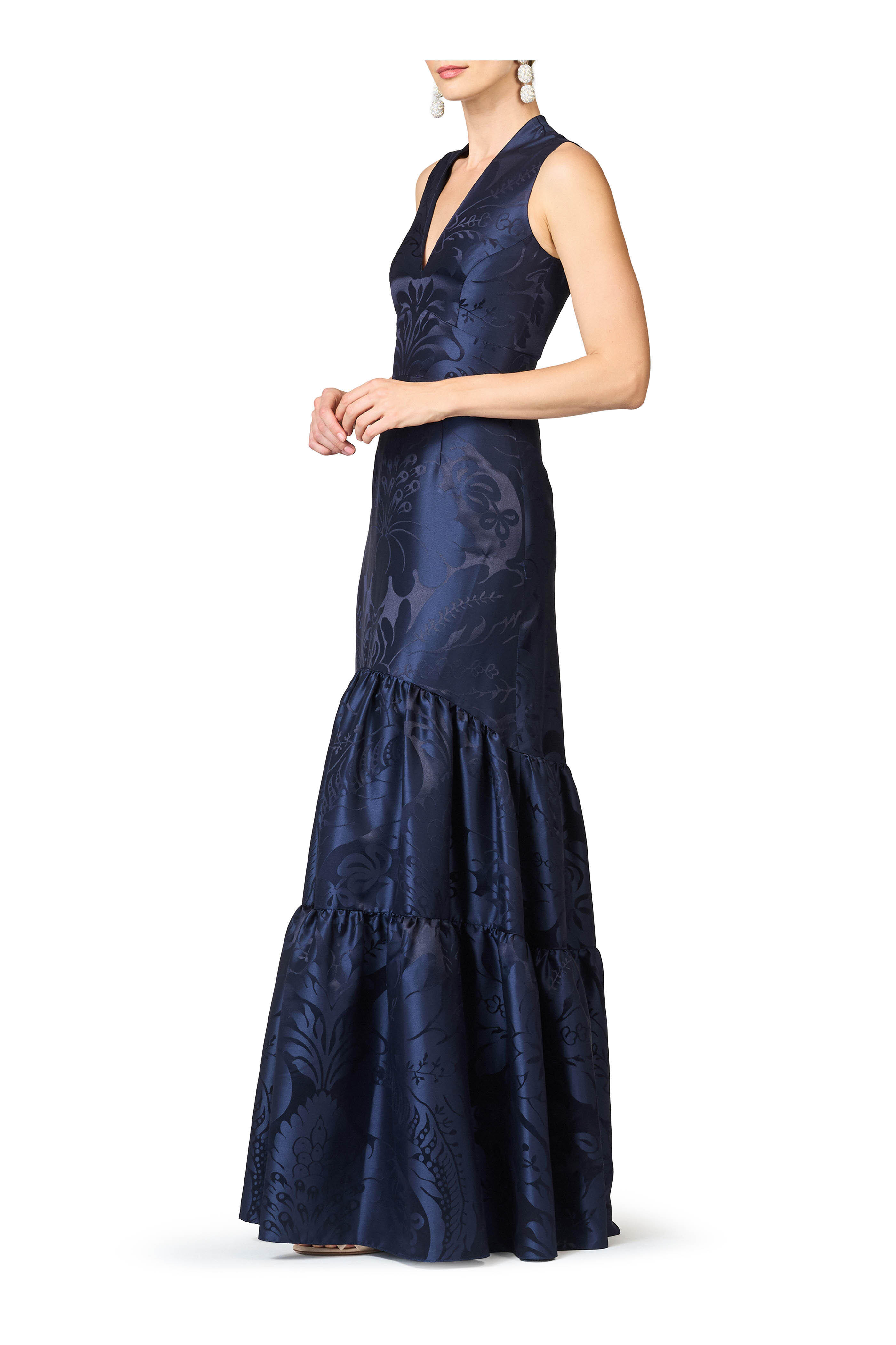 V-neckline. Back zip closure. Damask fabrication. Imported. Floor length. 61 1/2" from top of shoulder to bottom. 55% silk, 45% polyester; fully lined. Dry clean.